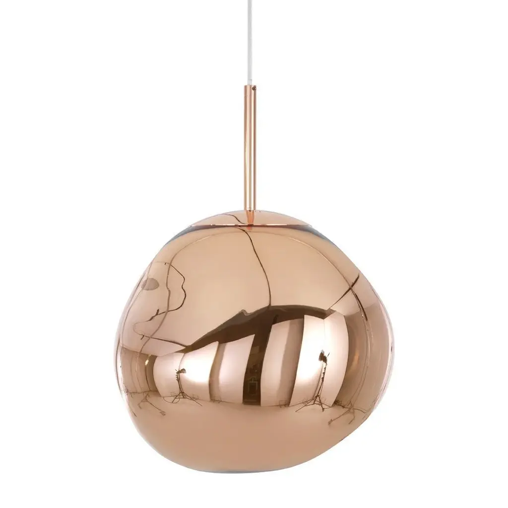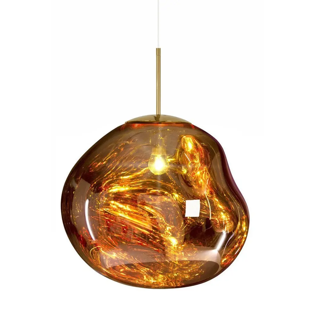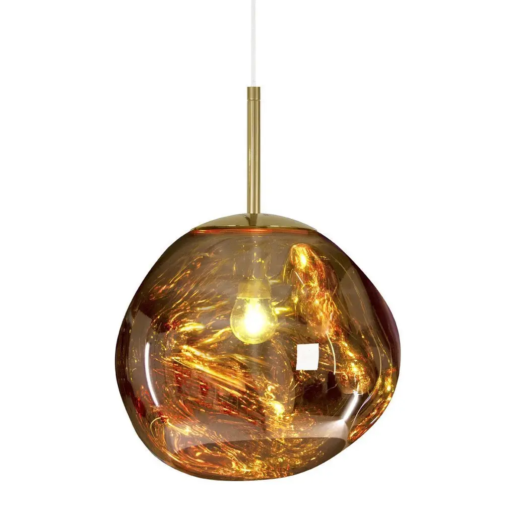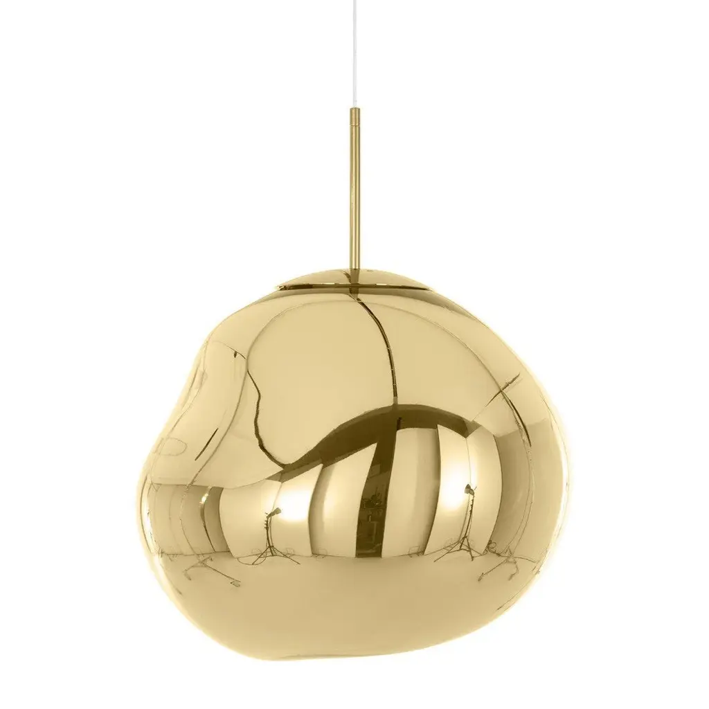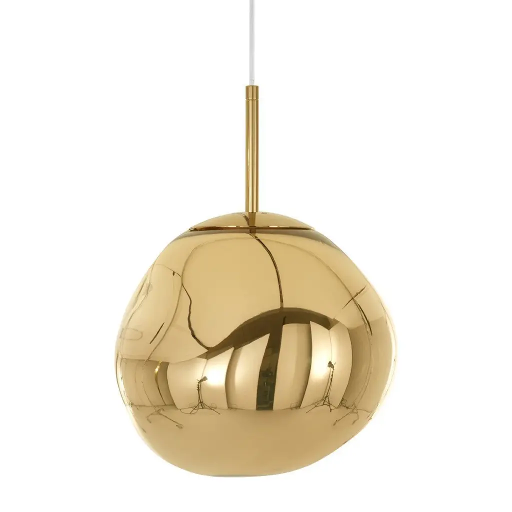 Melt is a beautifully distorted pendant in a modern Gold finish and matching ceiling rose. Featuring our integrated LED module, this ceiling light creates a mesmerizing melting hot-blown glass effect when on and a mirror-finish effect when off. Made in Germany using a high tech manufacturing technique to achieve the perfect melted orb.