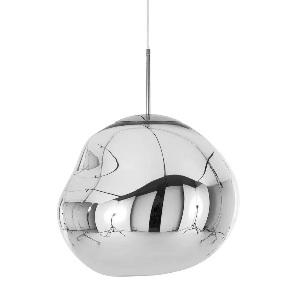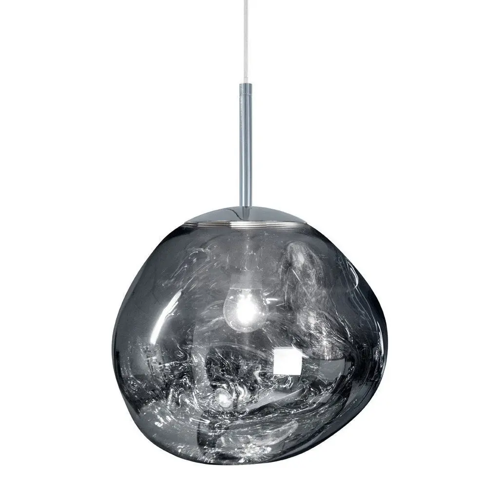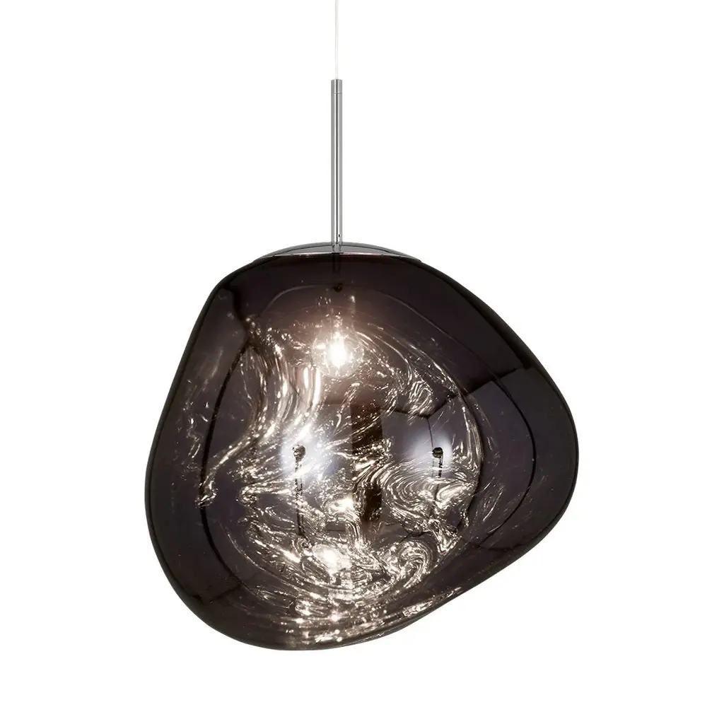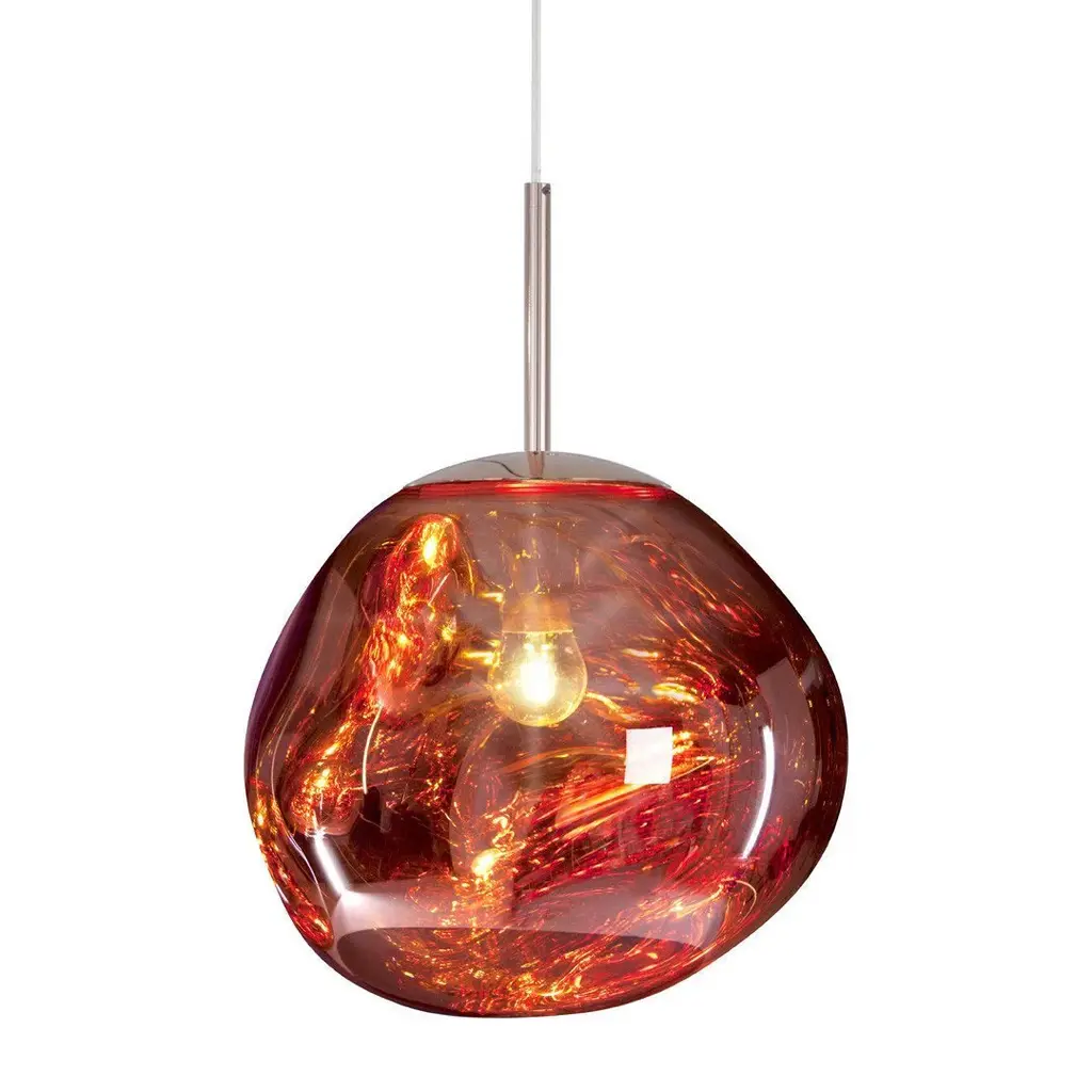 Melt is a beautifully distorted pendant in a modern Gold finish and matching ceiling rose. Featuring our integrated LED module, this ceiling light creates a mesmerizing melting hot-blown glass effect when on and a mirror-finish effect when off. Made in Germany using a high tech manufacturing technique to achieve the perfect melted orb.