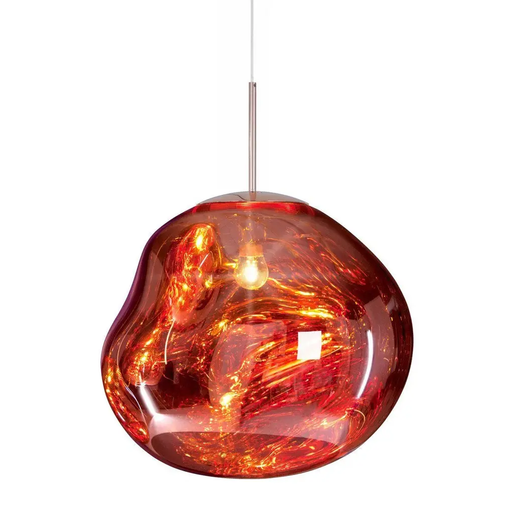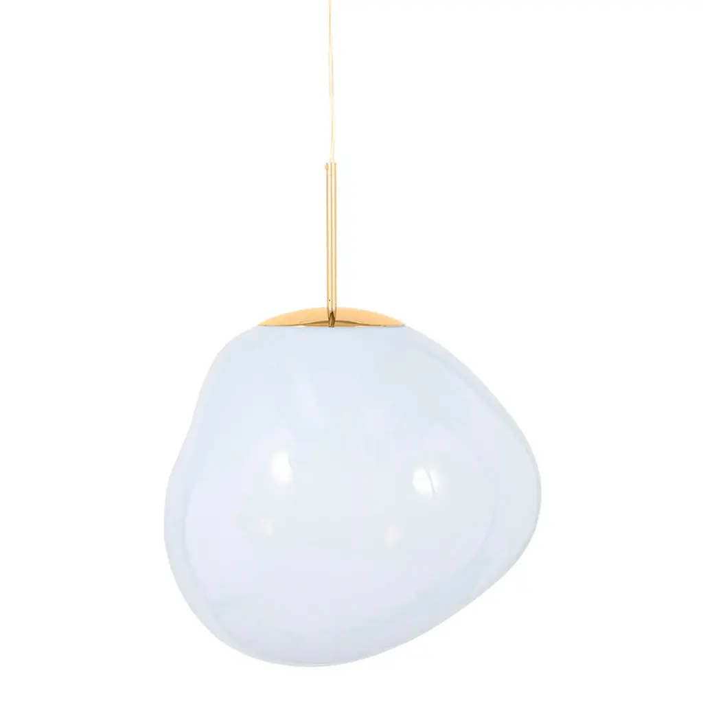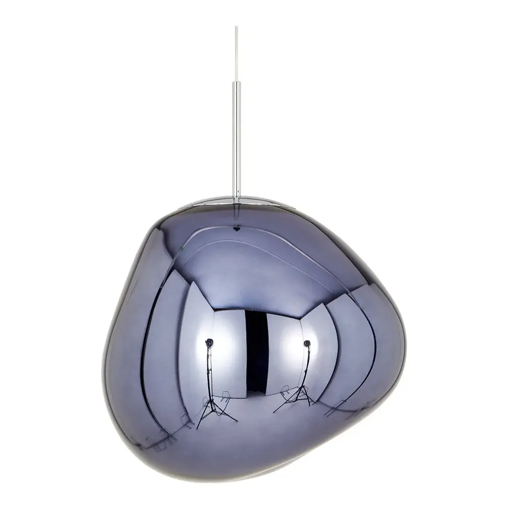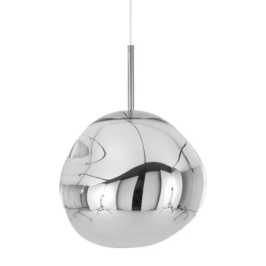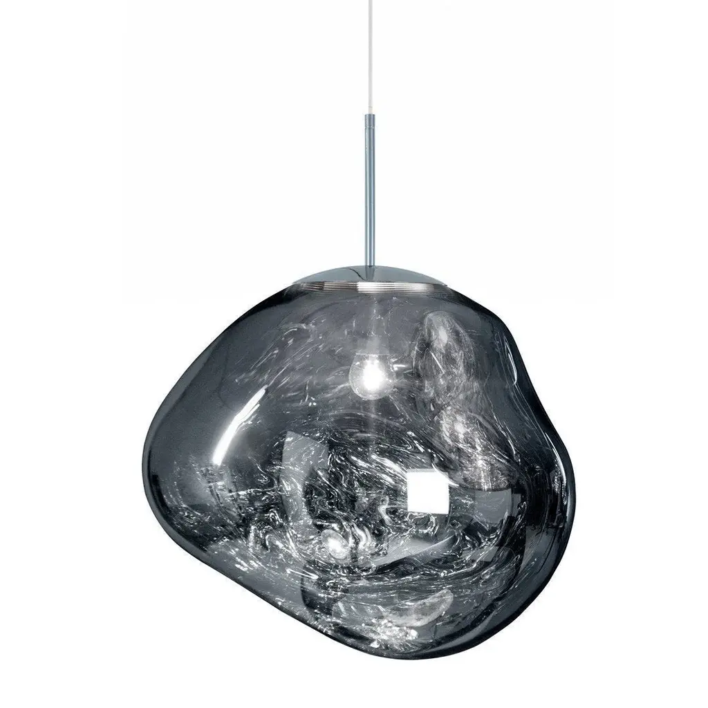 Melt is a beautifully distorted pendant in a modern Gold finish and matching ceiling rose. Featuring our integrated LED module, this ceiling light creates a mesmerizing melting hot-blown glass effect when on and a mirror-finish effect when off. Made in Germany using a high tech manufacturing technique to achieve the perfect melted orb.