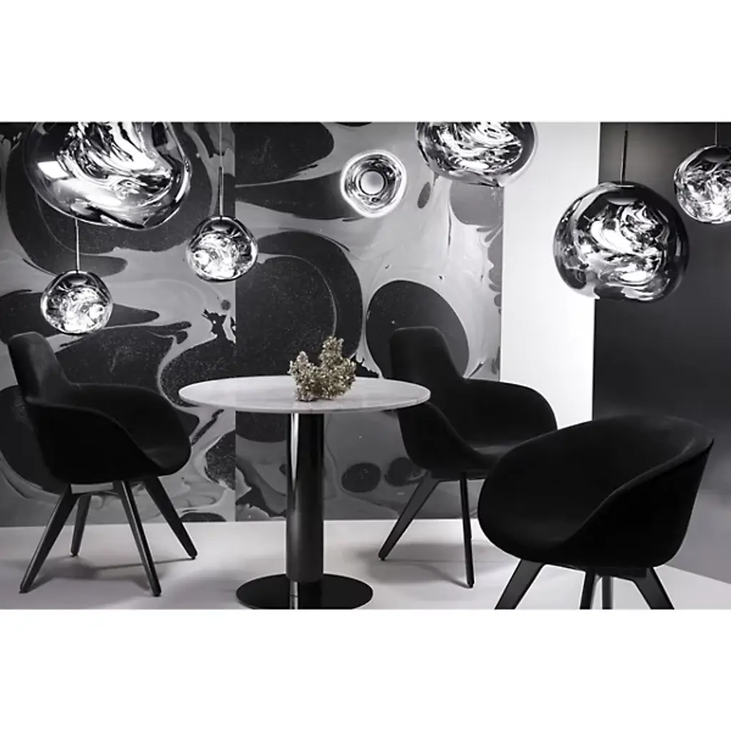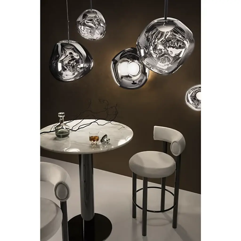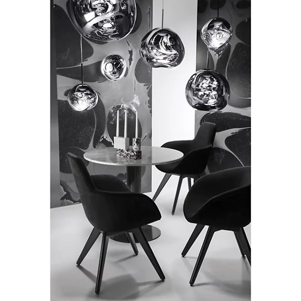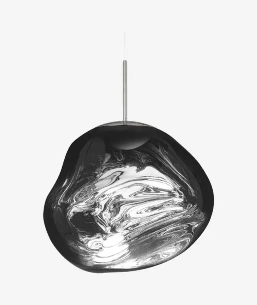 A unique, distorted appearance. The Melt LED Pendant from Tom Dixon has a misshapen form that adds a mesmerizing look to your space. It’s made out of Polycarbonate, and the appearance of its surface was created in conjunction with FRONT (a Swedish design collective) and intended to be reminiscent of molten glass, a melting glacier, or the swirling images of deep space. It comes with an LED ring that shines from behind the glass and fills the room with efficient illumination.