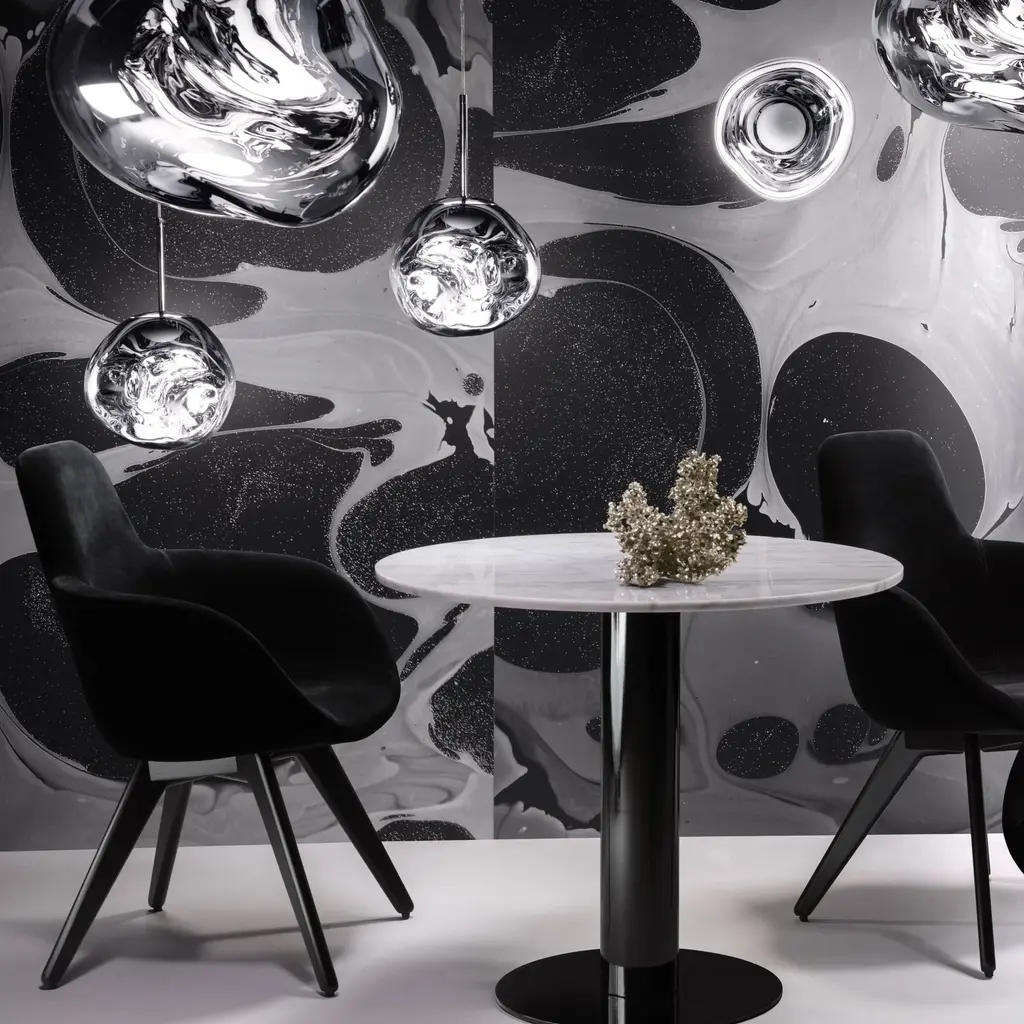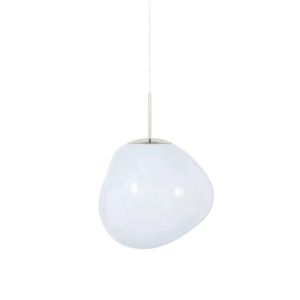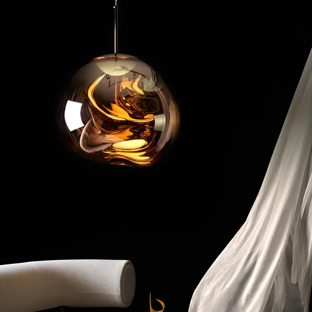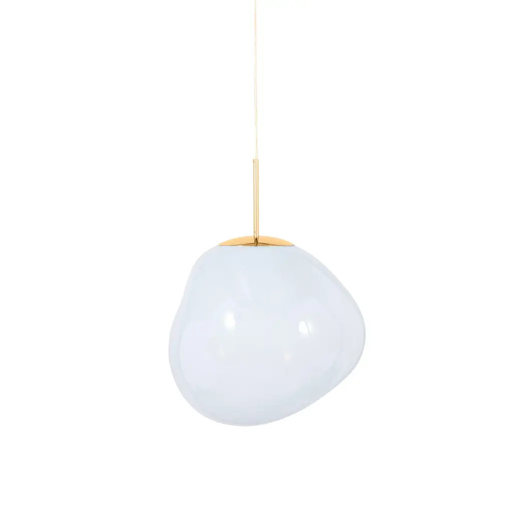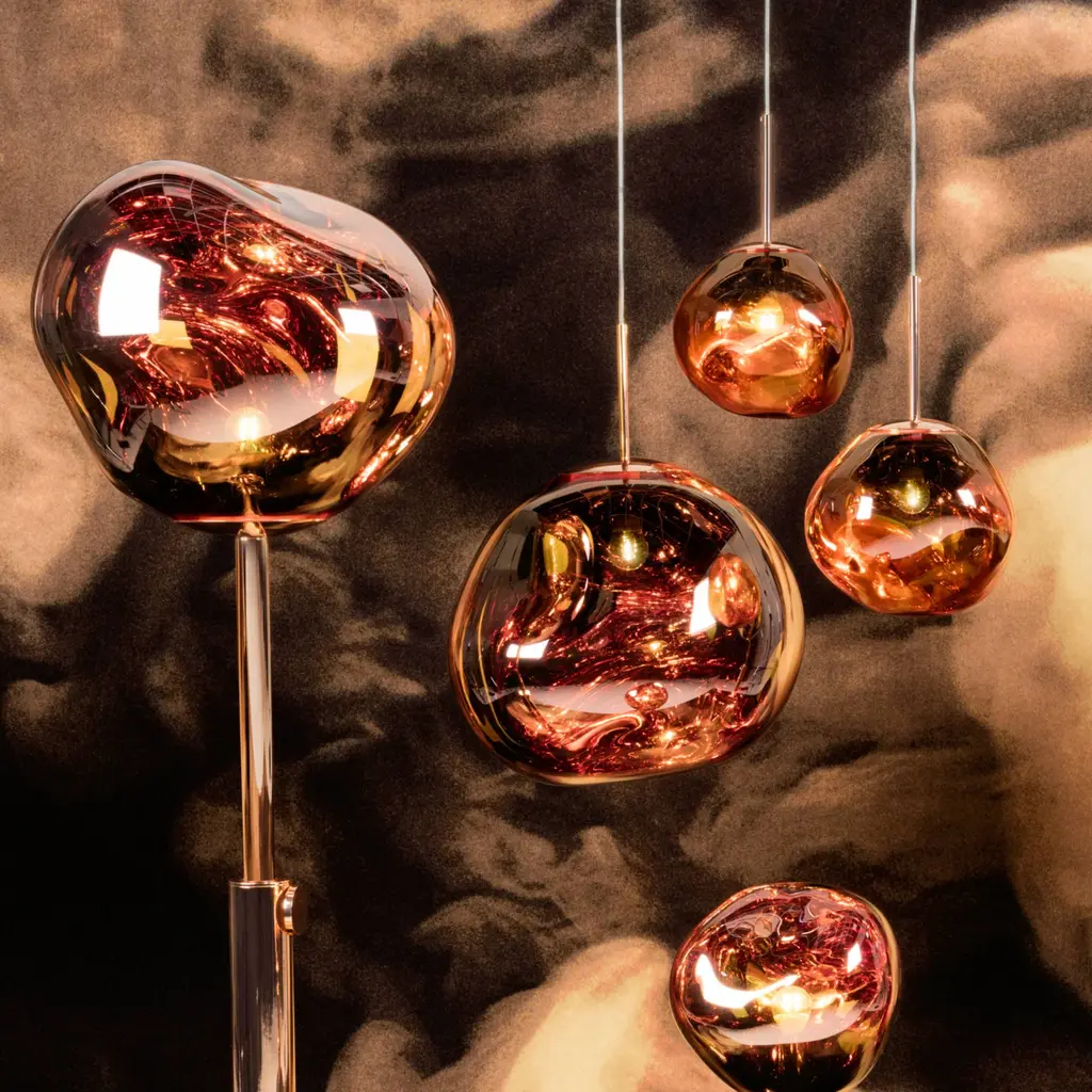 With the Melt Pendant Light, Tom Dixon distorts the message to dramatic effect. The British designer collaborated with avant-garde Swedish studio Front on this mesmerizing globe form that resembles melting blown glass. Light bounces and reflects from the uneven surfaces when the translucent-appearing fixture is switched on. When turned off, a vacuum metallic coating creates the gleaming mirror finish available in gold, chrome or copper.
