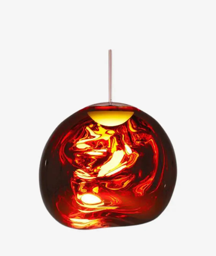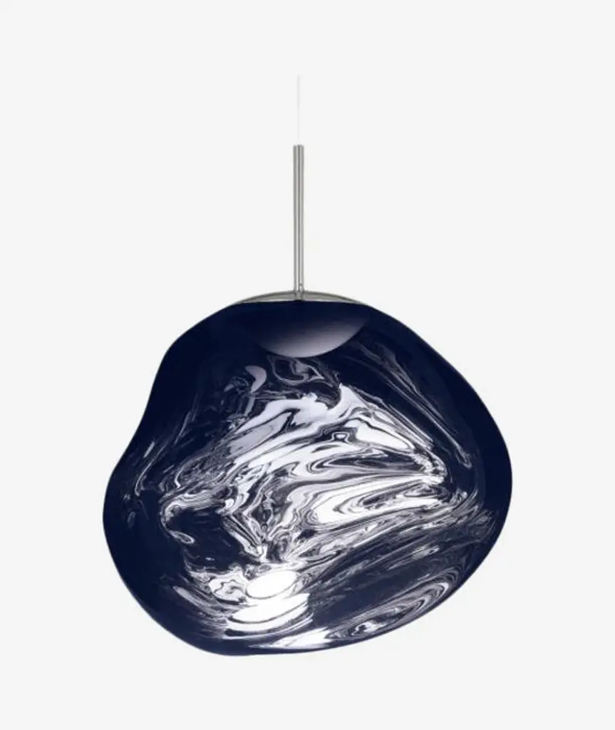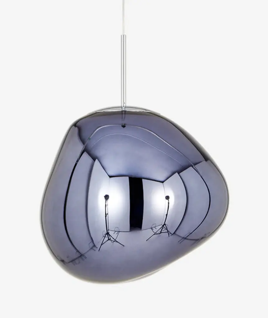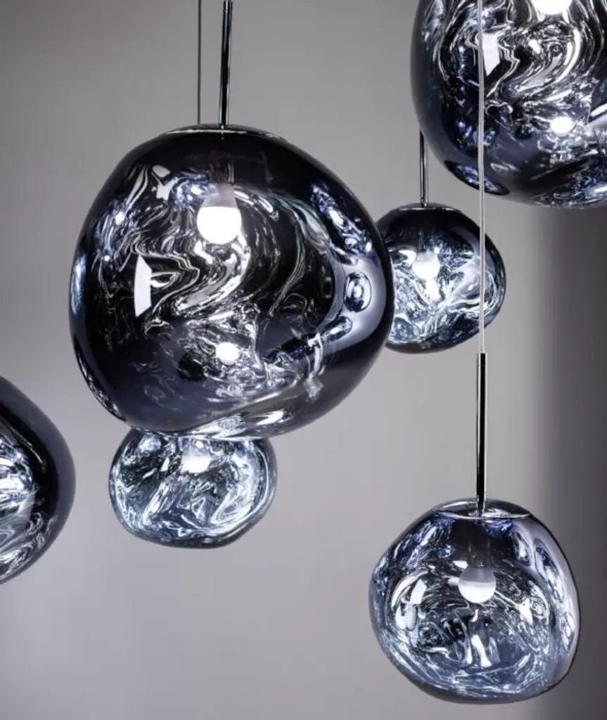 Melt is a beautifully distorted pendant light in a modern finish. Emitting an attractive, mildly hallucinogenic light, this Tom Dixon ceiling light creates a mesmerizing melting hot-blown glass effect when on and a mirror-finish effect when off. Made in Germany using a high tech manufacturing technique to achieve the perfect melted orb.