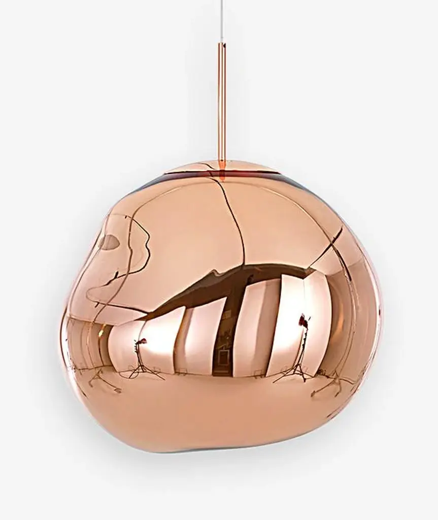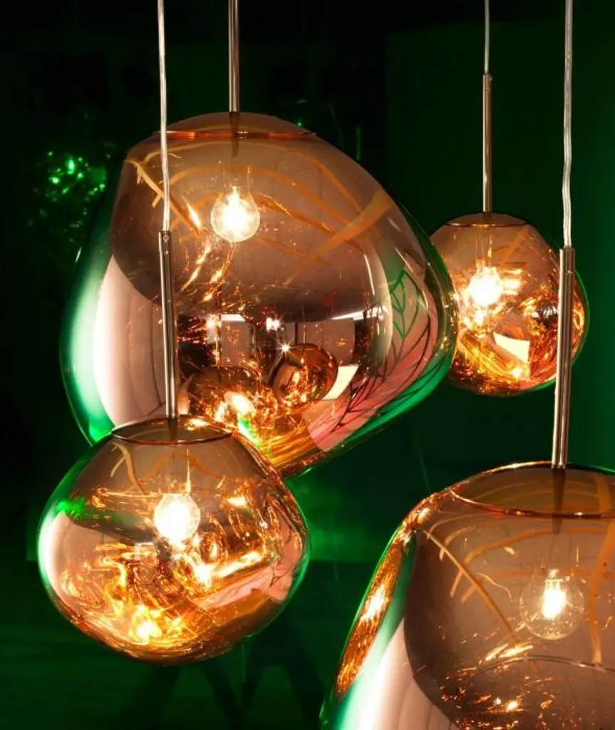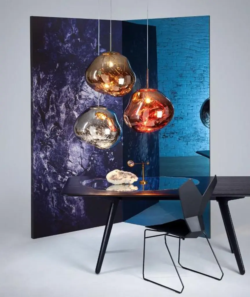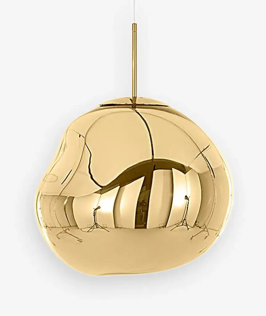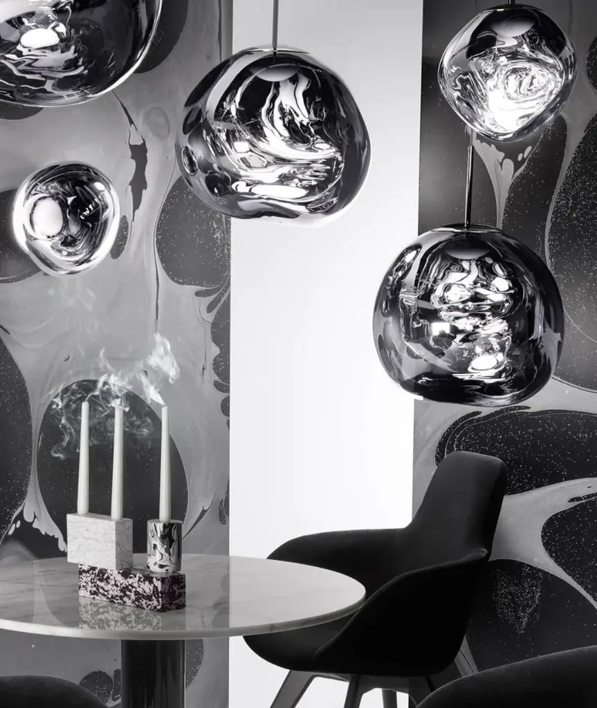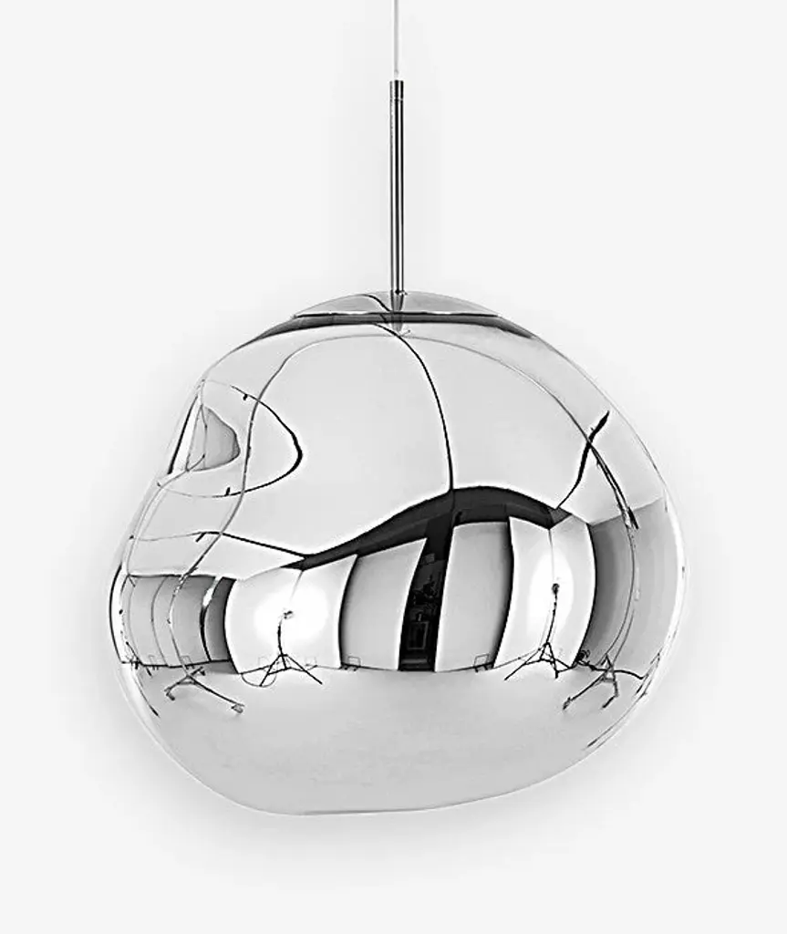 Melt is a beautifully distorted pendant light in a modern finish. Emitting an attractive, mildly hallucinogenic light, this Tom Dixon ceiling light creates a mesmerizing melting hot-blown glass effect when on and a mirror-finish effect when off. Made in Germany using a high tech manufacturing technique to achieve the perfect melted orb.