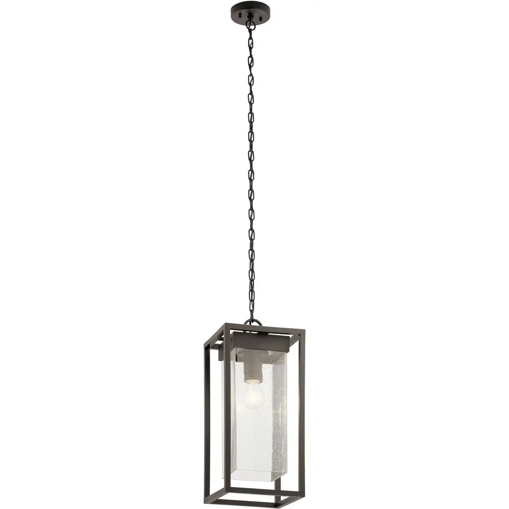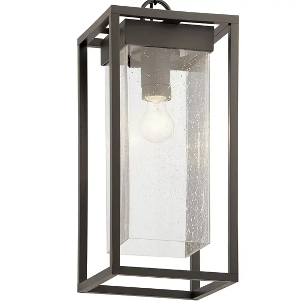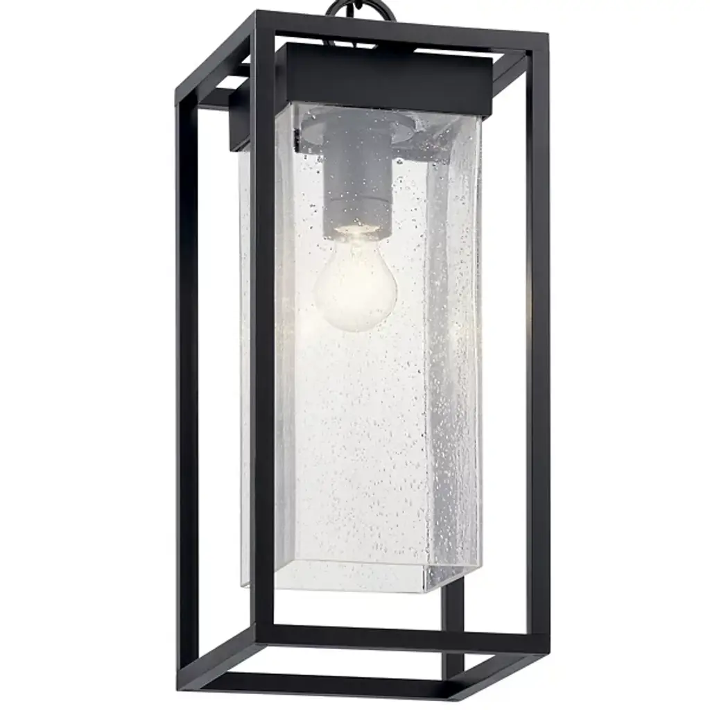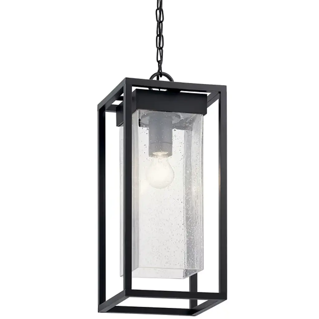 Welcome guests to your front door or patio with the radiant, dashing, and durable Mercer Outdoor Pendant from Kichler. It comes equipped with a chain-link suspension to complement high or low ceilings. The pendant speaks to the clean, modern setting with a framework of pure geometry. The rectangular structure is crafted from Kichler climate material, making it fit for the harsh elements. Inside you’ll find a clear seeded glass shade giving the overall sleek modern design a classic texture. The bubbly details of the shade mesmerize as light radiating from the inside gives them fine highlights. Sitting cozy on top, the single bulb generates a warm aura that’s as inviting as they come.