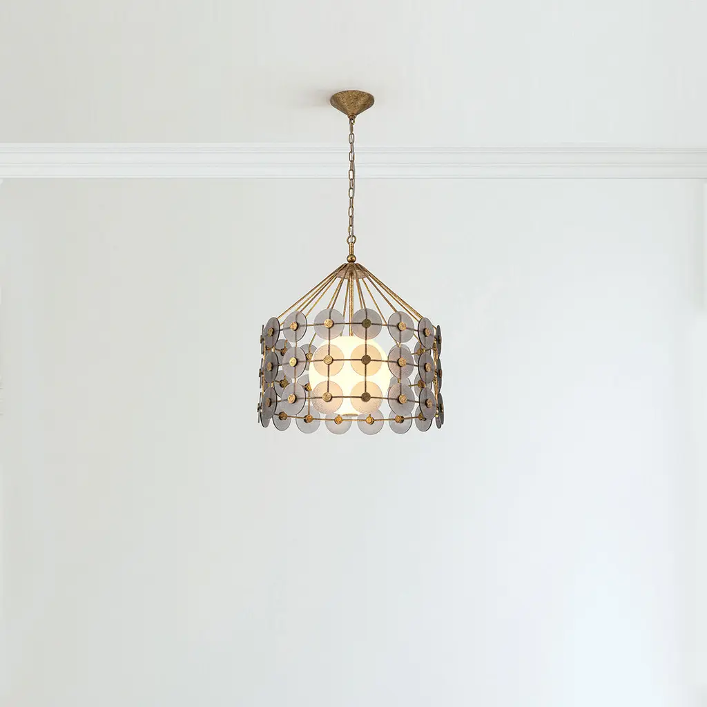 The Meridian Pendant is a 21" wide adjustable height fixture. The white glass orb diffuses the light in radiant style. The body is antiqued gold leaf and is highlighted by dark grey textured glass discs. When lit the discs give of a light grey tone. When not illuminated, the discs provide a dark grey appearance.
