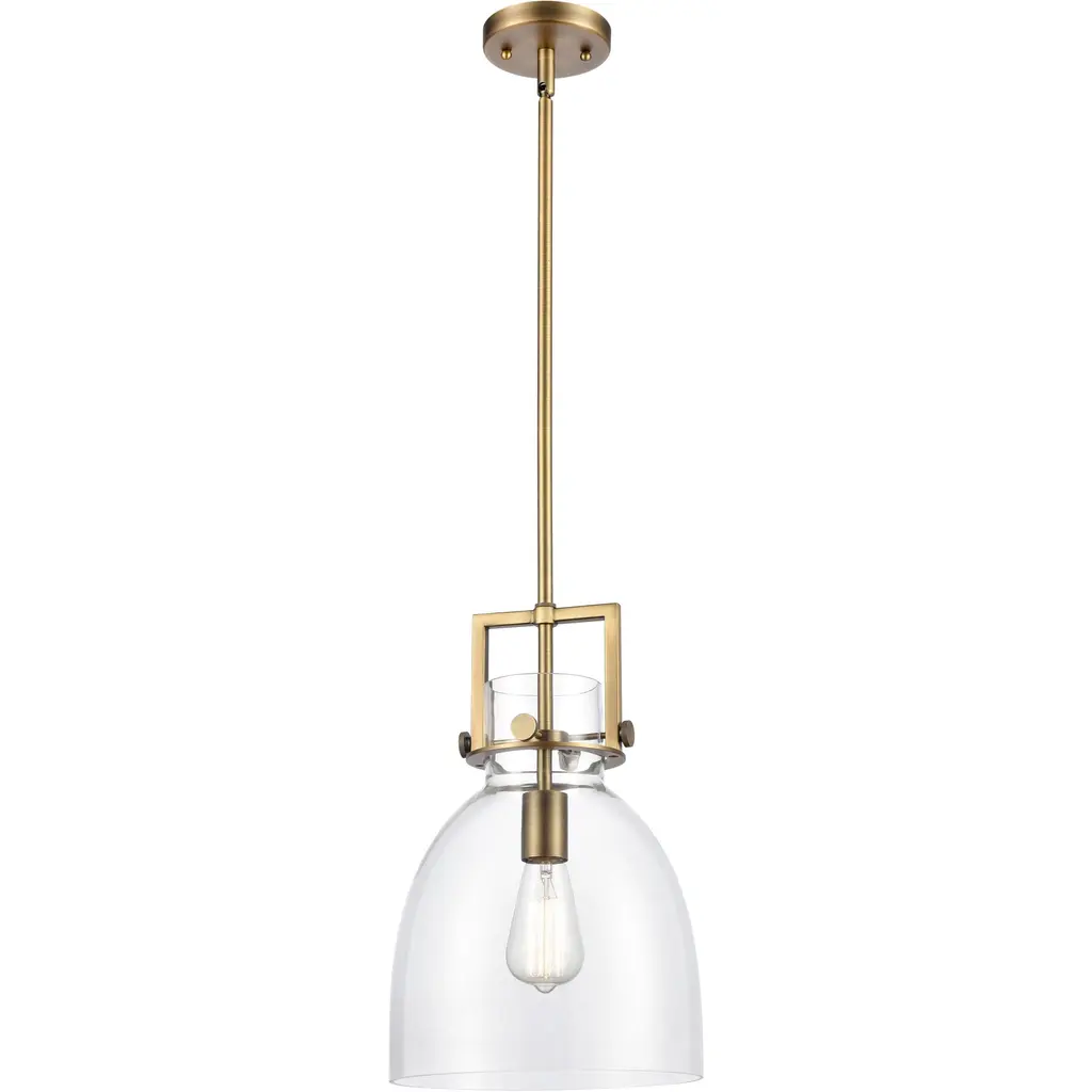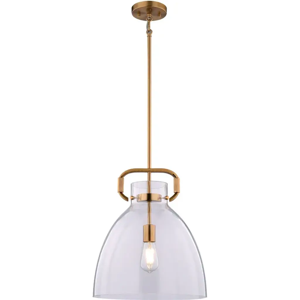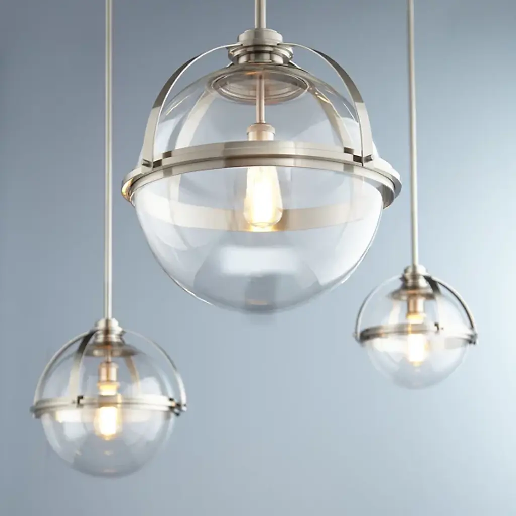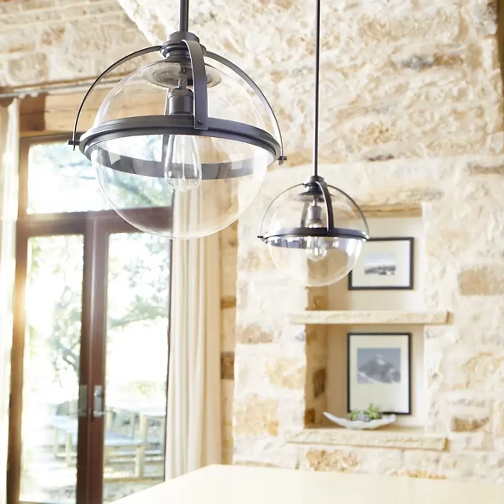 The Meridian Globe Pendant by Quorum International encompasses worldly beauty while maintaining a versatility that makes it ideal in any interior design theme. This simplistic fixture is comprised of a clear glass globe that is partially surrounded by a fitted metal framework. It hangs from a single downrod that ends in a visible bulb socket and incandescent lamp within the transparent shade, evoking the look of an antique globe suspended in air.