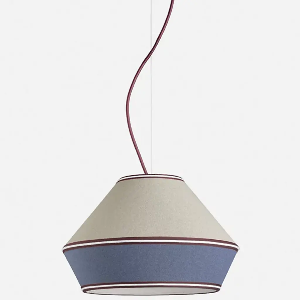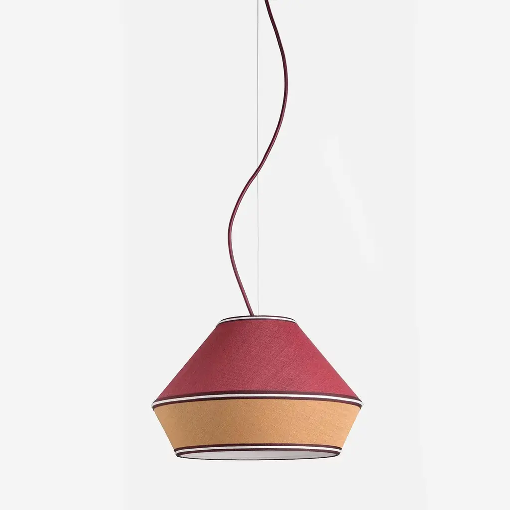 Part of a series of five pieces handcrafted with 100% linen shades of autumn-inspired colors, this pendant lamp has a simple geometric shape that is sophisticated yet playful. The frame is composed of two truncated cones facing each other, with a red top and a golden-yellow border that will cast warm reflections from the E27 max 60W bulb in a dining room, studio, or foyer. This exquisite lighting piece is part of the Fuorisalone event "Living Objects" curated by Artemest during Milan Design Week 2019. A dark red cable (1.5 meters) suspends the pendant from a white ceiling rose.