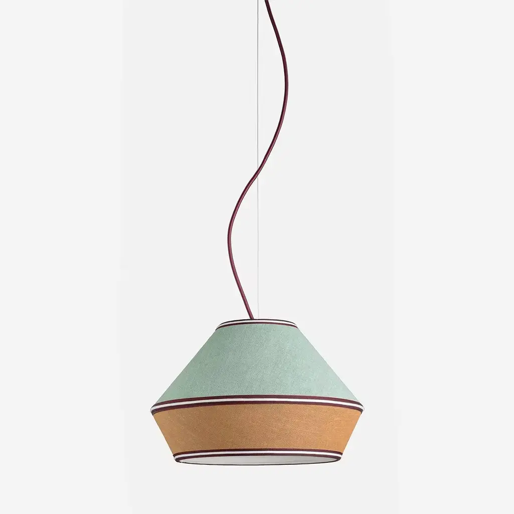Reminiscent of autumn foliage, this superbly simple pendant lamp is part of a series of five pieces with 100% linen shades in warm color combinations. Introduced at Milan Design Week 2019 during the "Living Objects" Fuorisalone event curated by Artemest, this pendant has a stylized teardrop shape that blends the sage-green top and golden-yellow border in a sophisticated aesthetic that will make a statement in any decor. Best showcased arranged in a cluster with others or as a stand-alone piece in any interior, from a study to dining room or entryway. Holds one E27 max 60W bulb.