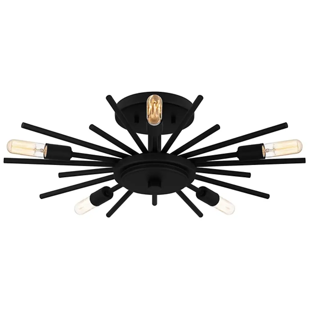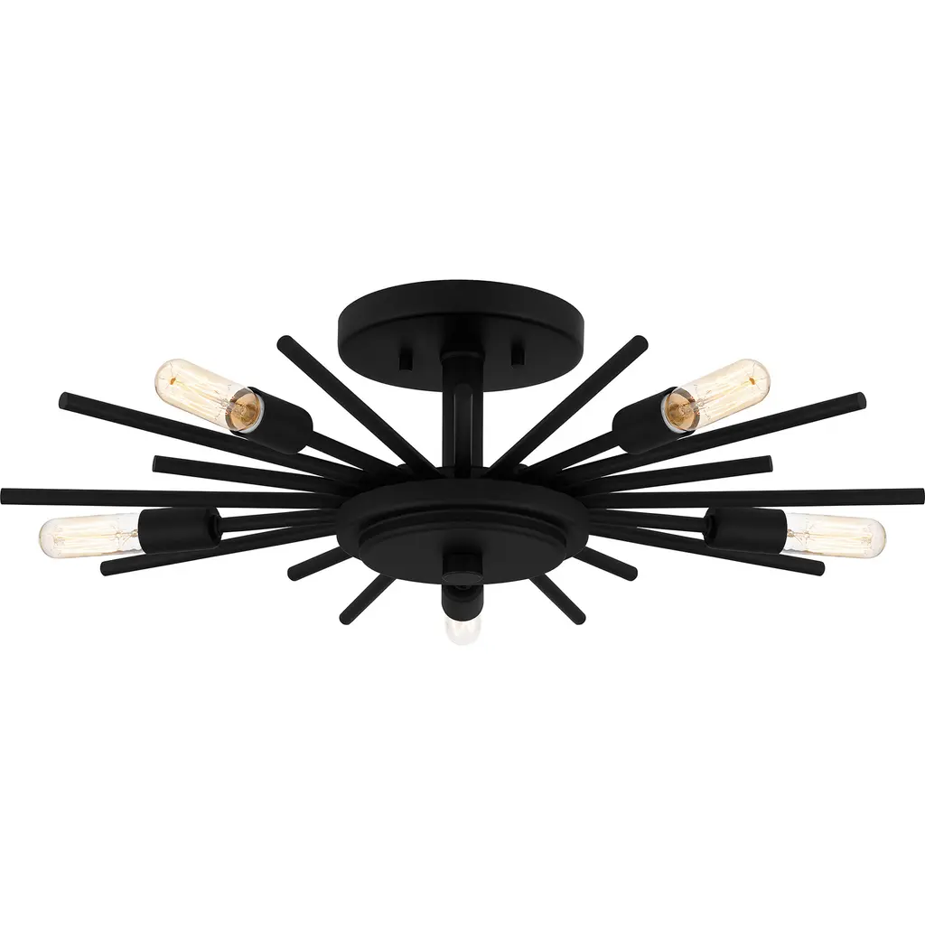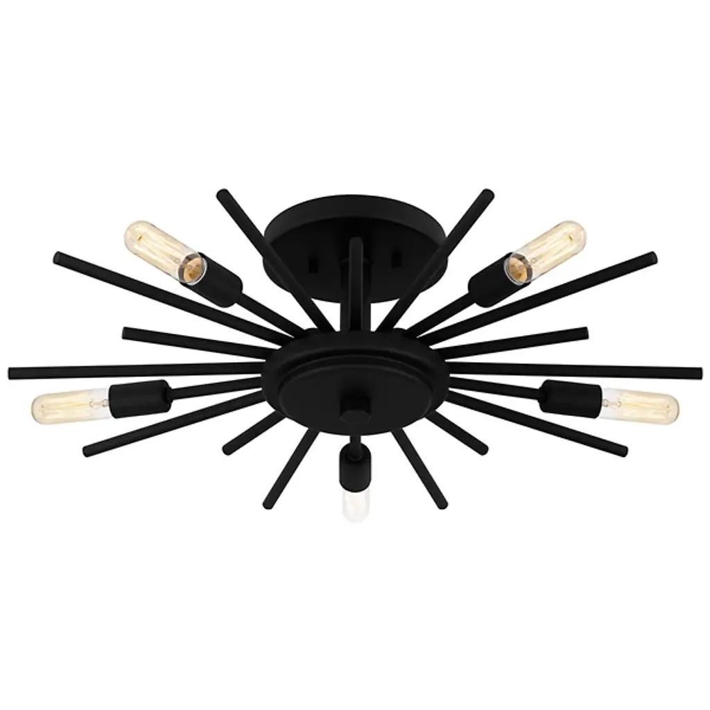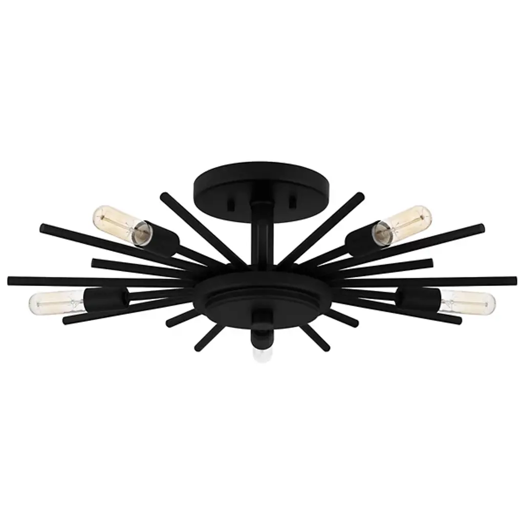 The Mesquite Semi-Flushmount from Quoizel exudes modern style with its geometric sputnik design. Versatile enough for various spaces like bedrooms, hallways, home offices, or living rooms, this fixture adds a contemporary touch wherever it's placed. For an added element of flair, pair it with vintage filament bulbs. Elevate your space with Mesquite's sleek design and illuminate your home with its striking geometric silhouette, making a statement in any room.