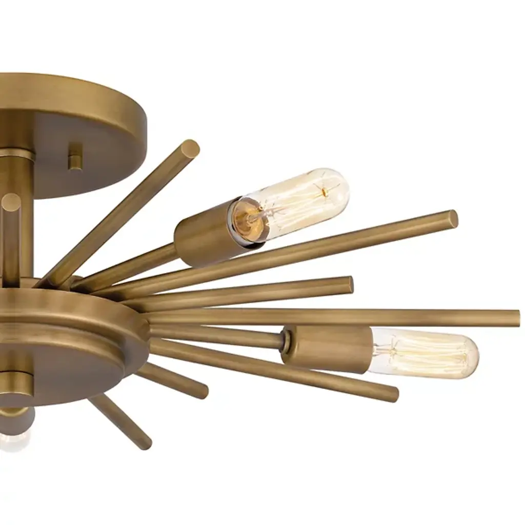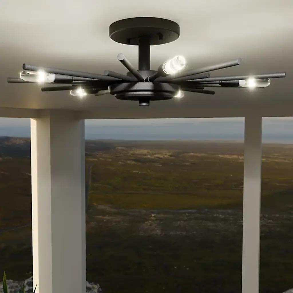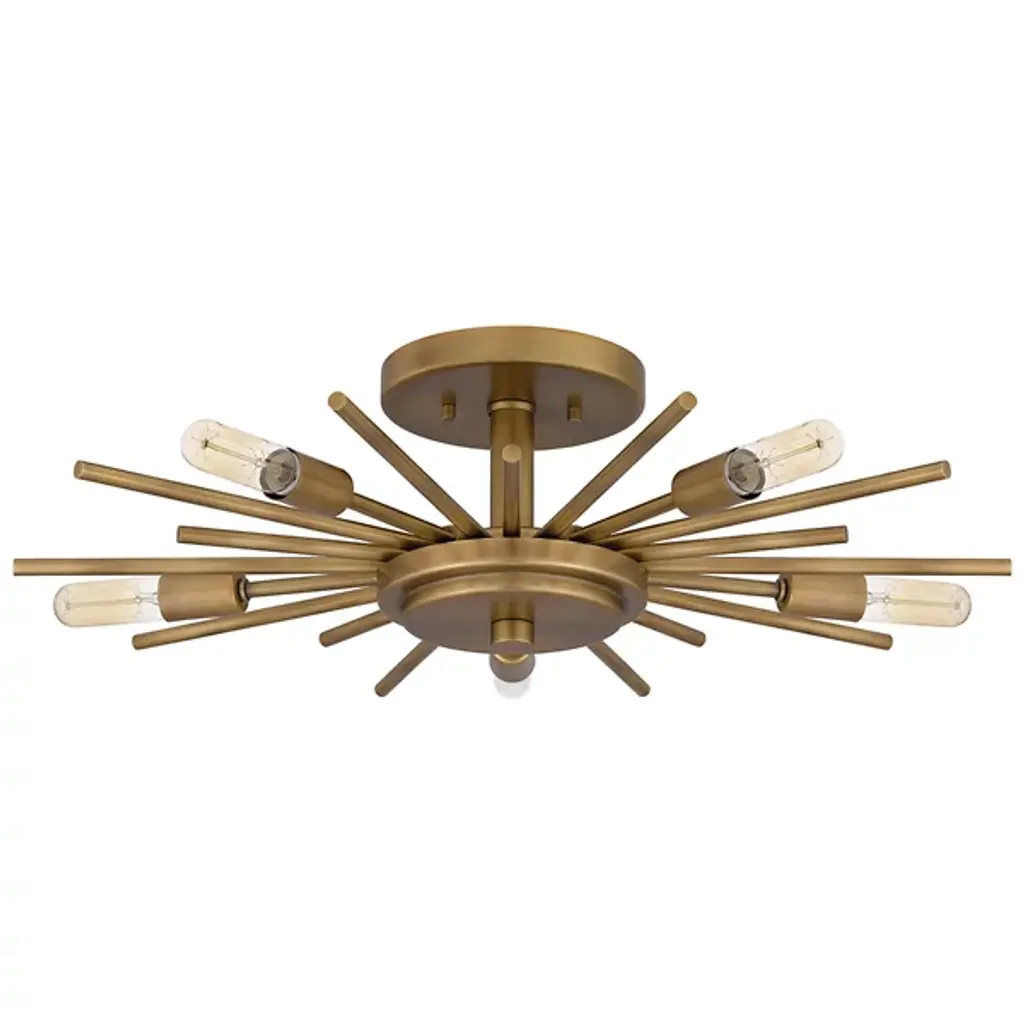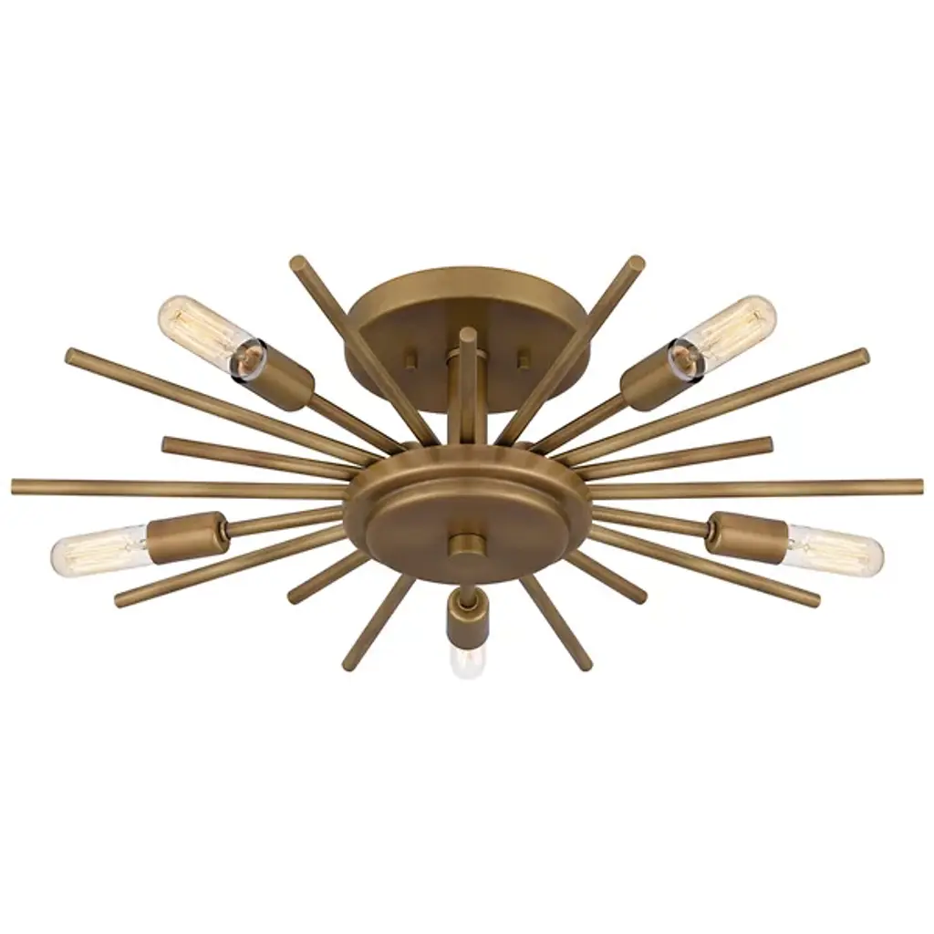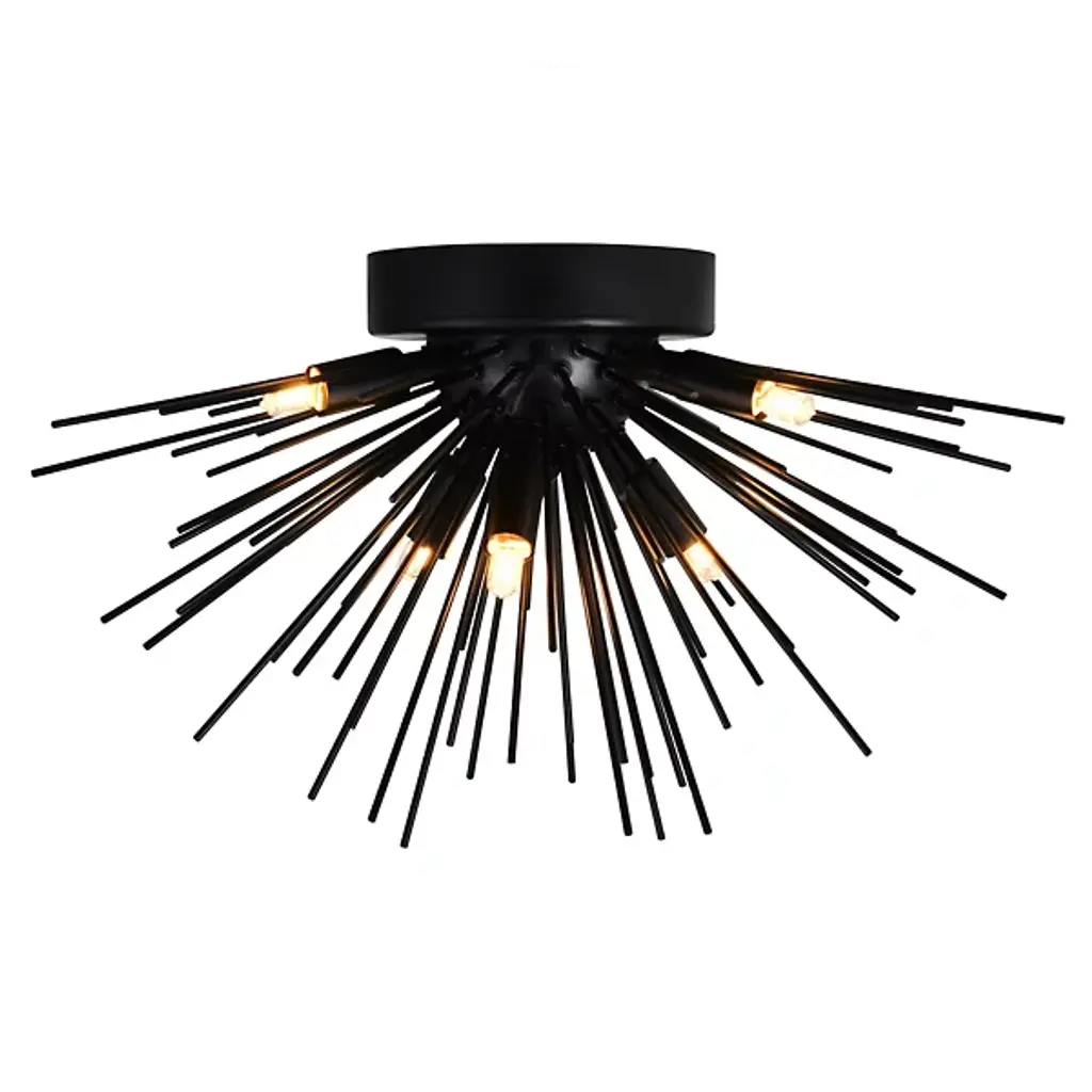 The Mesquite Semi-Flushmount from Quoizel exudes modern style with its geometric sputnik design. Versatile enough for various spaces like bedrooms, hallways, home offices, or living rooms, this fixture adds a contemporary touch wherever it's placed. For an added element of flair, pair it with vintage filament bulbs. Elevate your space with Mesquite's sleek design and illuminate your home with its striking geometric silhouette, making a statement in any room.