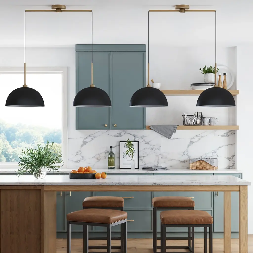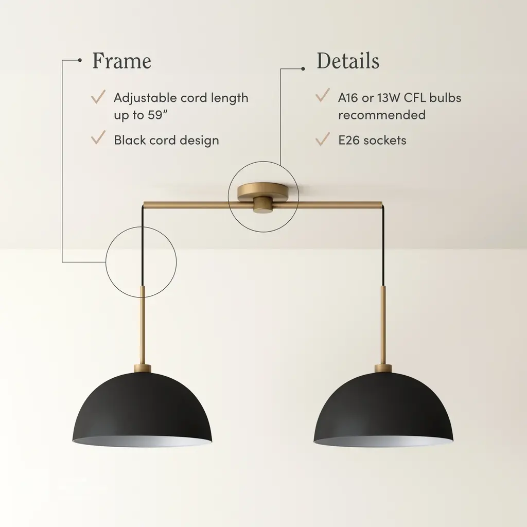 Want the feel of custom lighting without the custom lighting price tag? Meet Percy, our stunning modern farmhouse pendant light with two matte black finish metal shades and vintaged brass details. Percy has an adjustable height with a maximum cord length of 59 inches, so you can be sure it will be the perfect height for your space. Percy is equal parts beauty and function and is dry-rated, making it ideal for kitchens, dining rooms, and other dry spaces. Make it dimmable by pairing it with a dimmer bulb for a romantic evening in, or for when you’re sneaking into the kitchen for a late-night snack.