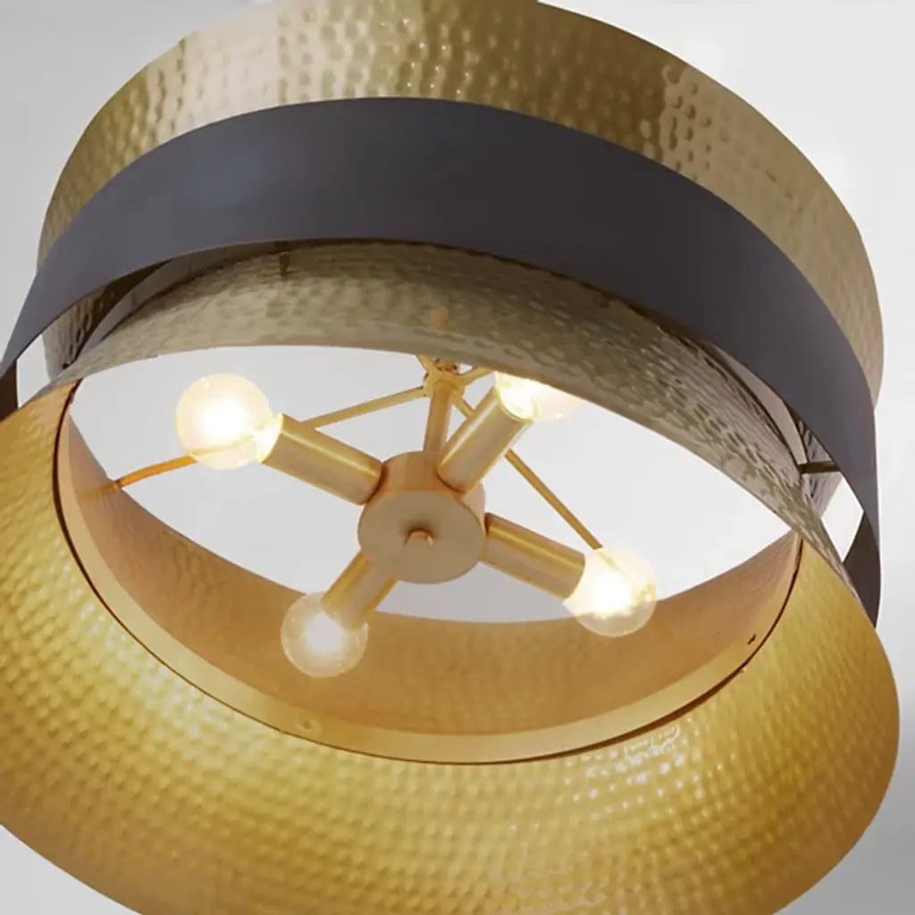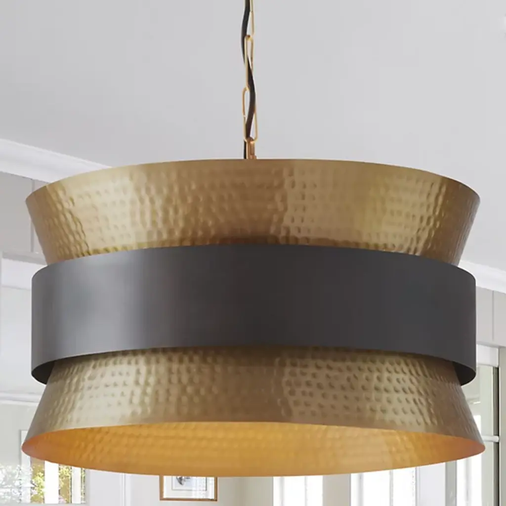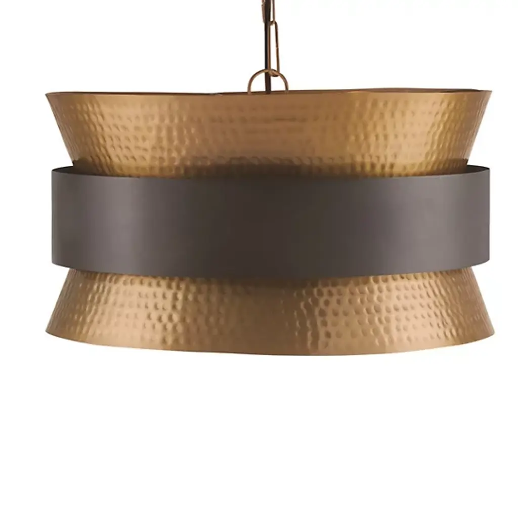 Each Metal Hourglass Drum Pendant by Capital Lighting showcases a unique hand-hammered pattern on the flared metal drum as it forms an hourglass silhouette. An enveloping, smooth band contrasts and complements this piece, adding a tailored touch around the waist. With a beautiful blend of textures and finishes that an internal candelabra arrangement plays off of, this confident addition to indoor spaces is simply suspended with an elongated link chain and single loop detail.