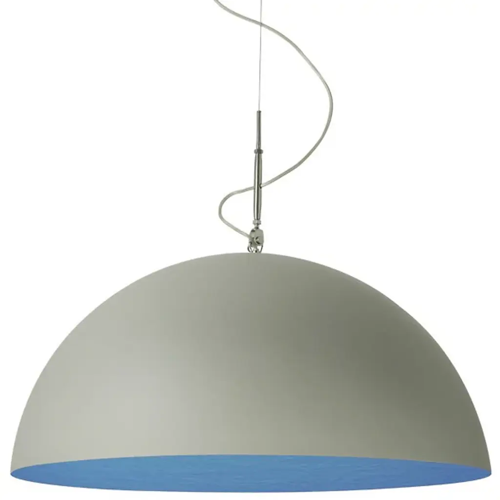 The Mezza Luna Cemento Pendant from In-Es Art Design brings an intimate and encompassing design and light to a space. Made by hand, this fixture’s half-circle shade drops from a slender cord to arch widely over its concealed light source. Its cement-painted exterior resembles a half-moon and infuses the room with an organic and industrial air. A colored interior brings contrast, while its proprietary Nebulite material displays a textural, swirling effect.