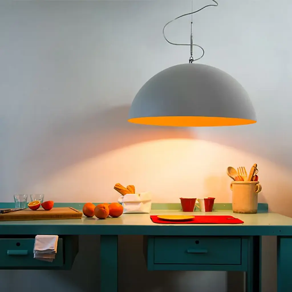 The Mezza Luna Cemento Pendant from In-Es Art Design brings an intimate and encompassing design and light to a space. Made by hand, this fixture’s half-circle shade drops from a slender cord to arch widely over its concealed light source. Its cement-painted exterior resembles a half-moon and infuses the room with an organic and industrial air. A colored interior brings contrast, while its proprietary Nebulite material displays a textural, swirling effect.