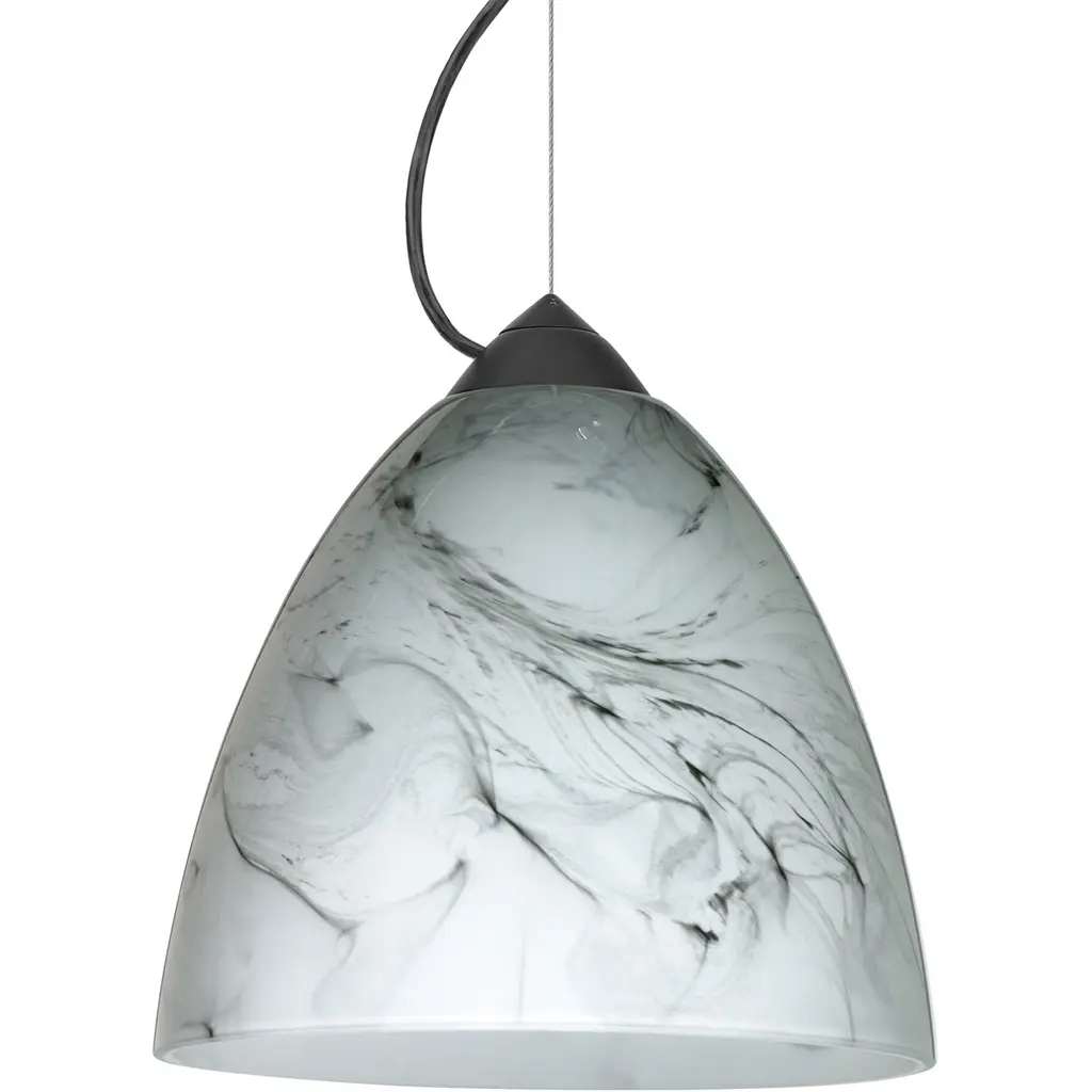 Mia has a classical bell shape that complements aesthetic, while also built for optimal illumination. Our Marble Grigio glass is a bright white cased glass, with inner opal and a glossy finish. The white color is accented by flowing marbleized black lines, and nestled between the inner opal and outer clear layers. When lit the glass is vitalizing as well as stylish, that adds appeal to any environment. This blown glass is handcrafted by a skilled artisan, utilizing century-old techniques passed down from generation to generation. Each piece of this décor has its own artistic nature that can be individually appreciated. The 12V cord pendant fixture is equipped with a 10' braided coaxial cord with teflon jacket and a low profile flat monopoint canopy. These stylish and functional luminaries are offered in a beautiful Black finish.