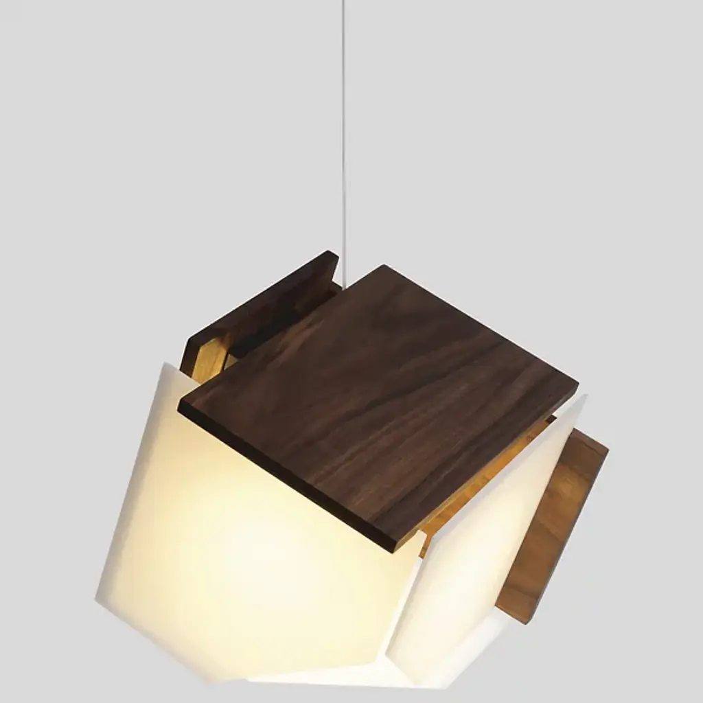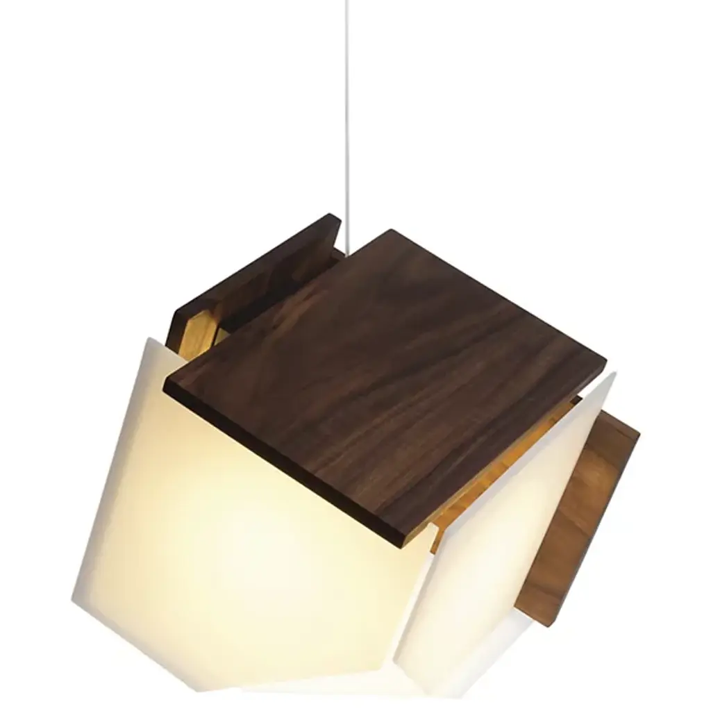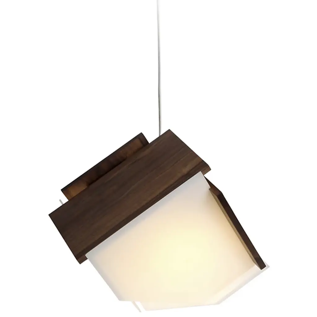 The Cerno Mica LED Accent Pendant is a deconstructed cube of energy-efficient light. Ambient LED light filters through the diffuser, enhancing the natural grain of the solid wood accents. The wooden components intersect the diffuser, allowing light to gently peak through the openings, creating an asymmetrical and complementary composition of natural and technical elements. The two canopy options provide flexibility when installing the Mica—both requiring space for the included LED driver. Use the extended canopy option when adequate junction box space is not available. The low canopy option still requires space in the junction box for the included LED driver, but is a more standard, slimmer option.