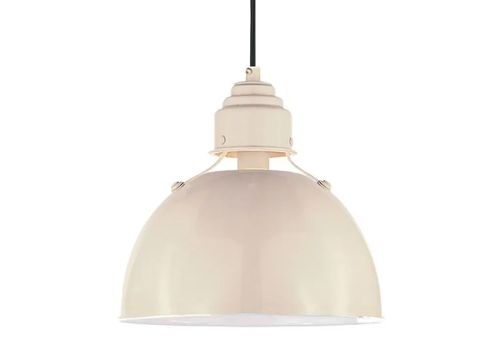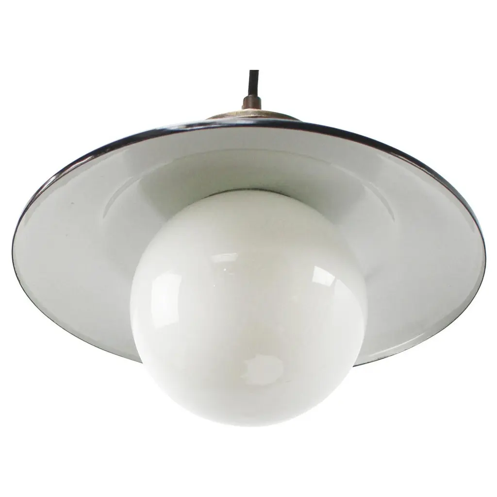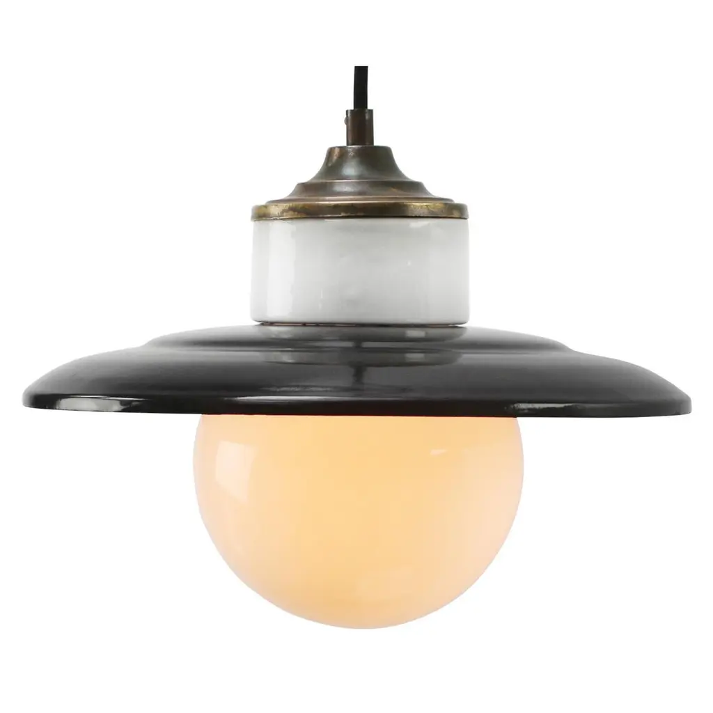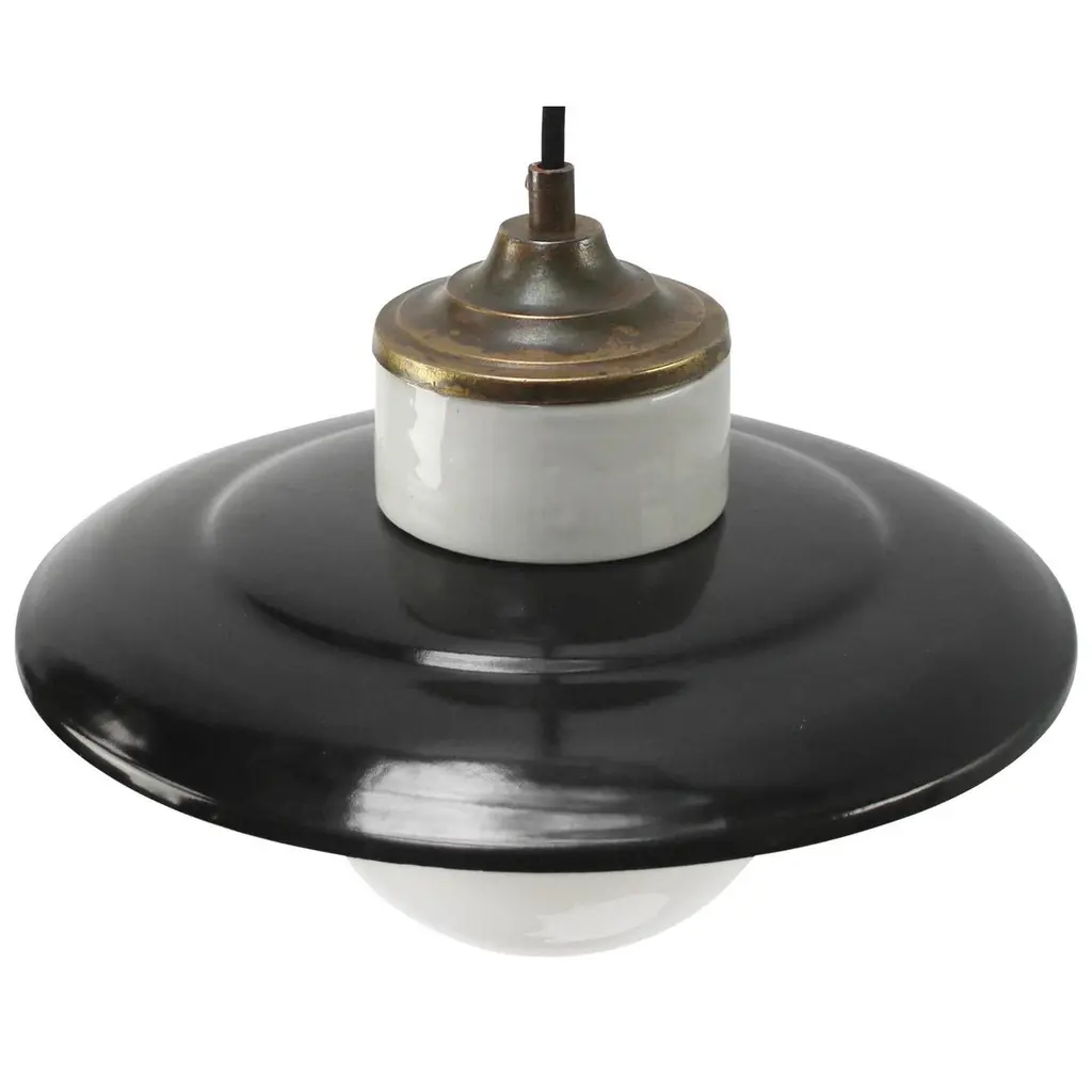 Porcelain industrial hanging lamp.White porcelain, brass and white opaline milk glass.Black enamel shade2 conductors, no ground.Weight: 1.70 kg / 3.7 lbPriced per individual item. All lamps have been made suitable by international standards for incandescent light bulbs, energy-efficient and LED bulbs. The new wiring is CE certified or UL listed. 100% safe. They can be set in operation immediately. Contact us for shipping prices for larger quantities. Excluding light bulb.