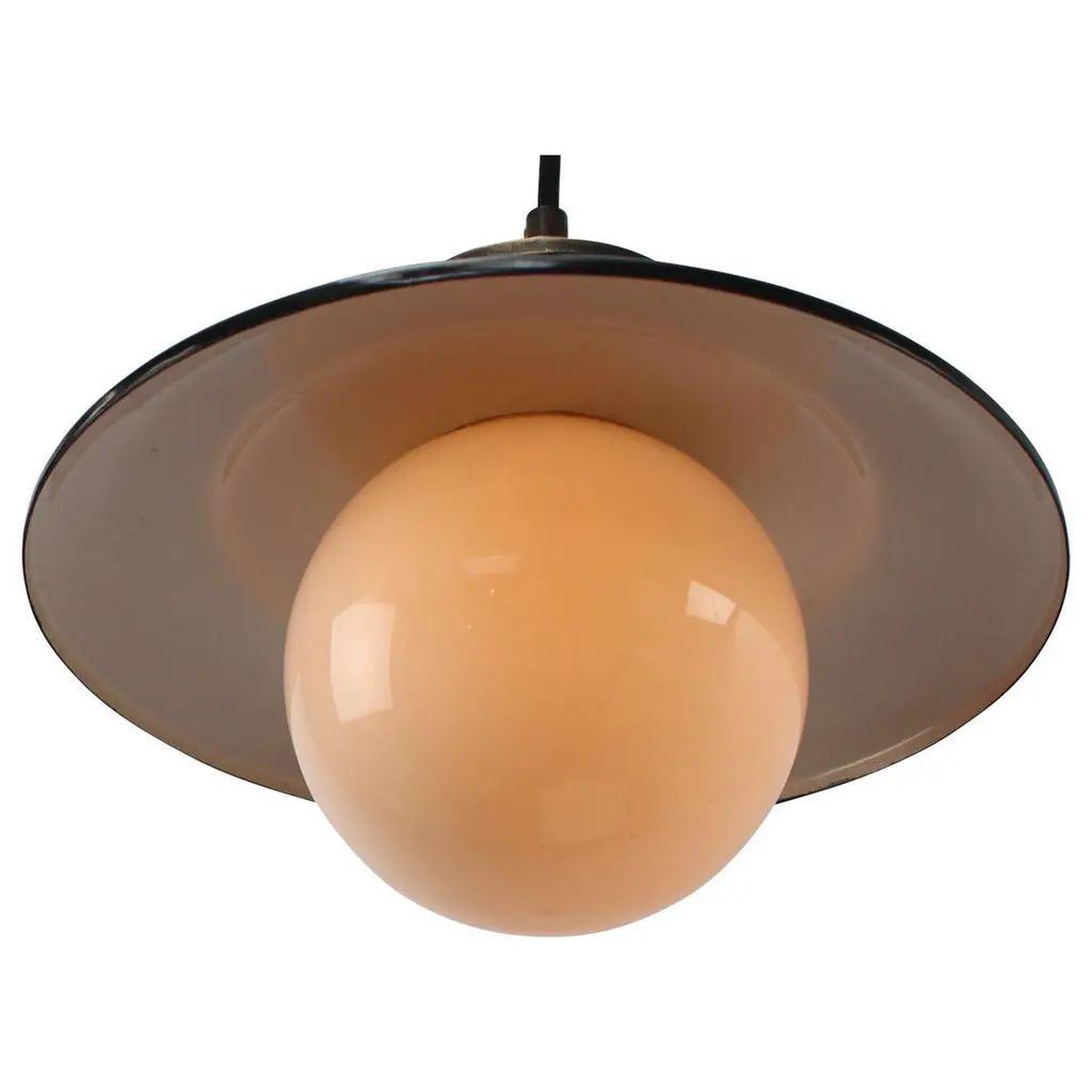 Mid-20th Century White Porcelain Opaline Glass Black Enamel Brass Pendant Lights