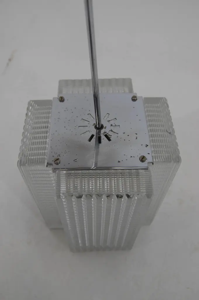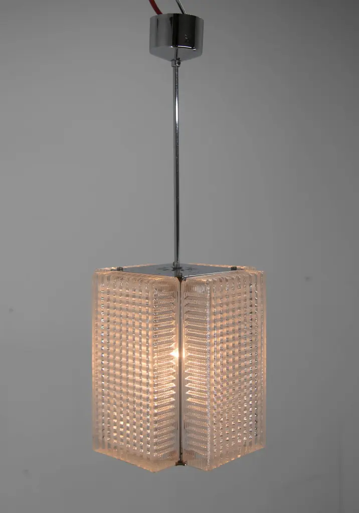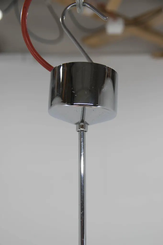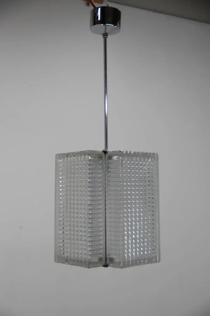Mid-Century pendant made in Czechoslovakia in 1970sMinor crack on upper side visible on photo has no effect on function.Chrome with age patina1x60W, E25-E27 bulbMore items availableUS wiring compatible.