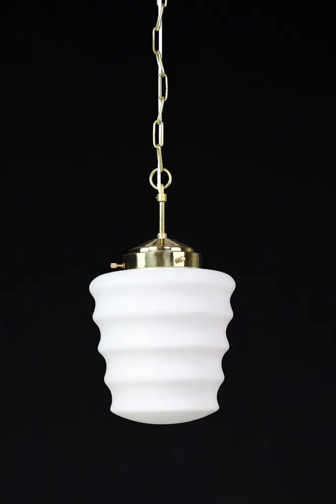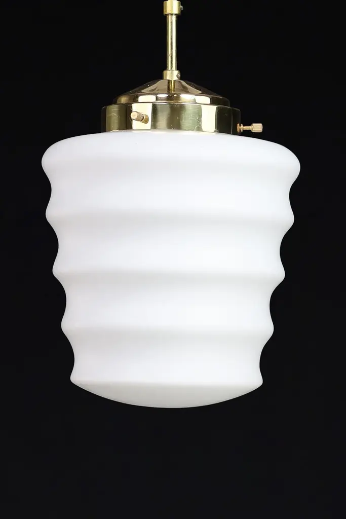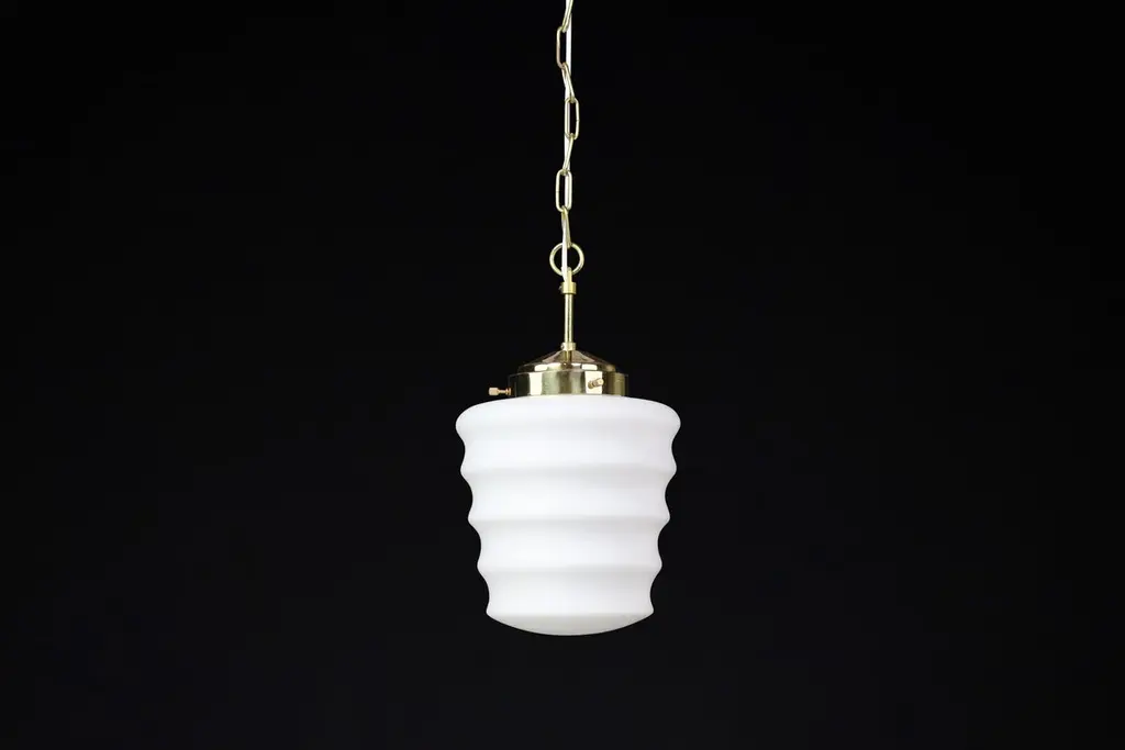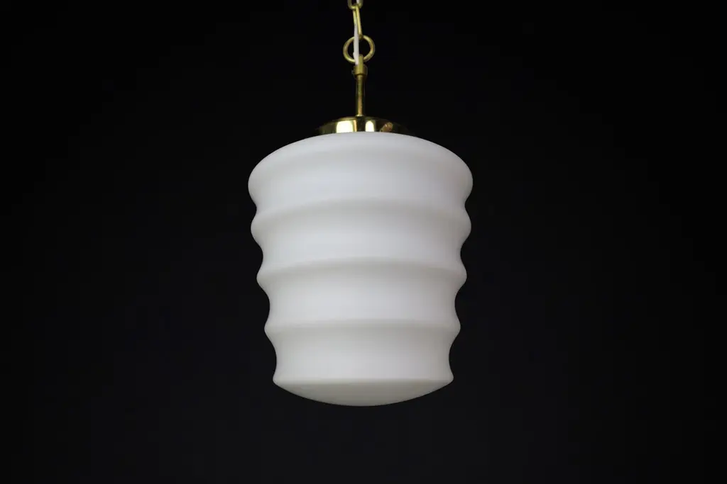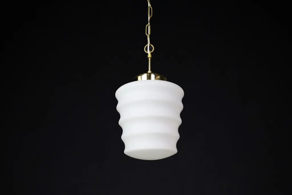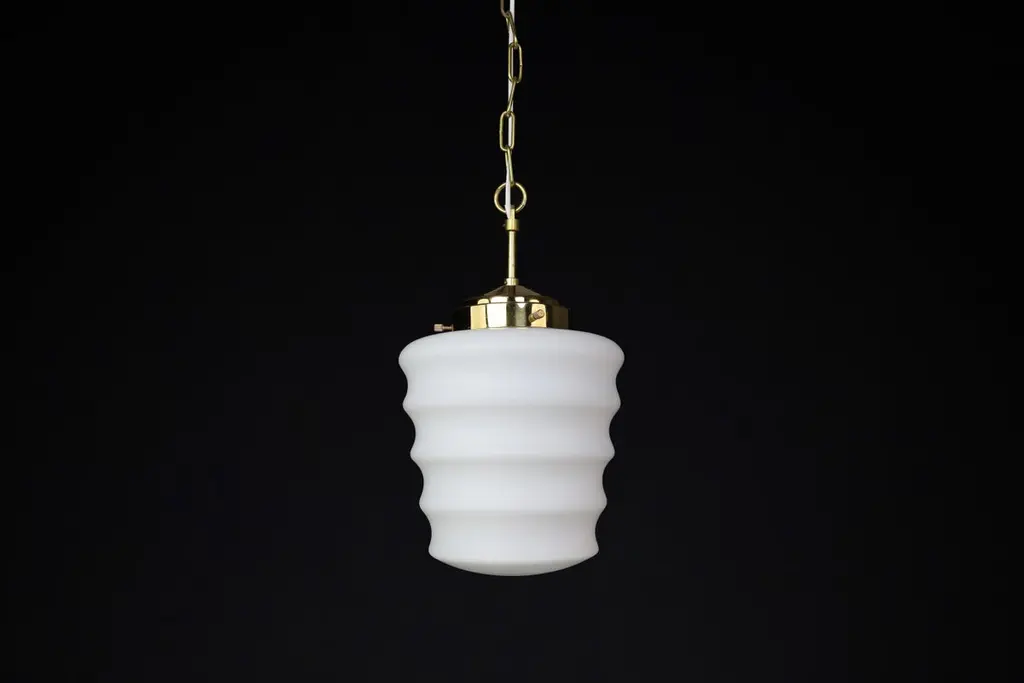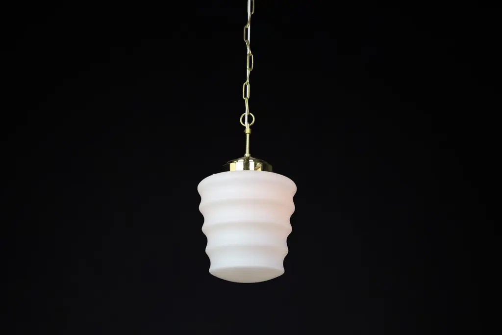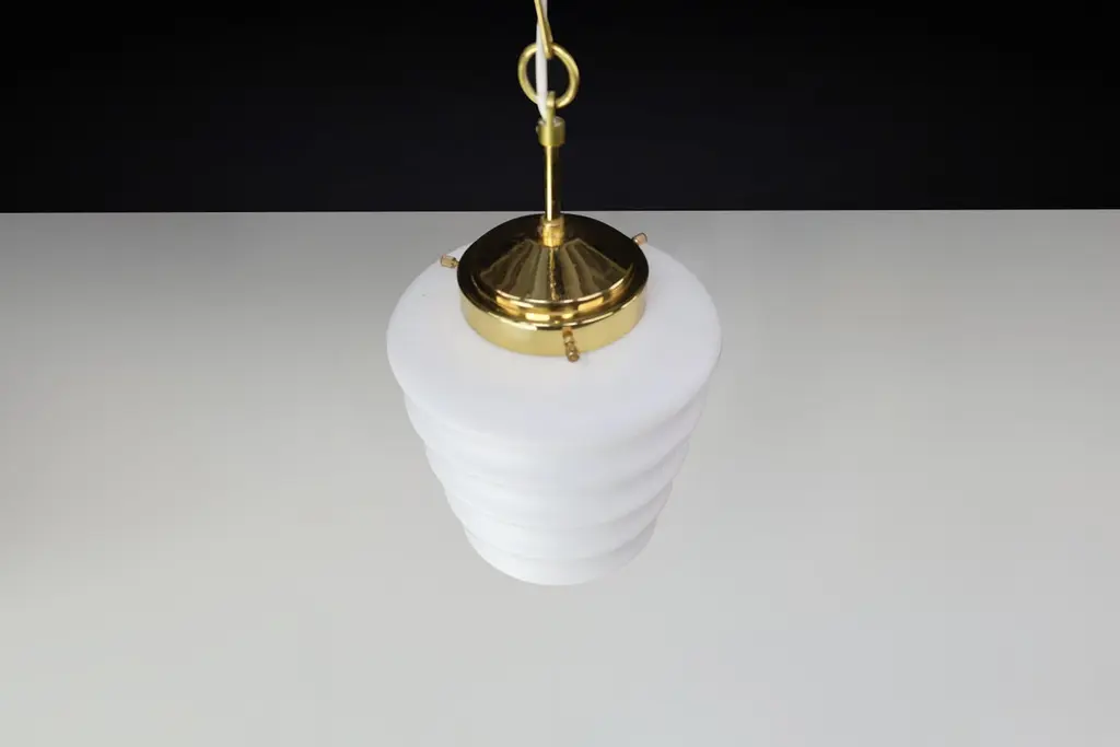 Mid-Century Modern Brass and Opaline Glass Pendant, Prague, 1960s (10 Available, Price per Pendant)Description:A refined and sculptural Mid-Century Modern pendant light, produced in Prague in the 1960s. Each piece features a hand-blown opaline glass shade with an elegant, undulating form that diffuses light gently and evenly. The shade measures 24 cm in diameter and 27 cm in height, offering a compact yet eye-catching profile.Suspended by a polished brass fixture and chain, with a matching brass ceiling canopy, the pendant embodies the clean lines and material harmony typical of European modernist design. Its understated elegance makes it suitable for both vintage-inspired and contemporary interiors.Each pendant has been professionally restored and thoroughly cleaned, maintaining its original character while being updated for modern functionality. Fitted with a standard E27 socket, fully compatible with LED bulbs, and rewired to meet international safety standards (US, UK, Asia).The drop is adjustable up to approximately 100 cm, allowing flexibility for various ceiling heights and layout needs. Perfect for use in dining rooms, kitchens, hallways, or commercial settings. Their uniformity also makes them ideal for grouped installations.A total of 10 identical pendants are available, all in excellent vintage condition.Price is per pendant.These rare opaline glass and brass fixtures offer timeless style, thoughtful craftsmanship, and functional beauty—hallmarks of true mid-century design. Whether installed singly or as a series, they bring warmth, texture, and design heritage to any space.