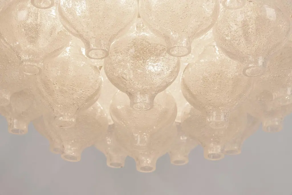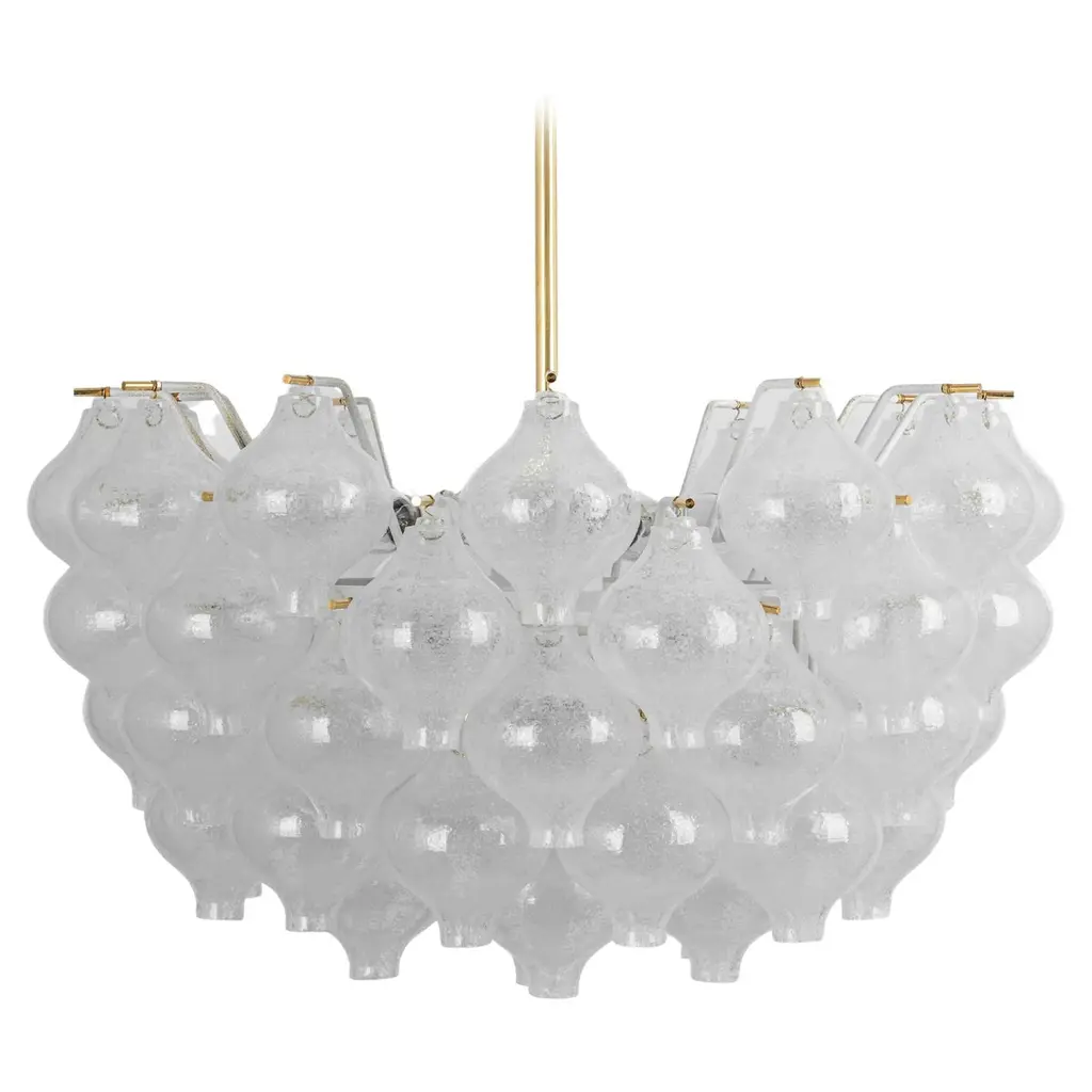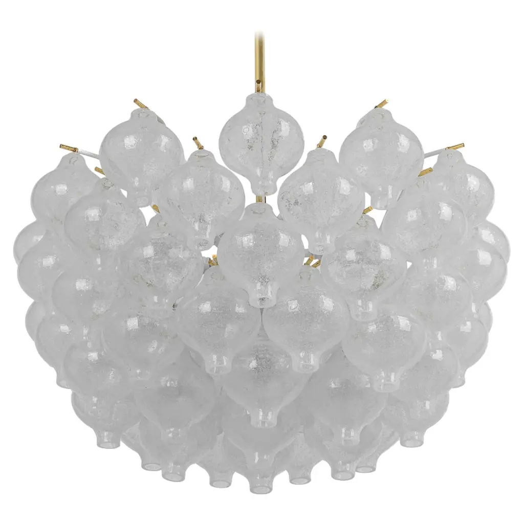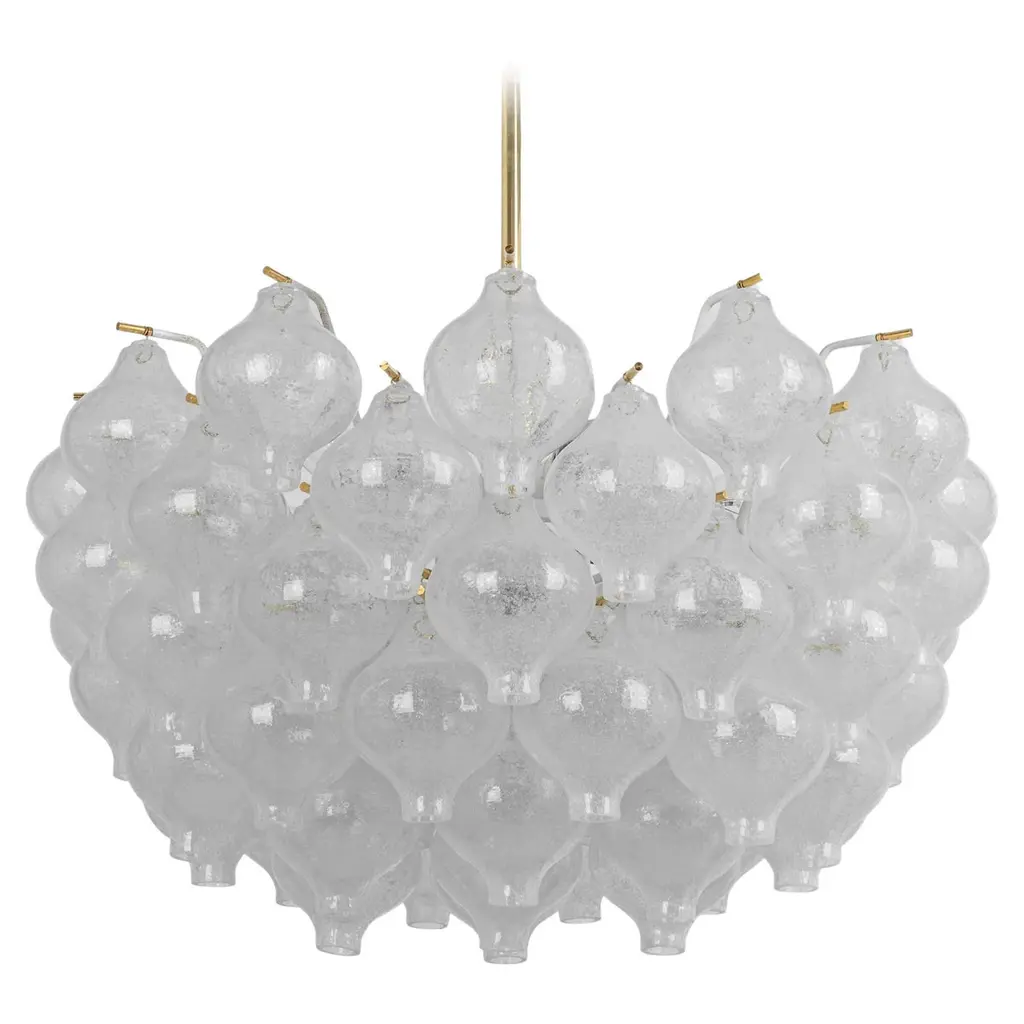 A large and fantastic light fixture model Tulipan 61 HL by J.T. Kalmar, Vienna, Austria, manufactured in midcentury, circa 1970 (late 1960s or early 1970s).The name Tulipan derives from the tulip shaped hand blown bubble glasses. Each glass piece is handmade and therefore a unique piece. In total there are 61 glass pieces which are mounted with brass screws on a white enameled metal frame.The height of the body without rod is ca. 12.6 inch / 32 cm. The current overall drop is ca. 29.5 inch / 75 cm but we offer a customizing of the rod to any length for free of charge.The lamp has 12 sockets for small screw base LEDs or bulbs E14 (max. 40W per bulb).It is possible to install this fixture in all countries (US, UK, Europe, Asia, Canada,) although it may be necessary to purchase different light bulbs suitable to local electricity. It also can be used with a dimmer. Light bulbs are not included. The light is labeled and documented in the Kalmar catalogue from the 1970s.The piece has great volume and in reality it looks much bigger than you would expect it from the dimensions. It is in very good condition, ready to use.Two lights are available. The price is per fixture. They are sold individually or as pair.Shipping cost depends on number of ordered items.Kalmar had a cooperation with several Italian glass makers located in Murano (e.g. Mazzega, Venini) and got the glasses from there. Several other European companies like Orrefors (Sweden), Limburg and Hillebrand from Germany, and Arredoluce, Stilnovo, Fontana Arte from Italy used hand blown or textured glass for their lamps in 1950s, 1960s and 1970s.