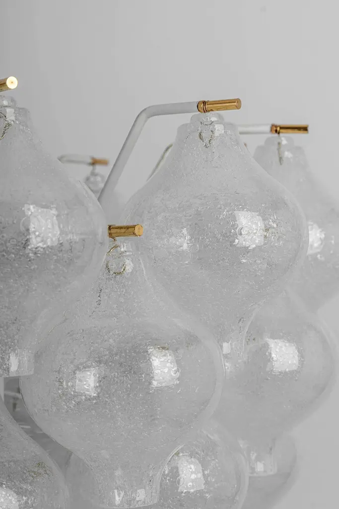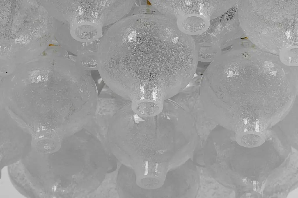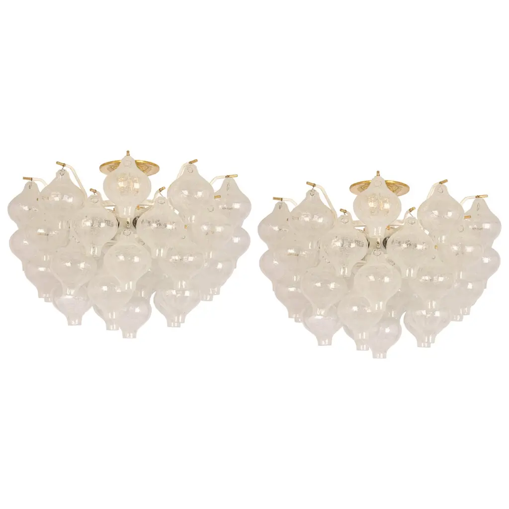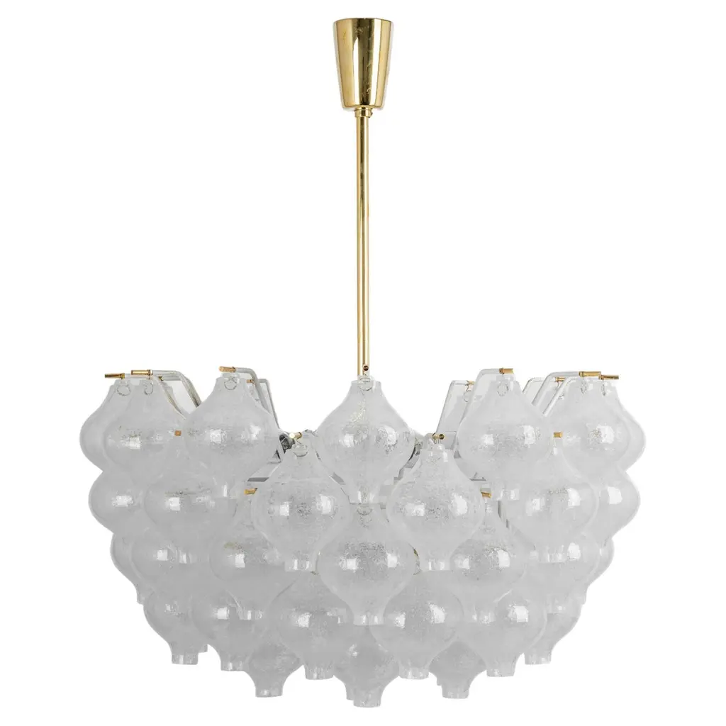 A large and fantastic light fixture model Tulipan 61 HL by J.T. Kalmar, Vienna, Austria, manufactured in midcentury, circa 1970 (late 1960s or early 1970s).The name Tulipan derives from the tulip shaped hand blown bubble glasses. Each glass piece is handmade and therefore a unique piece. In total there are 61 glass pieces which are mounted with brass screws on a white enameled metal frame.The height of the body without rod is ca. 12.6 inch / 32 cm. The current overall drop is ca. 29.5 inch / 75 cm but we offer a customizing of the rod to any length for free of charge.The lamp has 12 sockets for small screw base LEDs or bulbs E14 (max. 40W per bulb).It is possible to install this fixture in all countries (US, UK, Europe, Asia, Canada,) although it may be necessary to purchase different light bulbs suitable to local electricity. It also can be used with a dimmer. Light bulbs are not included. The light is labeled and documented in the Kalmar catalogue from the 1970s.The piece has great volume and in reality it looks much bigger than you would expect it from the dimensions. It is in very good condition, ready to use.Two lights are available. The price is per fixture. They are sold individually or as pair.Shipping cost depends on number of ordered items.Kalmar had a cooperation with several Italian glass makers located in Murano (e.g. Mazzega, Venini) and got the glasses from there. Several other European companies like Orrefors (Sweden), Limburg and Hillebrand from Germany, and Arredoluce, Stilnovo, Fontana Arte from Italy used hand blown or textured glass for their lamps in 1950s, 1960s and 1970s.