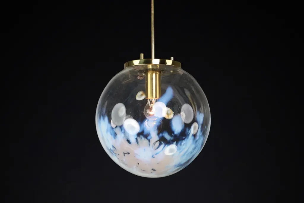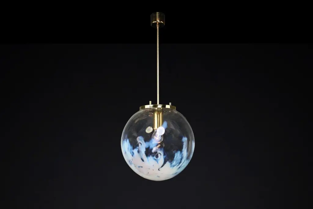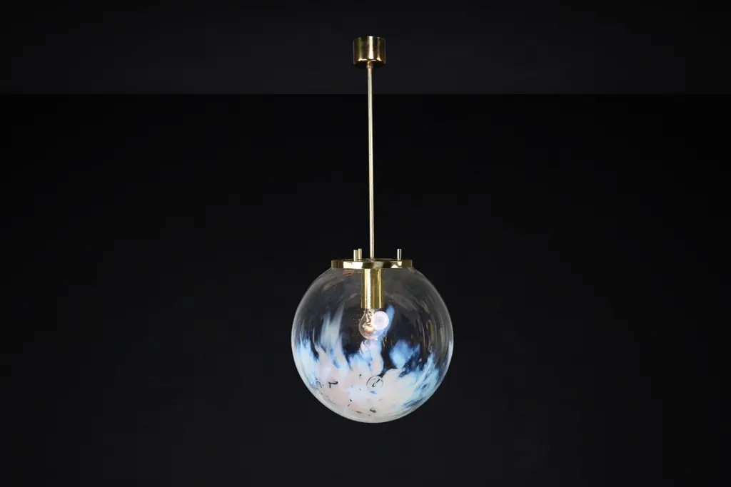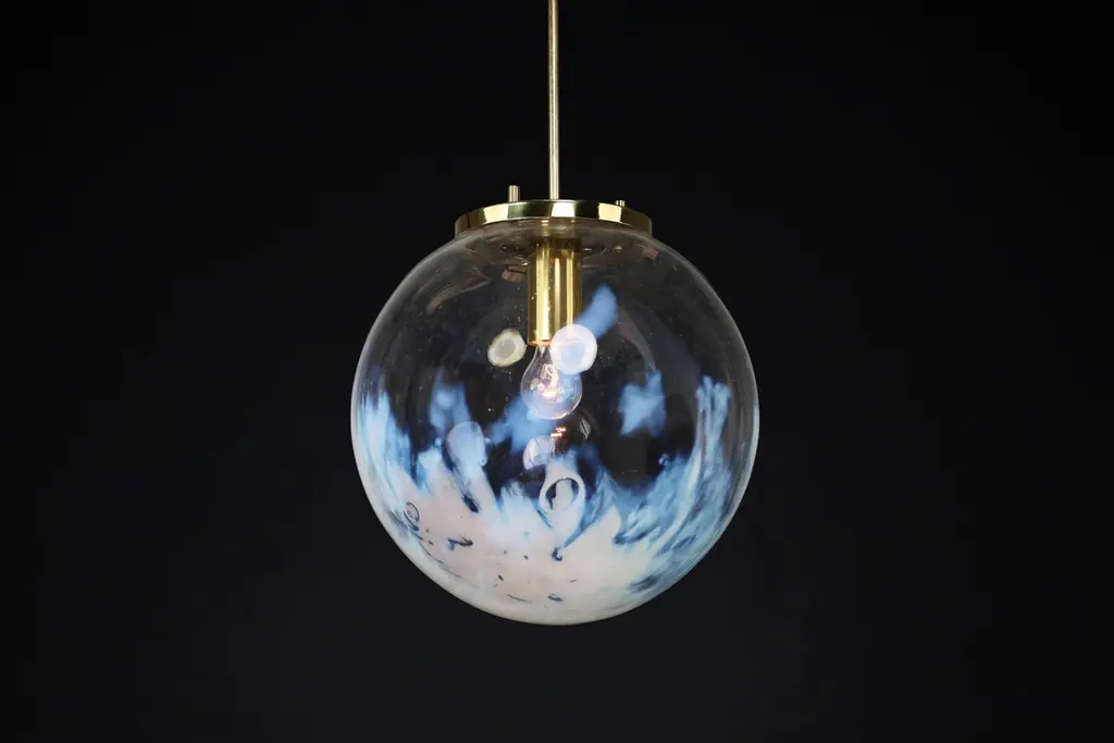 Mid-Century Modern Pendant in Brass and Art-Glass with White Streaks, Czechoslovakia, 1970s(Ø 30 cm, H 80 cm — 12 Available — Priced Per Pendant)This striking mid-century modern pendant light was produced in 1970s Czechoslovakia and exemplifies the era’s blend of refined materials and artistic craftsmanship. Each pendant features a handblown art-glass globe measuring 30 cm in diameter, suspended from elegant brass hardware for a total height of 80 cm.The globes are made from thick, high-quality glass infused with swirling white and pale blue streaks, creating a dreamlike, ethereal appearance. Importantly, each glass globe features a unique pattern, the result of hand-crafted techniques that ensure no two pendants are exactly alike. This individuality makes each piece a true one-of-a-kind work of functional art.The minimalist brass rod and canopy provide a warm contrast to the cool tones of the glass, adding to the pendant’s sophisticated mid-century appeal. The natural patina of the brass enhances its vintage charm.Professionally cleaned and fully rewired, these lights are compatible with international electrical standards (US, UK, EU, Asia) and fitted with standard E27 sockets. They are suitable for both LED and incandescent bulbs.With 12 pendants available, they can be installed individually as statement pieces or grouped for greater visual impact — ideal for residential interiors or commercial spaces looking to incorporate authentic vintage character.Each pendant is priced individually.This is a timeless piece of Czech mid-century design that pairs functionality with sculptural elegance, offering a distinctive and atmospheric lighting solution.