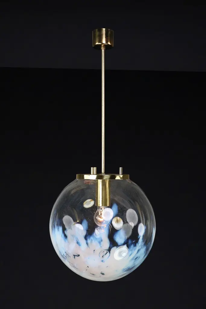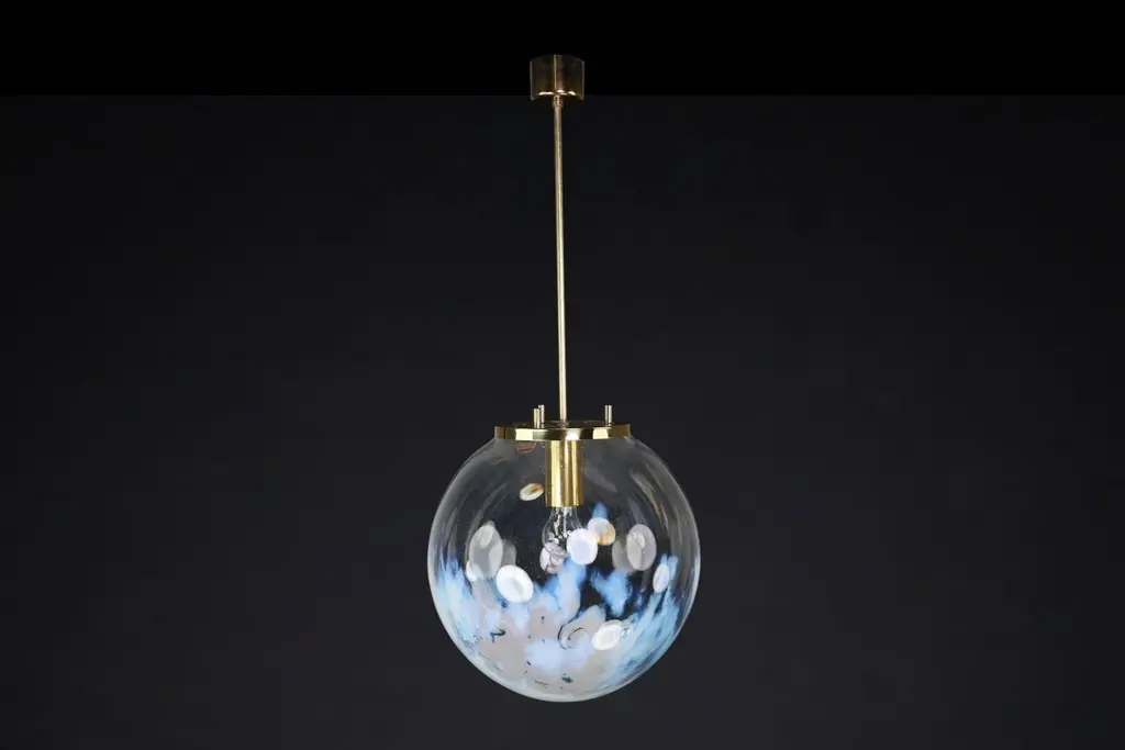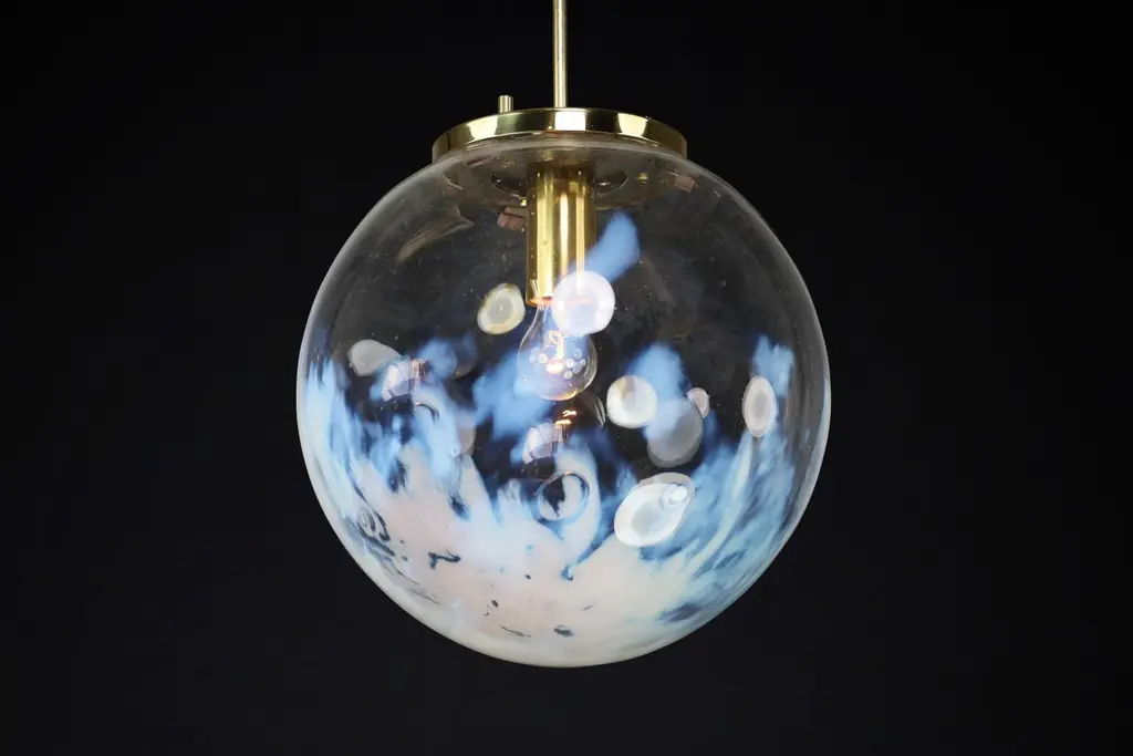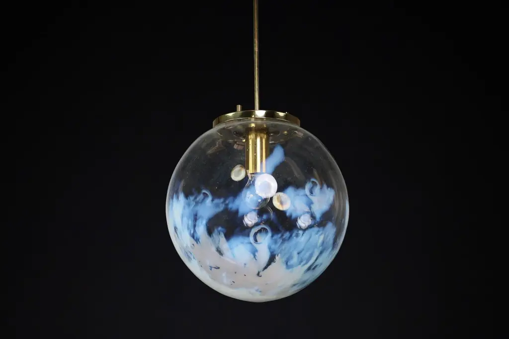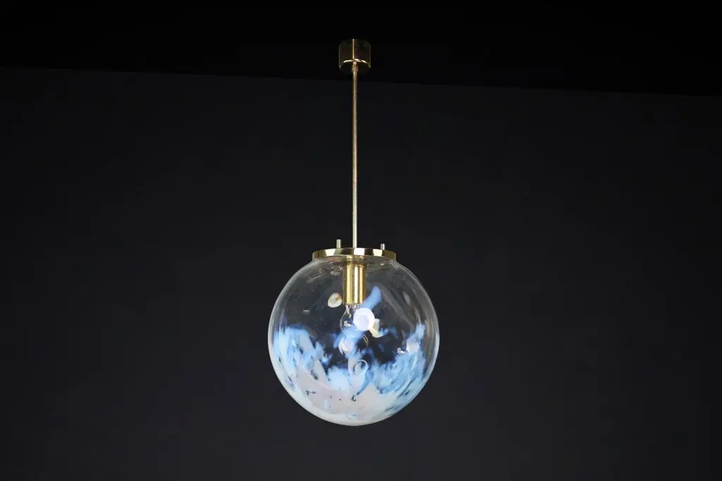 Mid-Century Modern Pendant in Brass and Art-Glass with White Streaks, Czechoslovakia, 1970s(Ø 30 cm, H 80 cm — 12 Available — Priced Per Pendant)This striking mid-century modern pendant light was produced in 1970s Czechoslovakia and exemplifies the era’s blend of refined materials and artistic craftsmanship. Each pendant features a handblown art-glass globe measuring 30 cm in diameter, suspended from elegant brass hardware for a total height of 80 cm.The globes are made from thick, high-quality glass infused with swirling white and pale blue streaks, creating a dreamlike, ethereal appearance. Importantly, each glass globe features a unique pattern, the result of hand-crafted techniques that ensure no two pendants are exactly alike. This individuality makes each piece a true one-of-a-kind work of functional art.The minimalist brass rod and canopy provide a warm contrast to the cool tones of the glass, adding to the pendant’s sophisticated mid-century appeal. The natural patina of the brass enhances its vintage charm.Professionally cleaned and fully rewired, these lights are compatible with international electrical standards (US, UK, EU, Asia) and fitted with standard E27 sockets. They are suitable for both LED and incandescent bulbs.With 12 pendants available, they can be installed individually as statement pieces or grouped for greater visual impact — ideal for residential interiors or commercial spaces looking to incorporate authentic vintage character.Each pendant is priced individually.This is a timeless piece of Czech mid-century design that pairs functionality with sculptural elegance, offering a distinctive and atmospheric lighting solution.