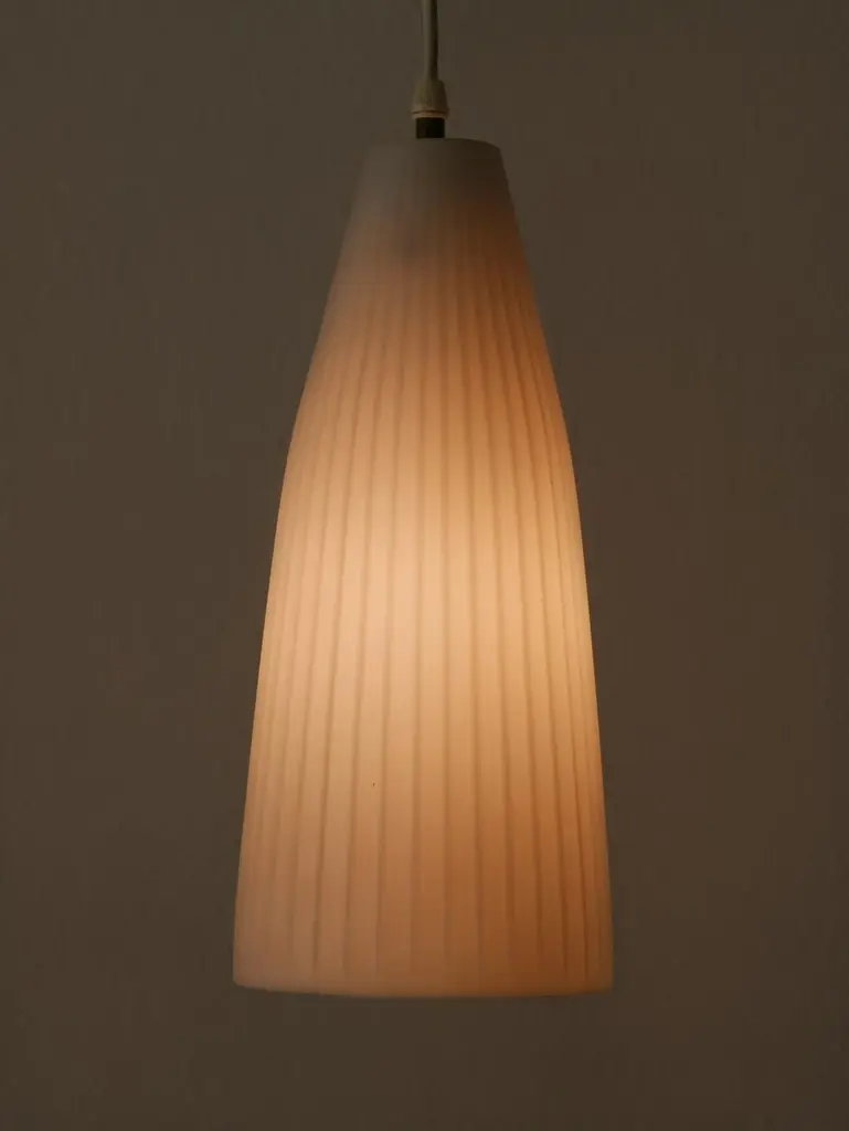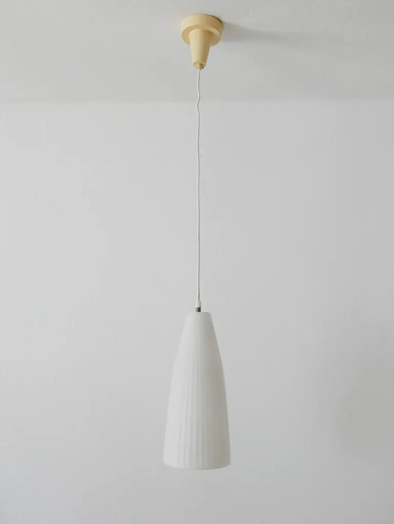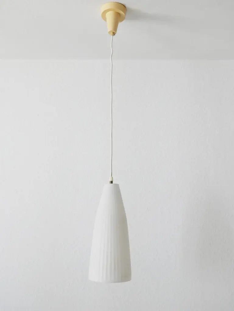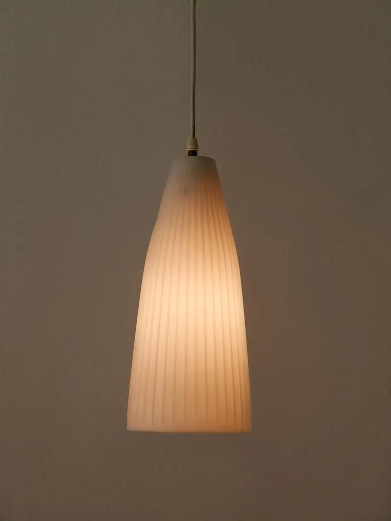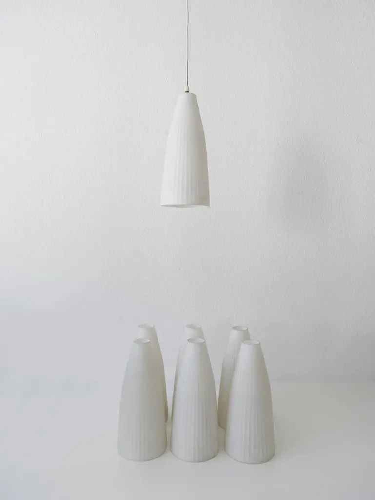Elegant Mid-Century Modern pendant lamp or hanging light. Designed by Aloys Ferdinand Gangkofner and manufactured by Peill & Putzler, Dueren, Germany, 1950s.Executed in opaline glass, each lamp needs 1 x E27 Edison screw fit bulb, is wired, and in working condition. It runs both on 110 / 230 Volt.Our lights are checked, cleaned and suitable for use in the USA. Dimensions:Dm 6.11 in. (15.5 cm)H 13.39 in. (34 cm)Adjustable hanging heightCondition:Good vintage condition. Wear consistent with use and age. Some minor chips or flea bites on the edges of the upper opening. But not visible when they hang.