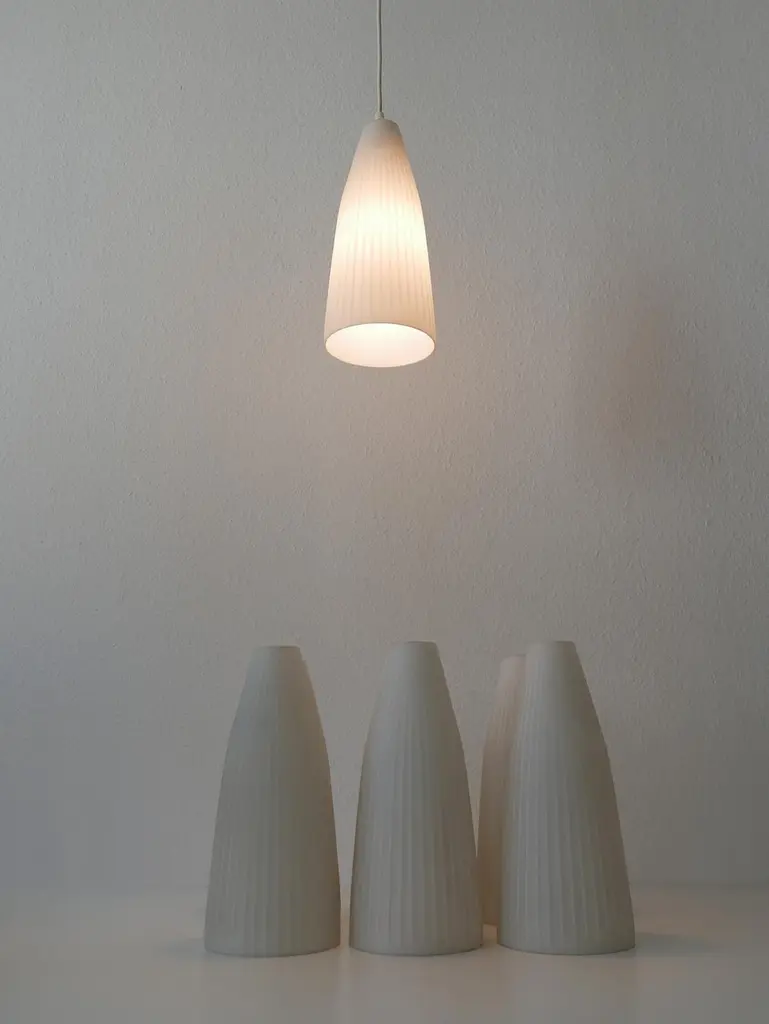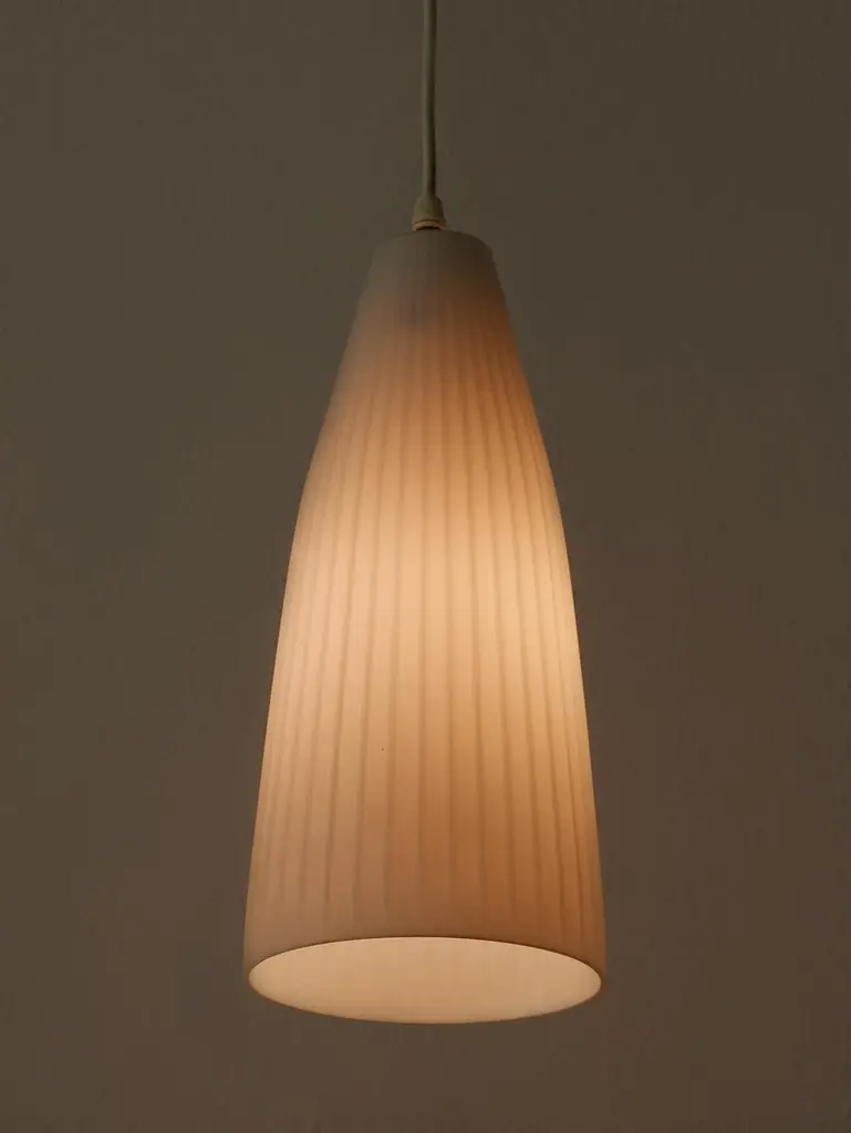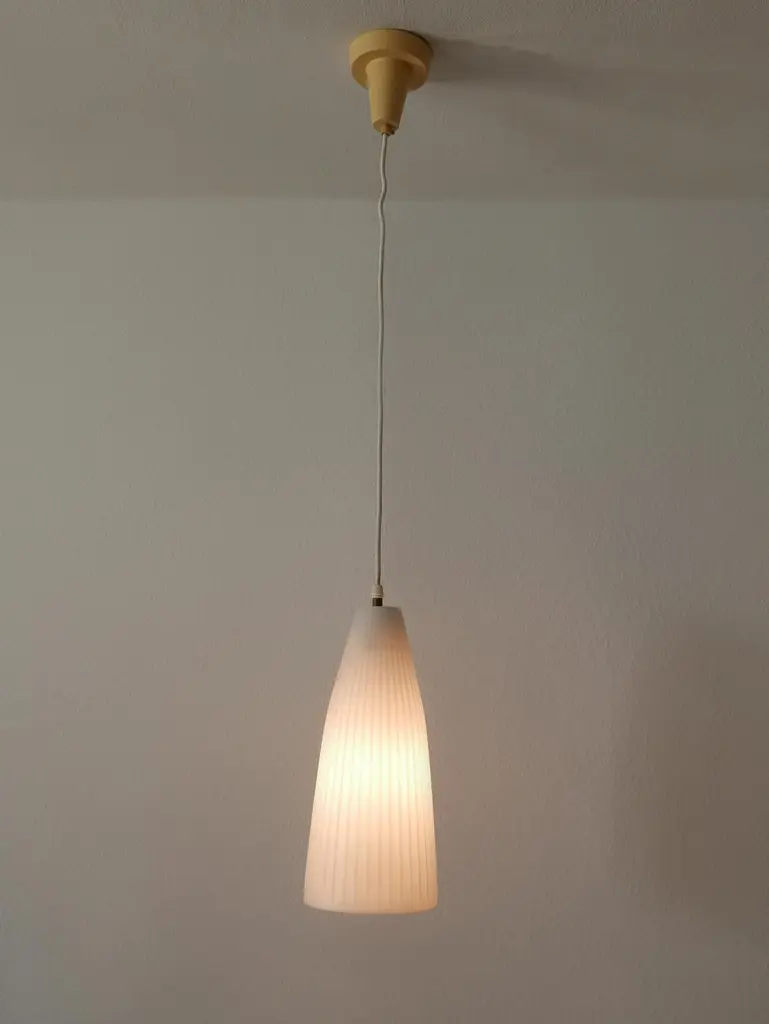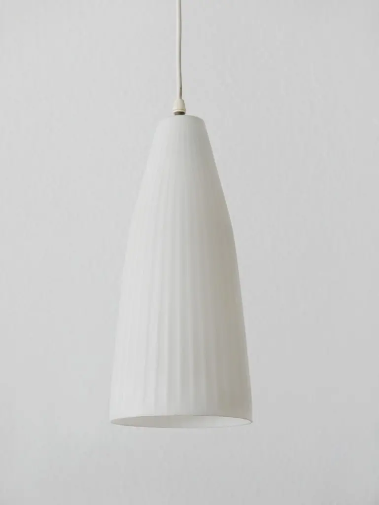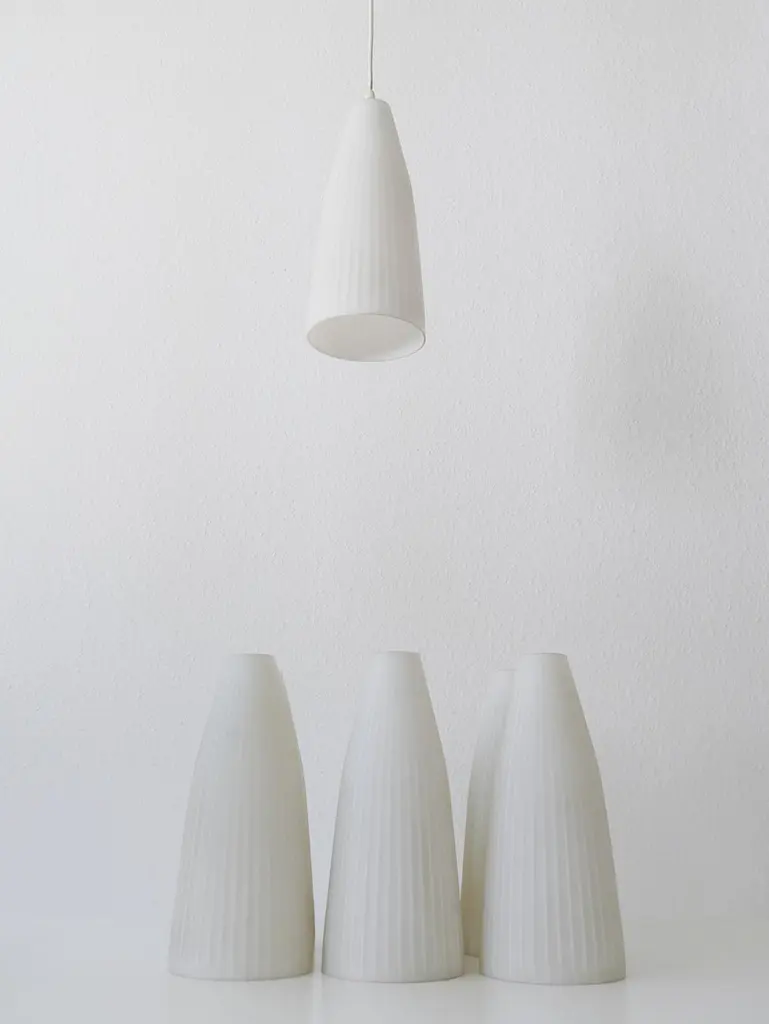 Elegant Mid-Century Modern pendant lamp or hanging light. Designed by Aloys Ferdinand Gangkofner and manufactured by Peill & Putzler, Dueren, Germany, 1950s.Executed in opaline glass, each lamp needs 1 x E27 Edison screw fit bulb, is wired, and in working condition. It runs both on 110 / 230 Volt.Our lights are checked, cleaned and suitable for use in the USA. Dimensions:Dm 6.11 in. (15.5 cm)H 13.39 in. (34 cm)Adjustable hanging heightCondition:Good vintage condition. Wear consistent with use and age. Some minor chips or flea bites on the edges of the upper opening. But not visible when they hang.