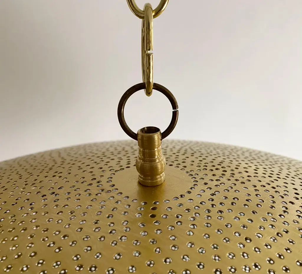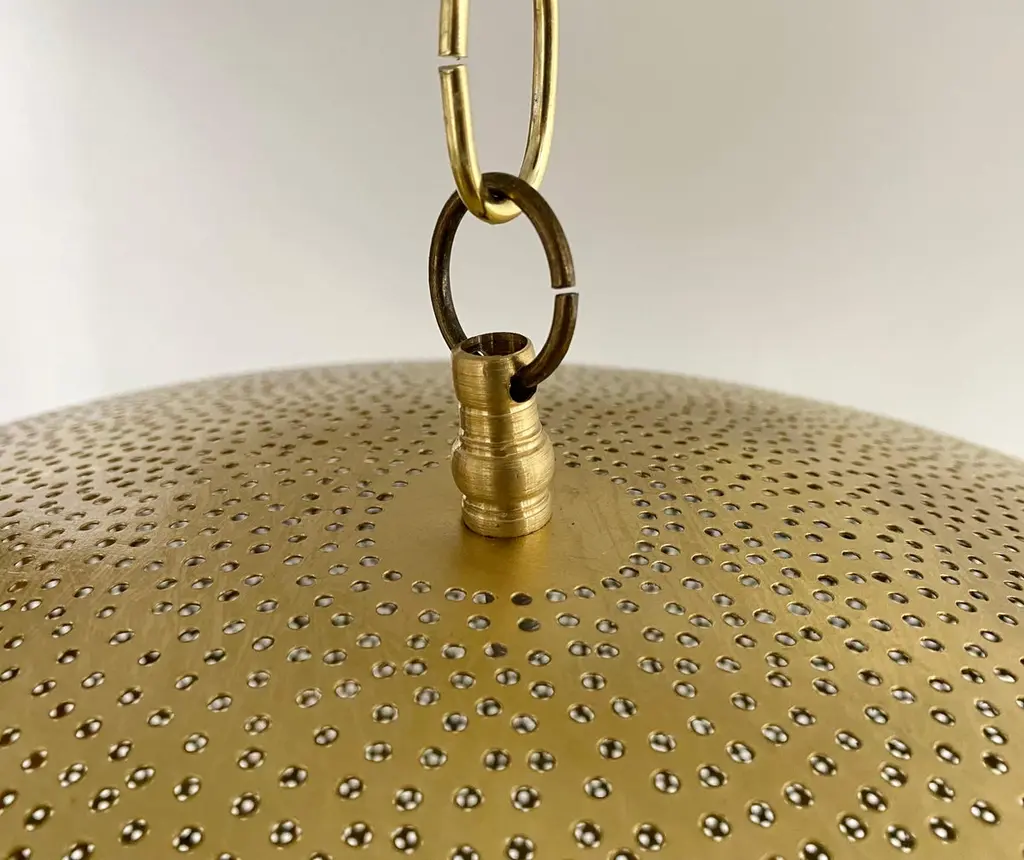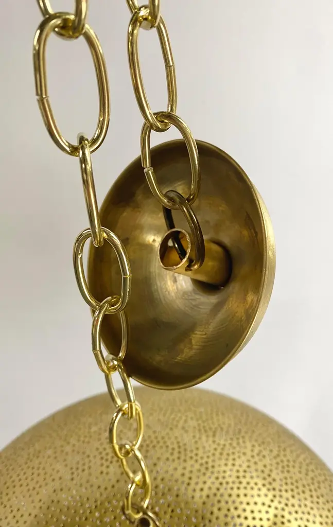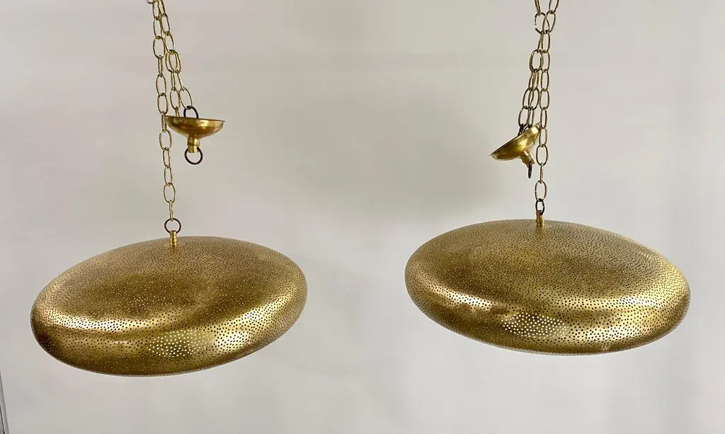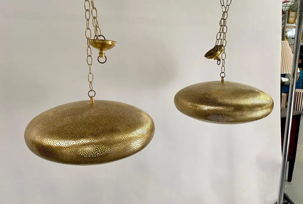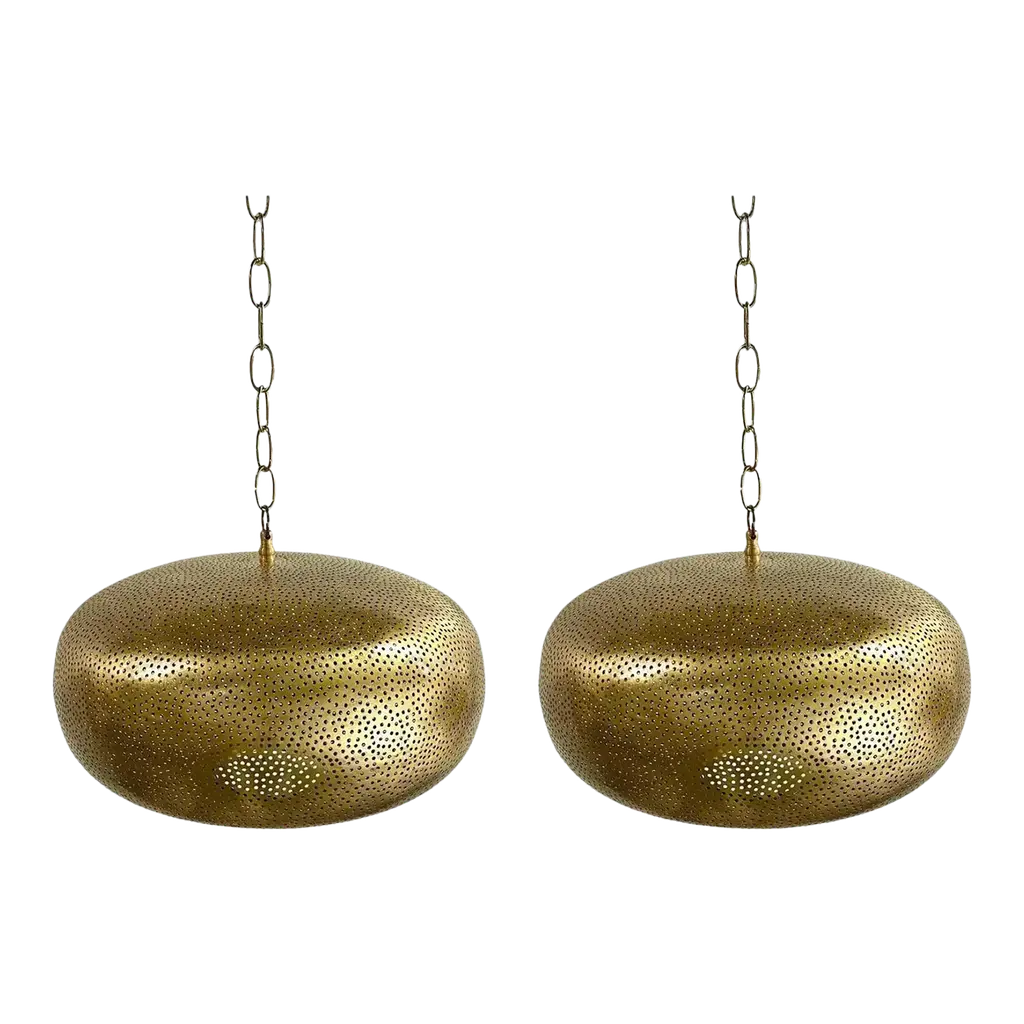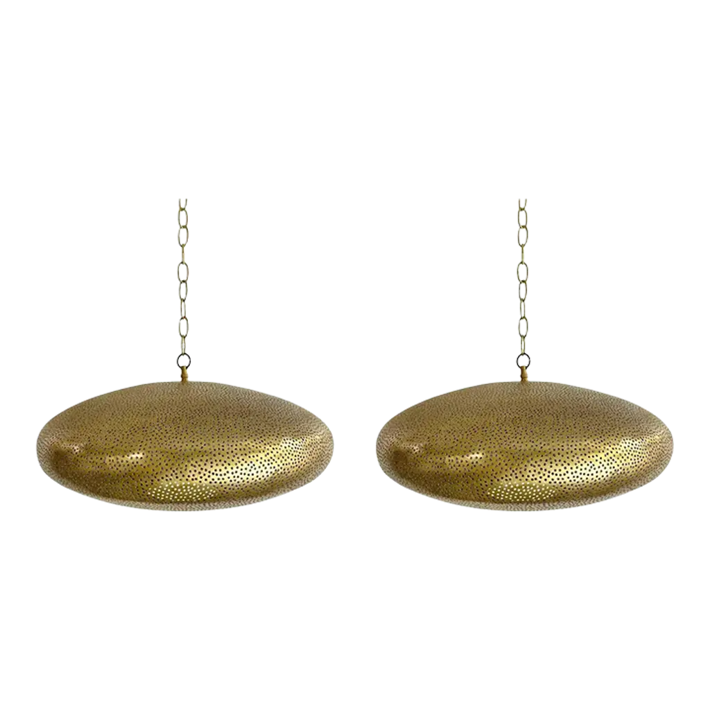 A pair of Mid- century Modern style all brass pendants or lanterns. Featuring a spaceship oval shape, these stylish pair of pendants are handmade of high quality brass and finely hand-tooled producing a soft ambient lighting perfect to elevate the mood complement aesthetic harmony. The pendants come with a 3 feet chain and canopy as shown in the photos. Each has one bulb. Dimensions: 7.5” H x 19” D.