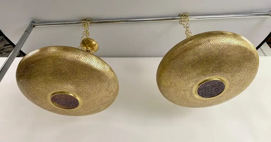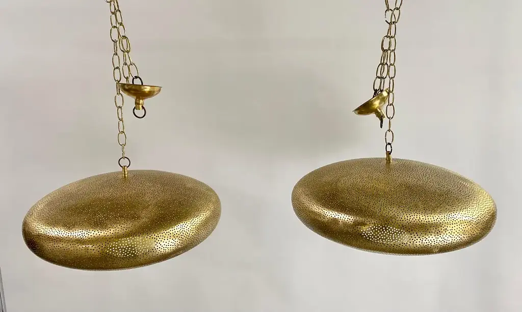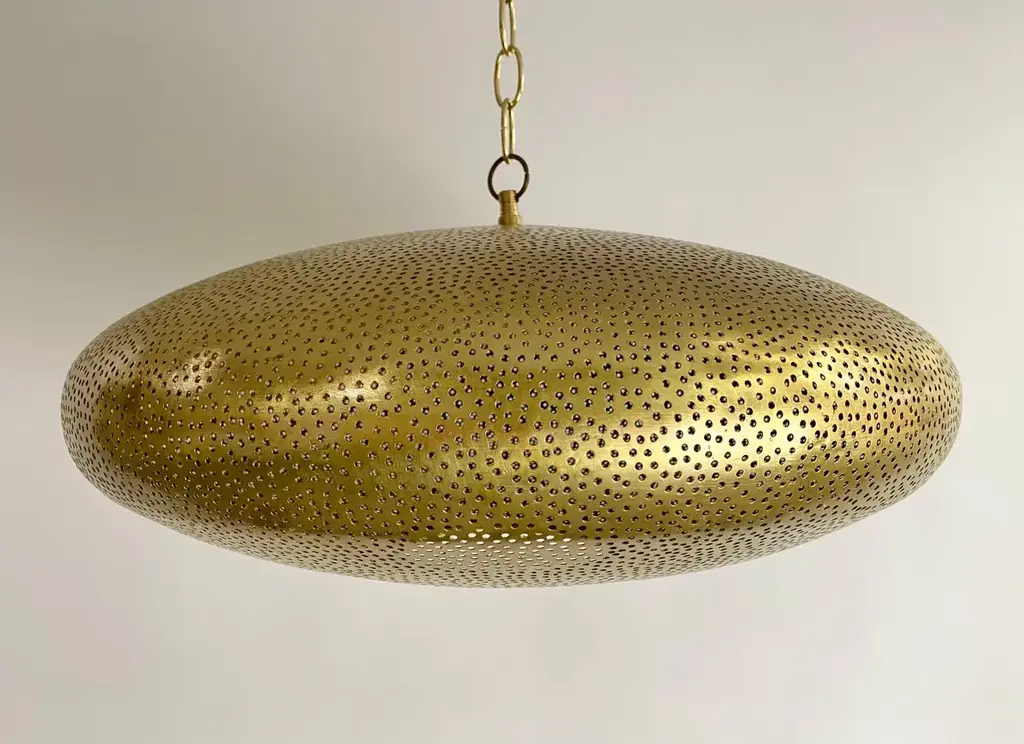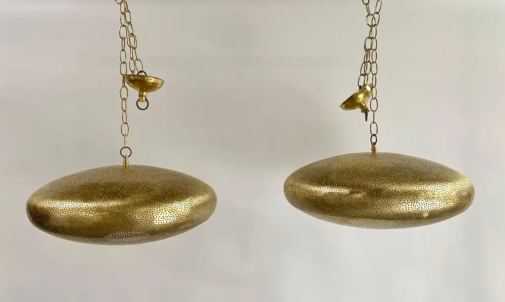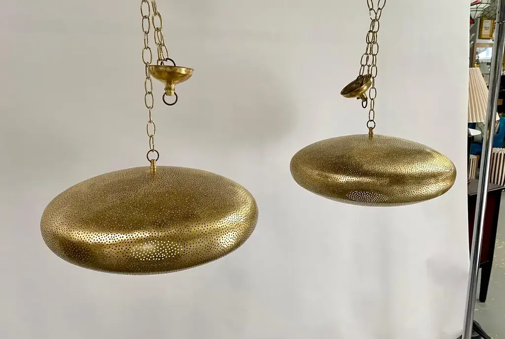 A pair of Mid- century Modern style all brass pendants or lanterns. Featuring a spaceship oval shape, these stylish pair of pendants are handmade of high quality brass and finely hand-tooled producing a soft ambient lighting perfect to elevate the mood complement aesthetic harmony. The pendants come with a 3 feet chain and canopy as shown in the photos. Each has one bulb. Dimensions: 7.5” H x 19” D