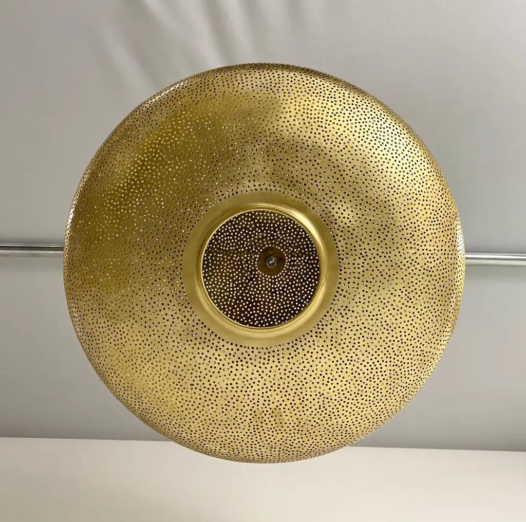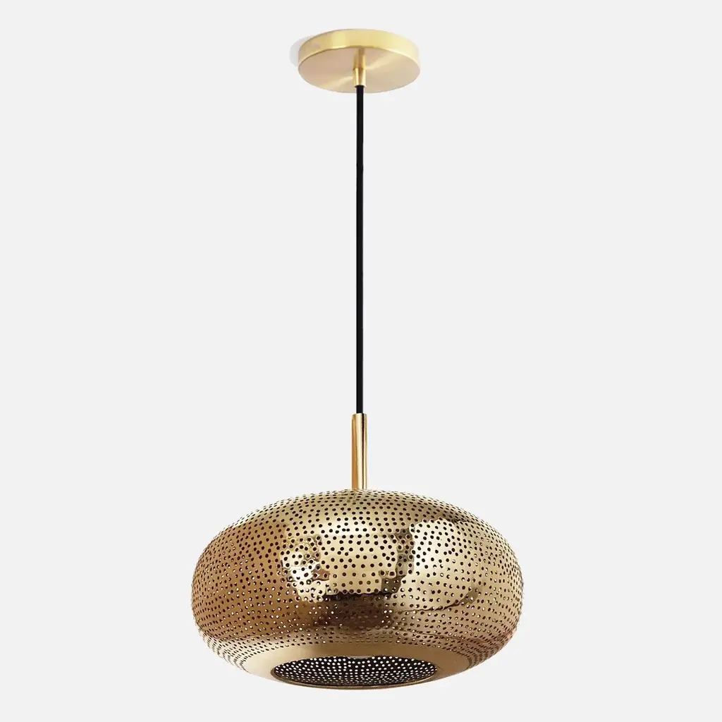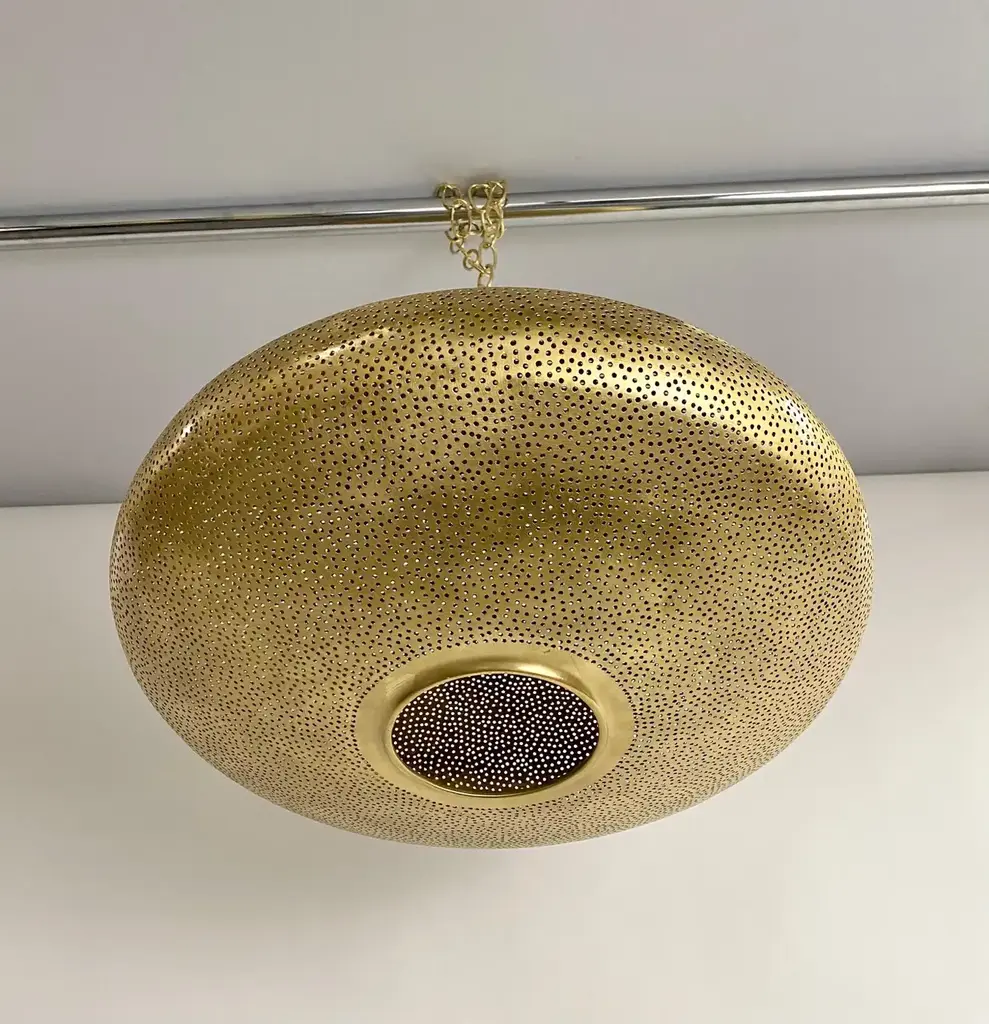 A pair of Mid- century Modern style all brass pendants or lanterns. Featuring a spaceship oval shape, these stylish pair of pendants are handmade of high quality brass and finely hand-tooled producing a soft ambient lighting perfect to elevate the mood complement aesthetic harmony. The pendants come with a 3 feet chain and canopy as shown in the photos. Each has one bulb. Dimensions: 7.5” H x 19” D