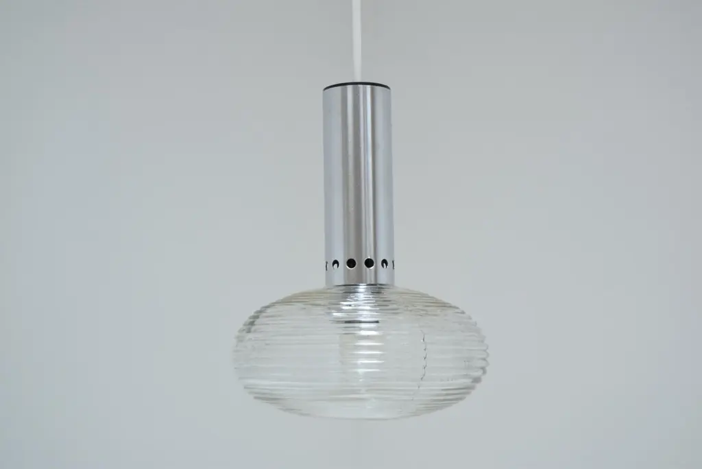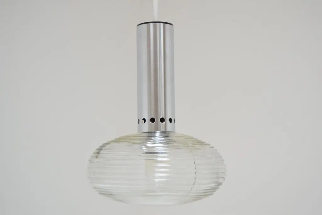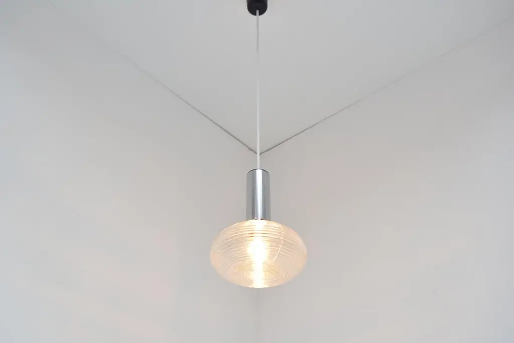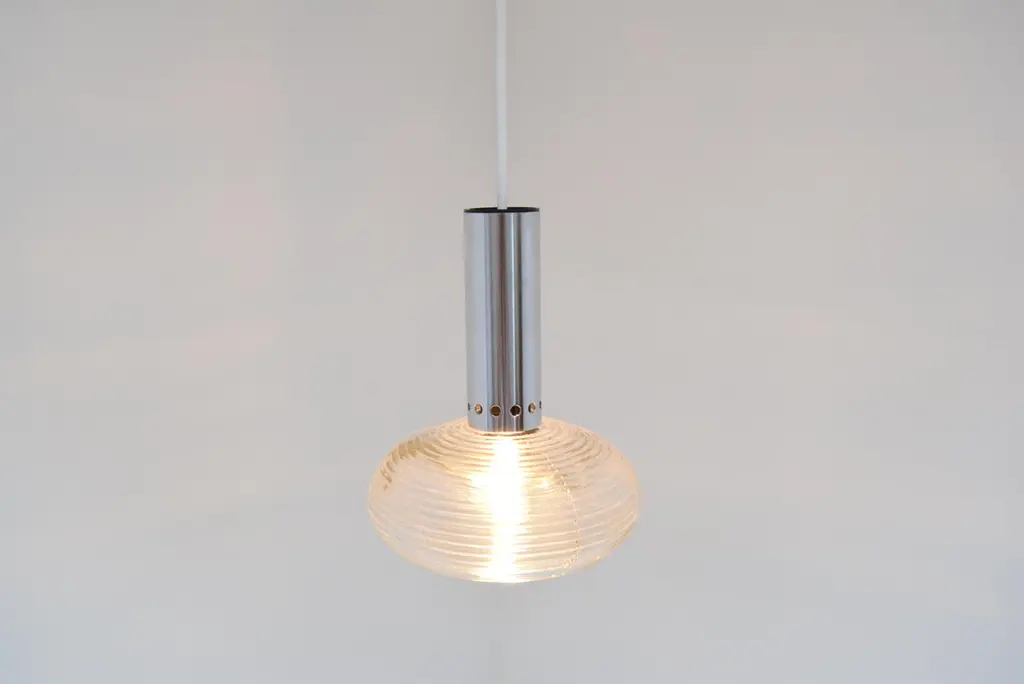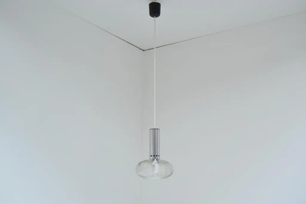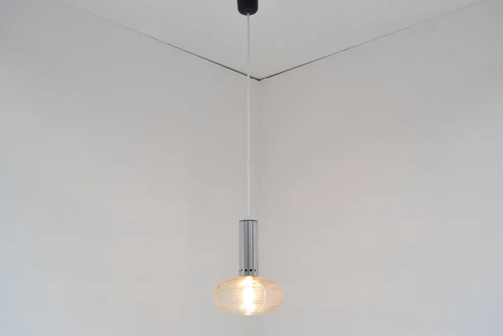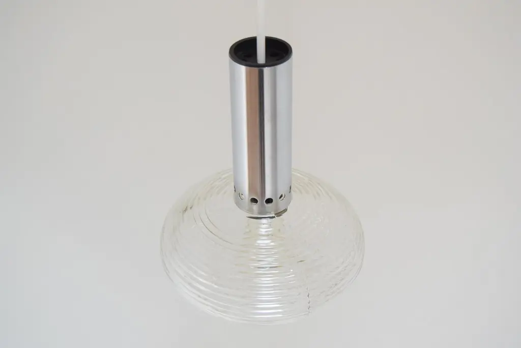 Made in ItalyMade of glass, chrome, plasticThe length of cabling may be shortened4 pieces in stock1xE14 or E15 socketNew cablingRe-polishedFully functional Original condition.