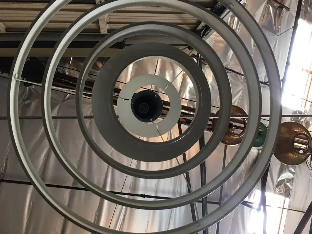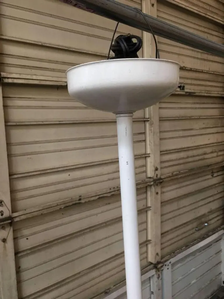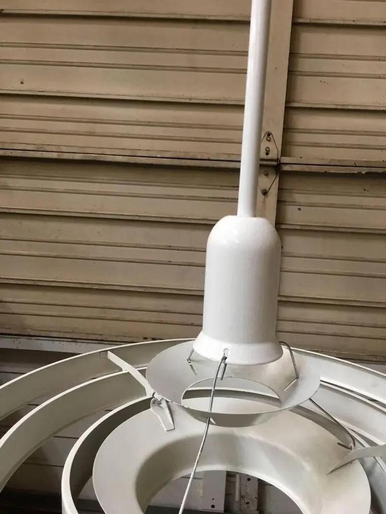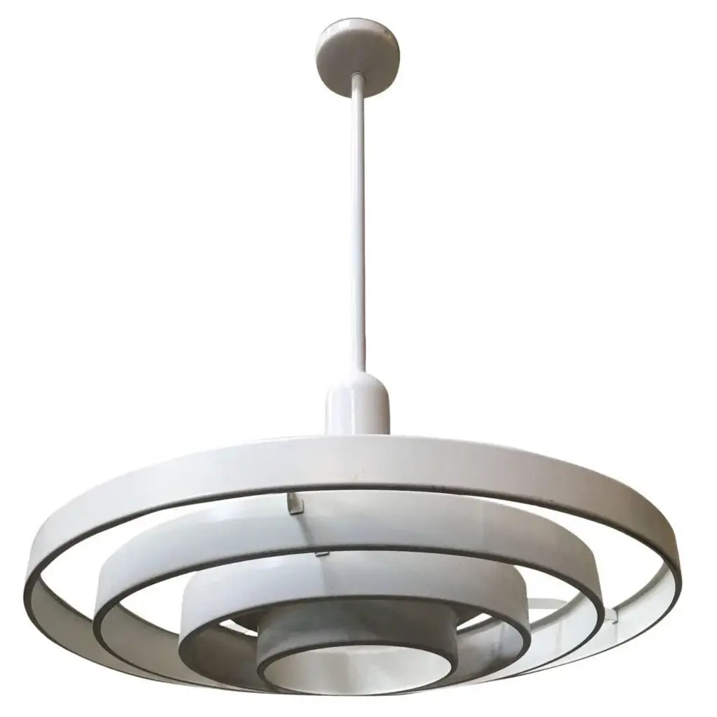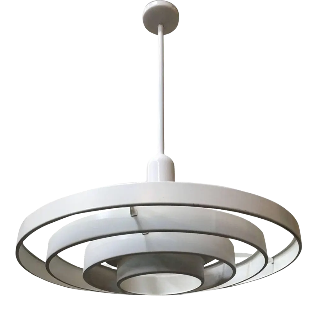 Quantity 22 Available. Kurt Versen designed "Saturn" ceiling light featuring a stacked steel ring light shade suspended by wire to a focused light socket. Altogether this light fixture is 36" tall perfect for large vaulted ceilings. These pendant ceiling lights are usually called UFOs or “Saturn” lights, due to the Saturn-like rings of their design. The form was originally designed by Kurt Versen and they are a good bridge between the Art Deco Industrial and modern Mid-Century design periods, but still following the strict “form follows function” dictate of the Bauhaus school. These lights are true “Industrial” lighting and you could find them in institutional settings with high ceilings and lots of space, such as schools and office buildings. Dimensions: 20" inches. USA, 1950