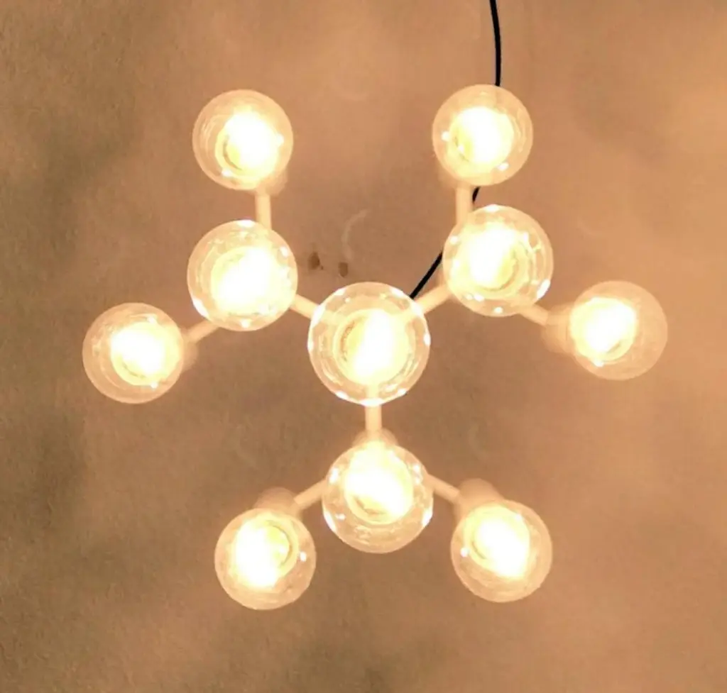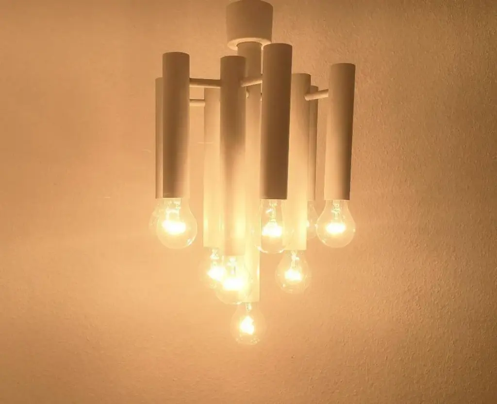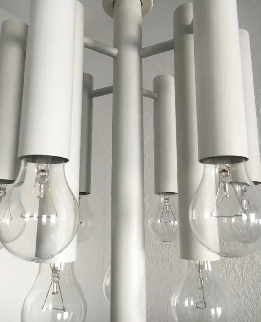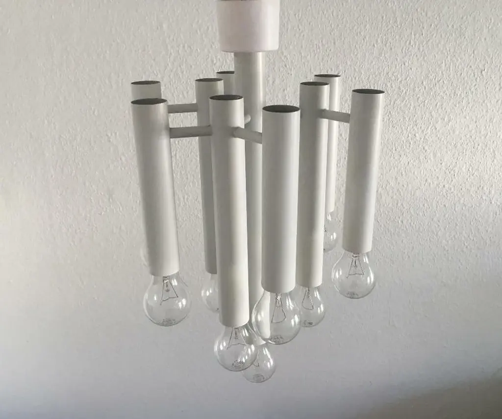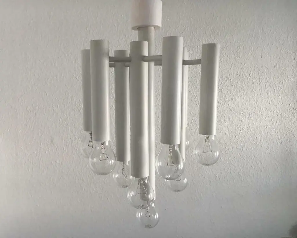 Imposing ceiling lights from temde. Functional light source and at the same time luminous object in the room. A very contemporary chandelier. the lamp consists of a central, long cylinder, around the 9 other cylinders or branches off. The length of the cylinder decreases from the inside out. The bridges for the cylinders are very straight and simple. At the end of each cylinder there is an e27 version. the completely white coloring and the simple shape makes the actual luminaire body rather reserved and factual. An exciting contrast to the radiant lamps. This piece has an attribution mark, i am sure that it is completely authentic and take full responsibility for any authenticity issues arising from misattribution, up to 250v (europe/uk standard).the wiring of this item may be original and might need replacement, if not specified otherwise.