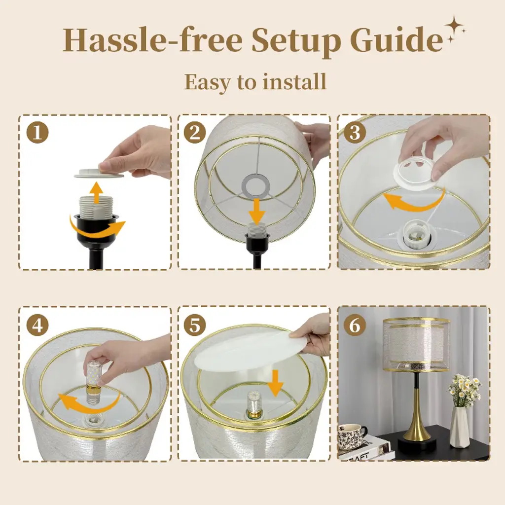 This table lamp is absolutely stunning to any side table and bedside table. The unique PC shades have a natural textured look, while the base is finished in gold and remains stable, these features give the lamp design a mid-century vintage touch, making it an ideal choice for those who appreciate retro aesthetics in the homes. This table lamp used for bedroom night tables or living room side tables, creating an aesthetic appeal that nicely transform the overall look of space. The lampshade and gold base are beautifully crafted for a vintage look, it also provides 3 color-changing light that's perfect for works or reading before bed. Great choice if you're looking for a stylish and affordable way to update your space. The table lamp is a versatile, decorative, and practical accessory that offers a multitude of benefits for your home. This essential piece of furniture can serve various purposes, making it an indispensable addition to any room. Whether you need a reliable reading companion in a cozy nook, a stylish decorative accent, or an atmospheric lighting, it can transform your space and enhance your overall experience.