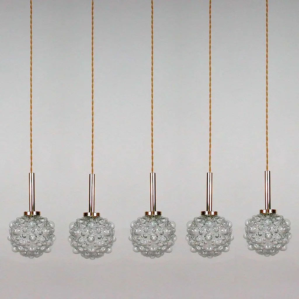This Space Age pendant lamp was designed and manufactured in Germany in the 1960s. It is made of clear bubble glass and has got a brass top. The lamp has been rewired with new gold colored fabric cord (39.4" / 100 cm). All brass pieces have been professionally polished. The lamp comes without canopy.