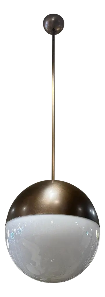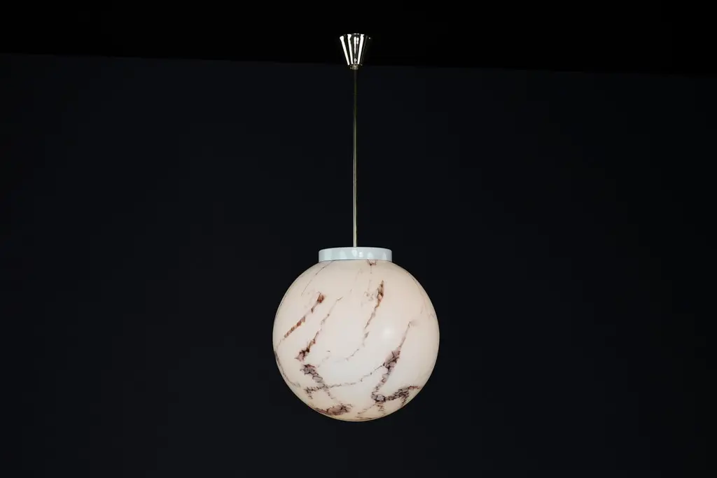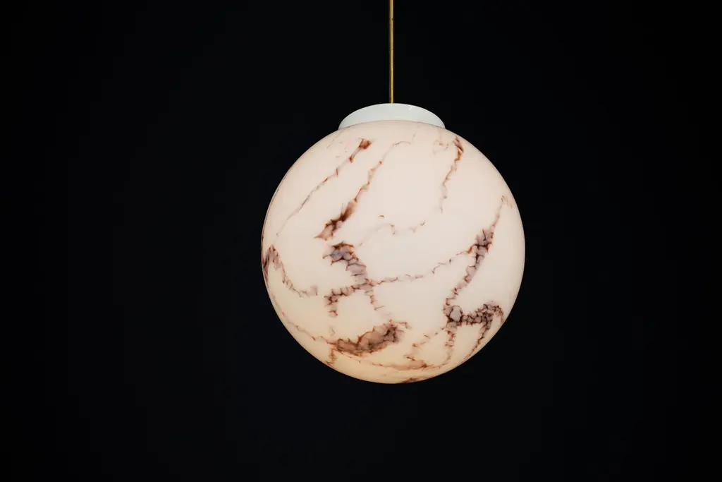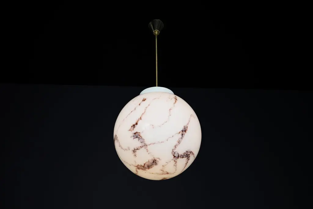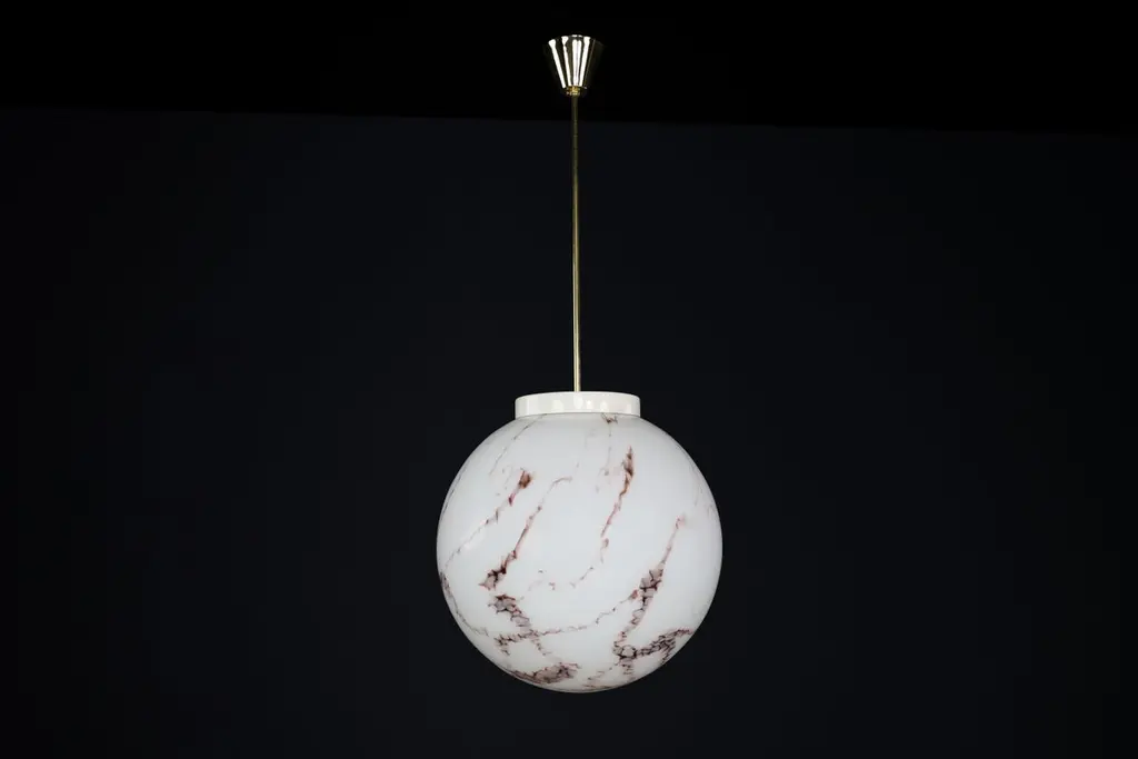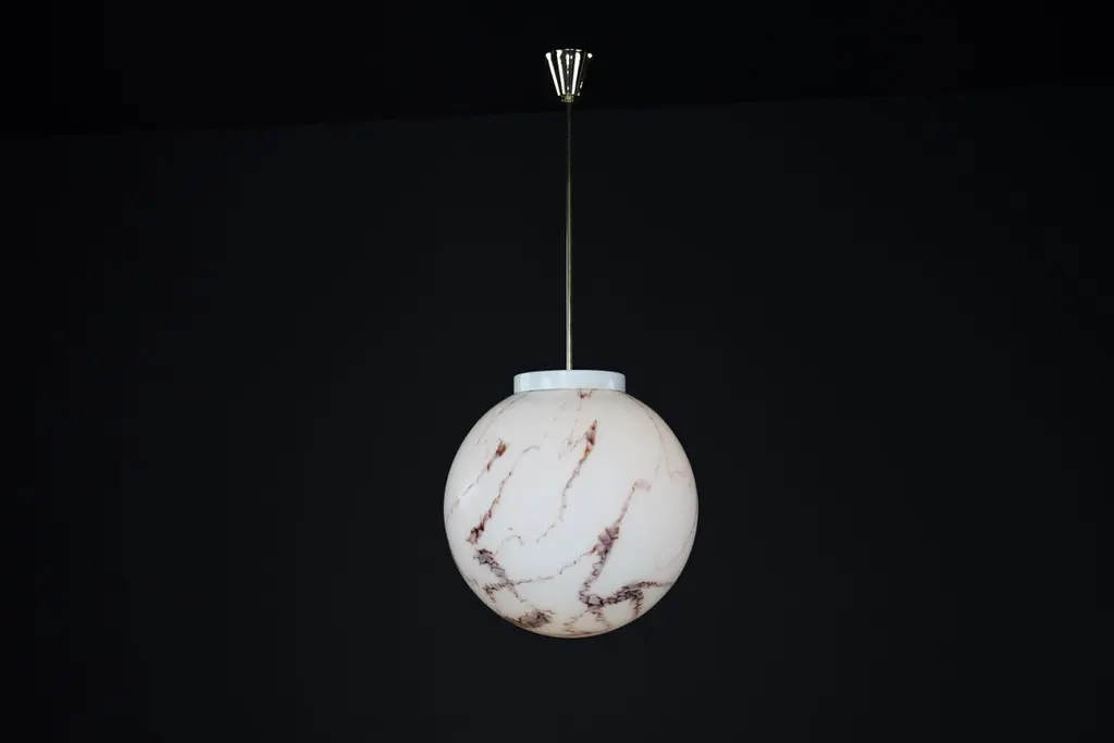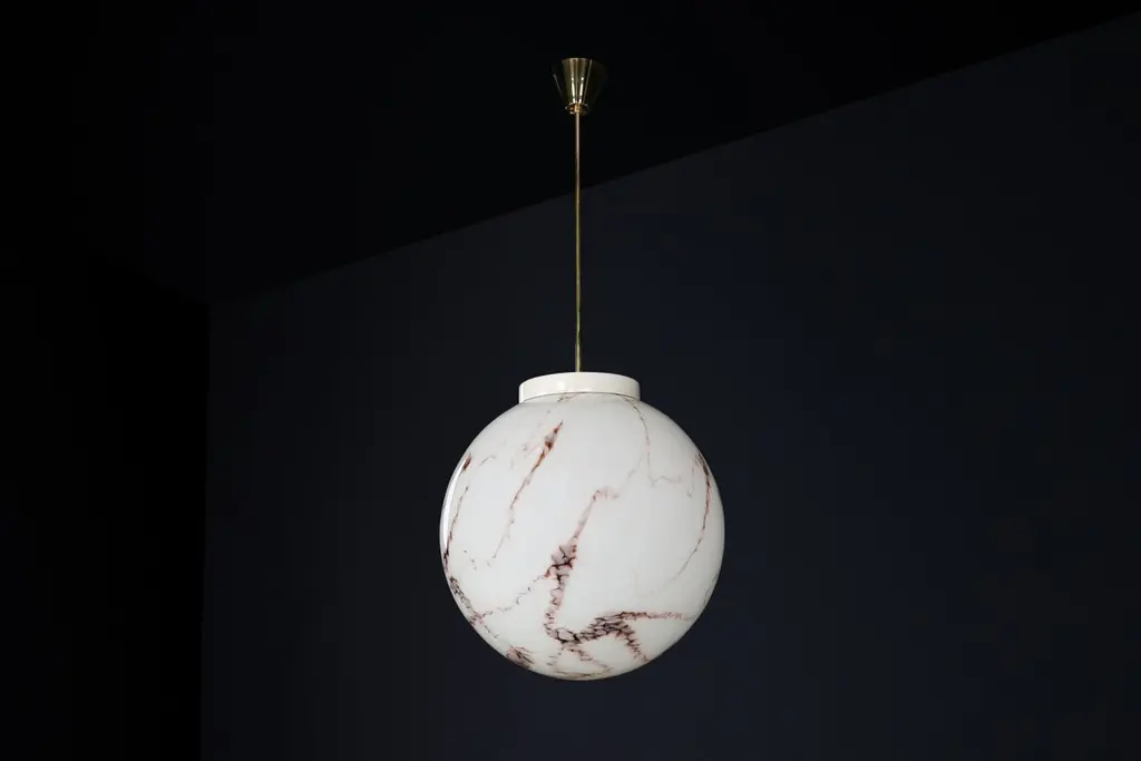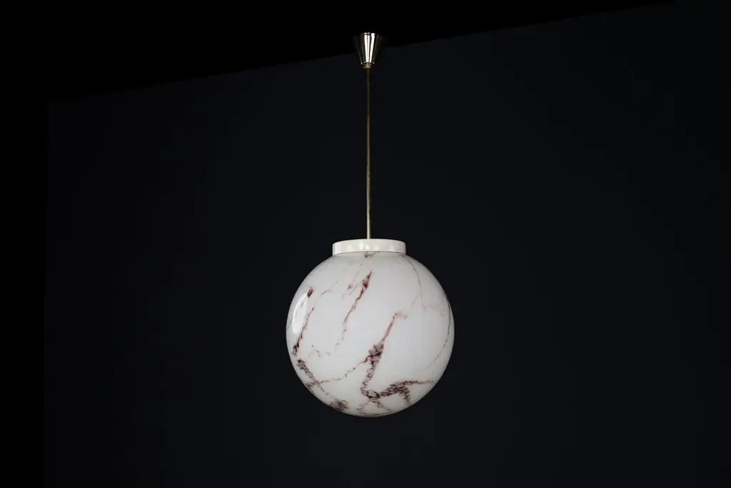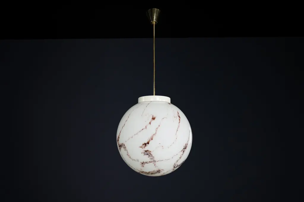 Midcentury Brass and Marble Opaline Glass Pendant, Praque 1950s This midcentury pendant is a versatile piece that can enhance the ambiance of any room. Its brass frame and marble opaline glass globe, resembling expressive veins, create a unique visual. The warm, soft light that filters through the white glass adds a touch of elegance, making it suitable for a dining room, living room, or hallway. Our midcentury pendant light has been meticulously cleaned and re-wired to ensure it is in complete working order and ready for use. It includes one porcelain E27 socket and is compatible with US, UK, and Asia standards and LED lights. While the metal components may exhibit minor patina, the frame is in good condition. Measuring 40 cm in diameter and 95 cm in height, the pendant can be disassembled for easy transport. By opting for used mid-century lighting, you make a responsible and eco-conscious choice, contributing to a sustainable future. This choice revives a high-quality product with a rich history. The stunning patina on the brass elements adds character and tells the story of its previous owner. These delicate and beautiful lights will make a statement in your space.- Size: 40 cm Diameter- Size: 95 cm Height. - Fitted with an E 27 socket suitable for LED. - The lights are compatible with US/UK/ASIA standards. - Cleaned, well-wired, and ready to use. - We can supply any length rod.- 6 pendants are available, and the price is pro pendant.