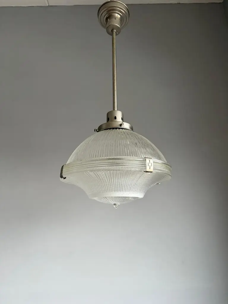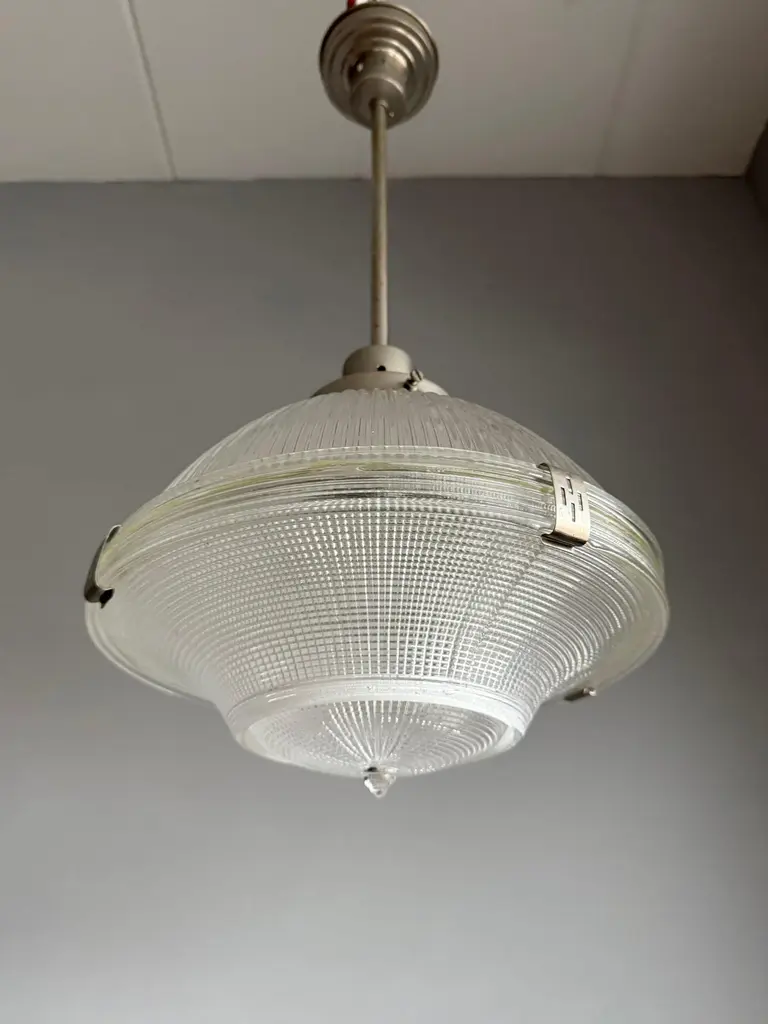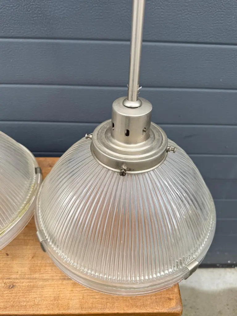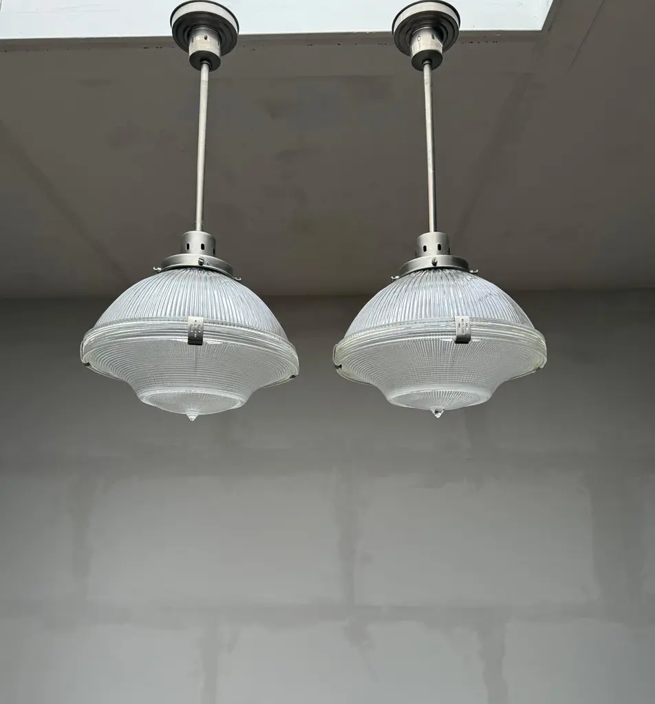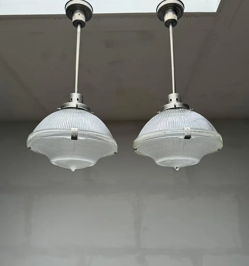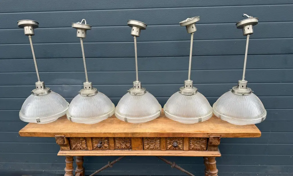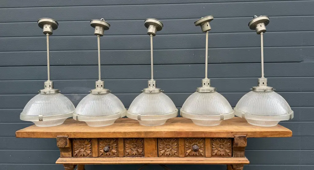 Five identical and good size pendant lights. Will also be sold individually.If you are looking for a group of beautiful and truly timeless pendants for a hallway, a large table or otherwise then this set of five could be your perfect lighting solution. The combination of their stylish design and the perfect light they radiate makes them both aesthetically pleasing and practical. These are made in the Holophane style and the stylish and timeless design of the prismatic glass shades is appealing to clients all over the world. So if you already have a space in mind for them then you could not wish for a more impressive or stylish set of light fixtures. Mind you, this stunning set of five will arrive professionally rewired to the highest standard for safe and immediate usage in the USA as well and they will then take a regular American E26 screwthread bulb of up too 100 watts each (LED as well). Thanks to the hook inside the height adjustable canopy, safely mounting these lights tight to your ceiling (and over your junction box) should take no more than a few minutes either.If you are as impressed by this excellent condition set as we are then you will love our price. Especially when taken into account that perfect packing and worldwide shipping from our store to your door in just 4 to 6 days are complimentary. Maximum height x diameter: 25 x 12.1 inches..We are driven by a passion for uniqueness, timeless, quality, stylish design, and the enduring craftsmanship of the past. Every purchase is carefully and thoughtfully packed — and we look forward to serving you (again).To explore all our 1000+ listings, simply click the button labeled 'View All From Seller'.