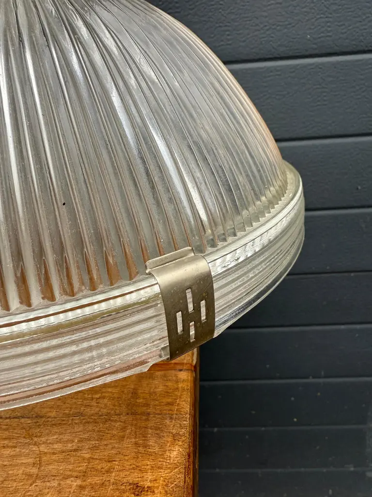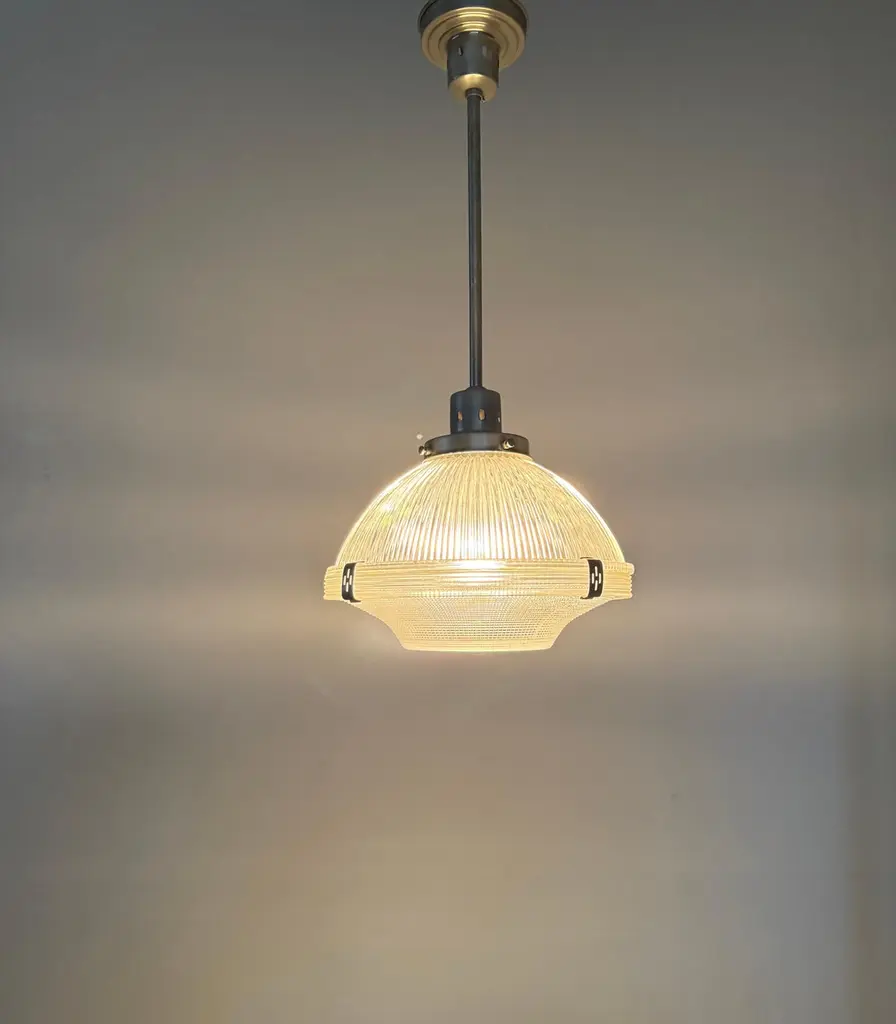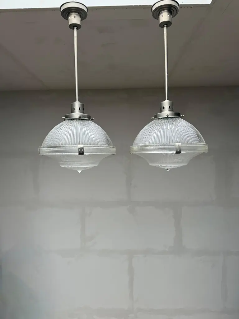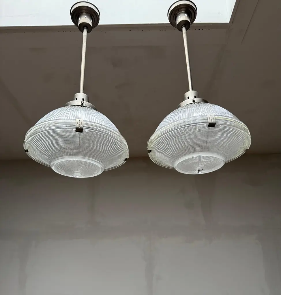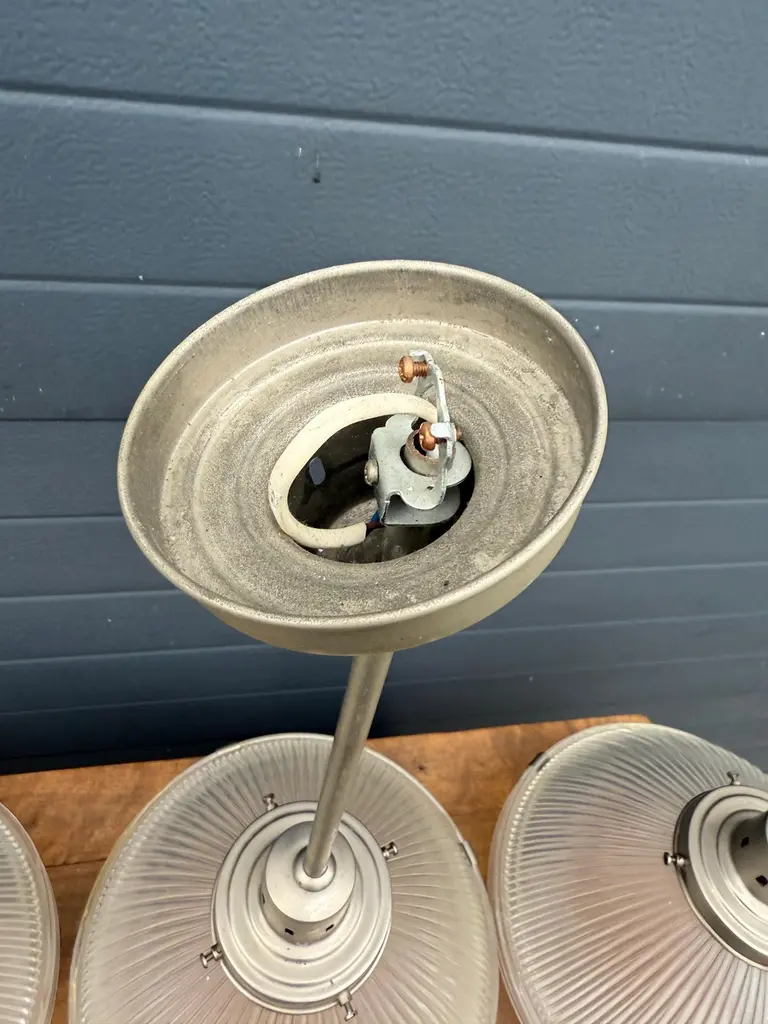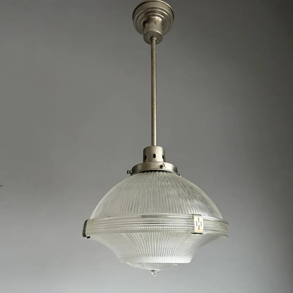 Five identical and good size pendant lights. Will also be sold individually.If you are looking for a group of beautiful and truly timeless pendants for a hallway, a large table or otherwise then this set of five could be your perfect lighting solution. The combination of their stylish design and the perfect light they radiate makes them both aesthetically pleasing and practical. These are made in the Holophane style and the stylish and timeless design of the prismatic glass shades is appealing to clients all over the world. So if you already have a space in mind for them then you could not wish for a more impressive or stylish set of light fixtures. Mind you, this stunning set of five will arrive professionally rewired to the highest standard for safe and immediate usage in the USA as well and they will then take a regular American E26 screwthread bulb of up too 100 watts each (LED as well). Thanks to the hook inside the height adjustable canopy, safely mounting these lights tight to your ceiling (and over your junction box) should take no more than a few minutes either.If you are as impressed by this excellent condition set as we are then you will love our price. Especially when taken into account that perfect packing and worldwide shipping from our store to your door in just 4 to 6 days are complimentary. Maximum height x diameter: 25 x 12.1 inches..We are driven by a passion for uniqueness, timeless, quality, stylish design, and the enduring craftsmanship of the past. Every purchase is carefully and thoughtfully packed — and we look forward to serving you (again).To explore all our 1000+ listings, simply click the button labeled 'View All From Seller'.