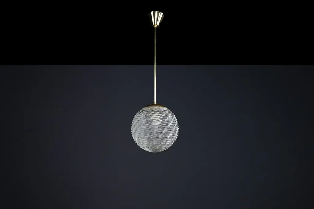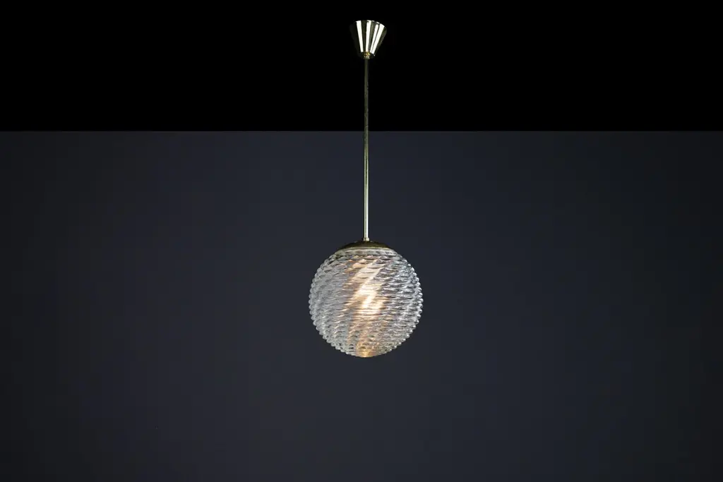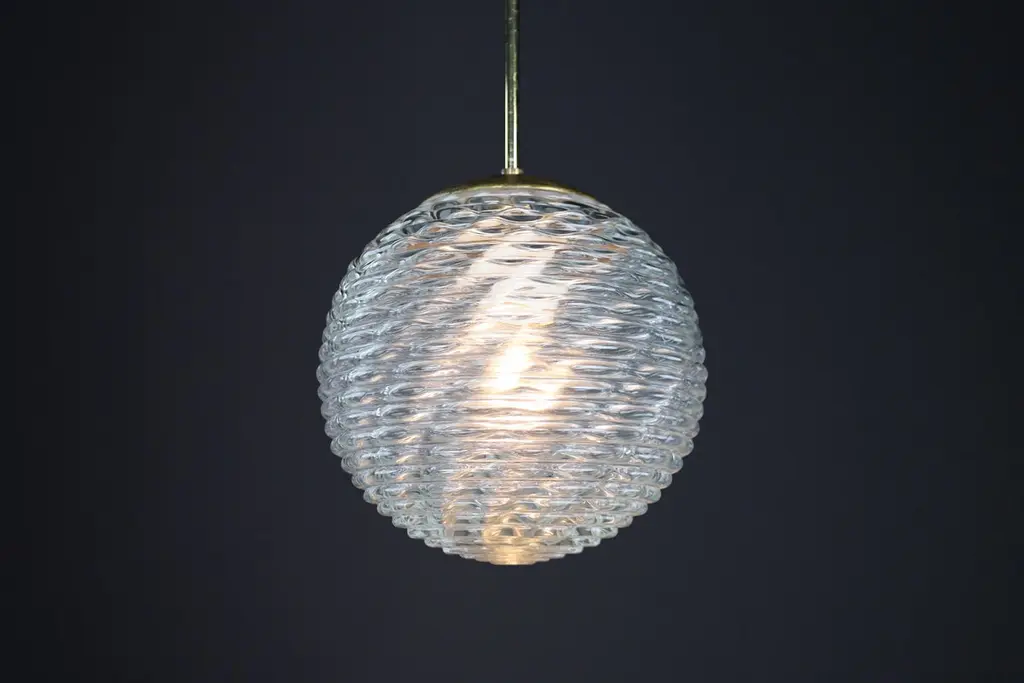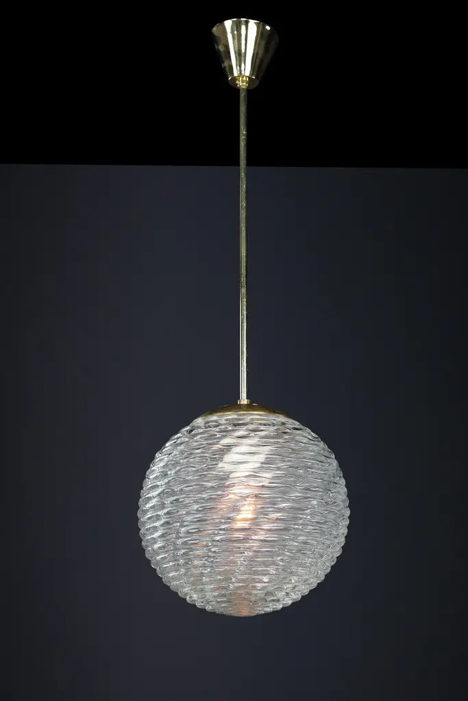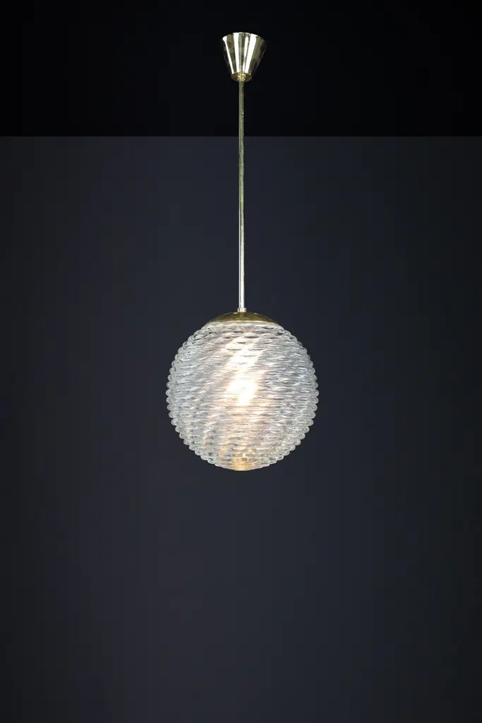 Midcentury-Modern Brass and Pattern Glass Pendant, Prague 1960sThis midcentury pendant is a versatile piece that can enhance the ambiance of any room. Its brass frame and art glass globe, which feature expressive veins, create a unique visual appeal. The patterned glass provides a soft, diffused light effect, casting interesting patterns on the ceiling, walls, and floor. The warm light that filters through the white glass adds a touch of elegance, making it suitable for a dining room, living room, or hallway.Our midcentury pendant light has been professionally cleaned and re-wired to ensure it is in complete working order and ready for use. It includes one porcelain E27 socket and is compatible with US, UK, and Asia standards and LED lights. While the metal components may exhibit minor patina, the frame is in good condition. Measuring 25 cm in diameter and 80 cm in height, the pendant can be disassembled for easy transport. By opting for used mid-century lighting, you make a responsible and eco-conscious choice, contributing to a sustainable future. This choice revives a high-quality product with a rich history. The stunning patina on the brass elements adds character and tells the story of its previous owner. These delicate and beautiful lights will make a statement in your space.- Size: 25 cm Diameter- Size: 80 cm Height. - Fitted with an E 27 socket suitable for LED. - The lights are compatible with US/UK/ASIA standards. - Cleaned, well-wired, and ready to use. - We can supply any length rod.- 12+ pendants are available, and the price is pro pendant.