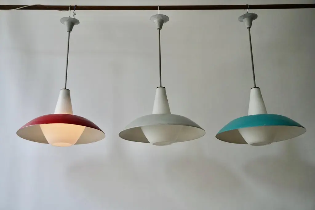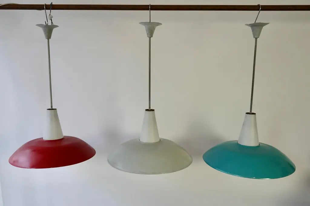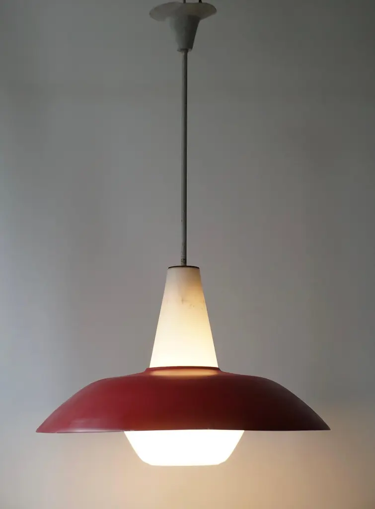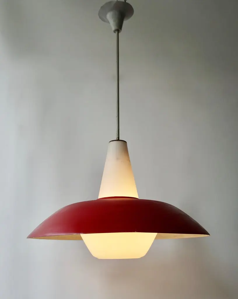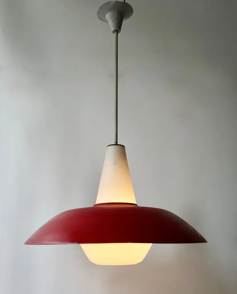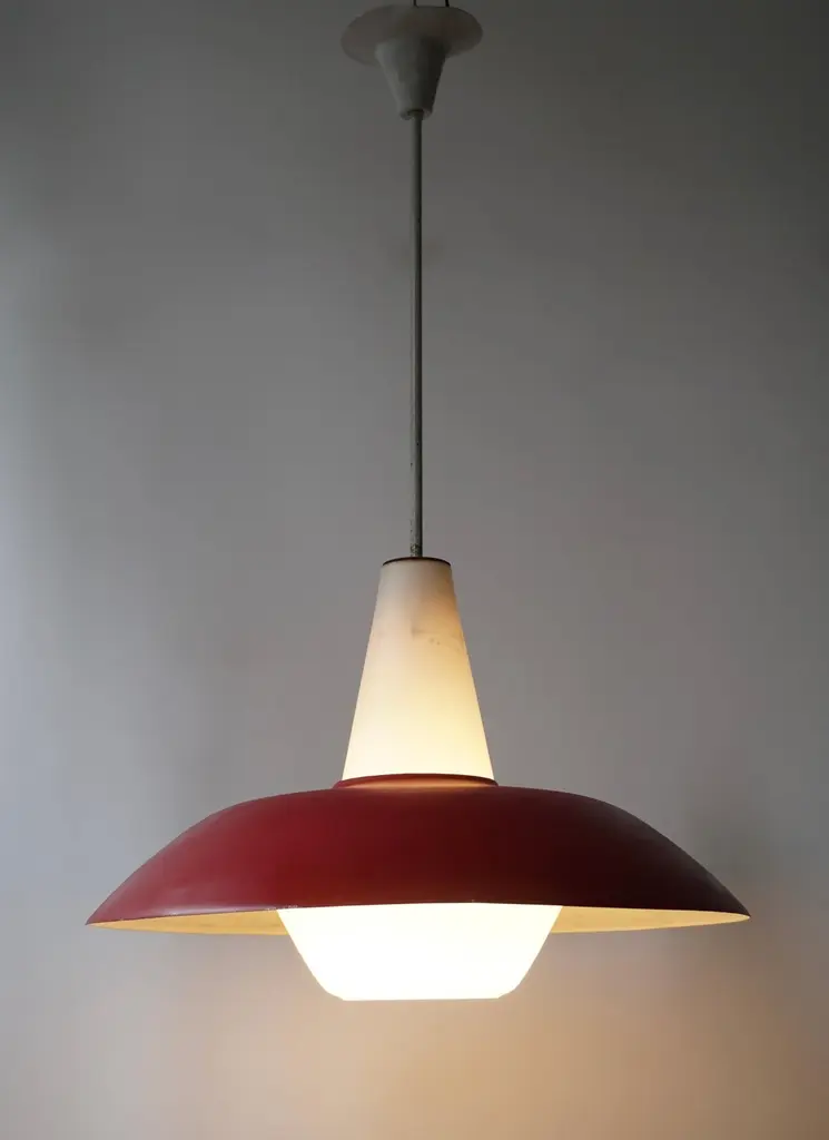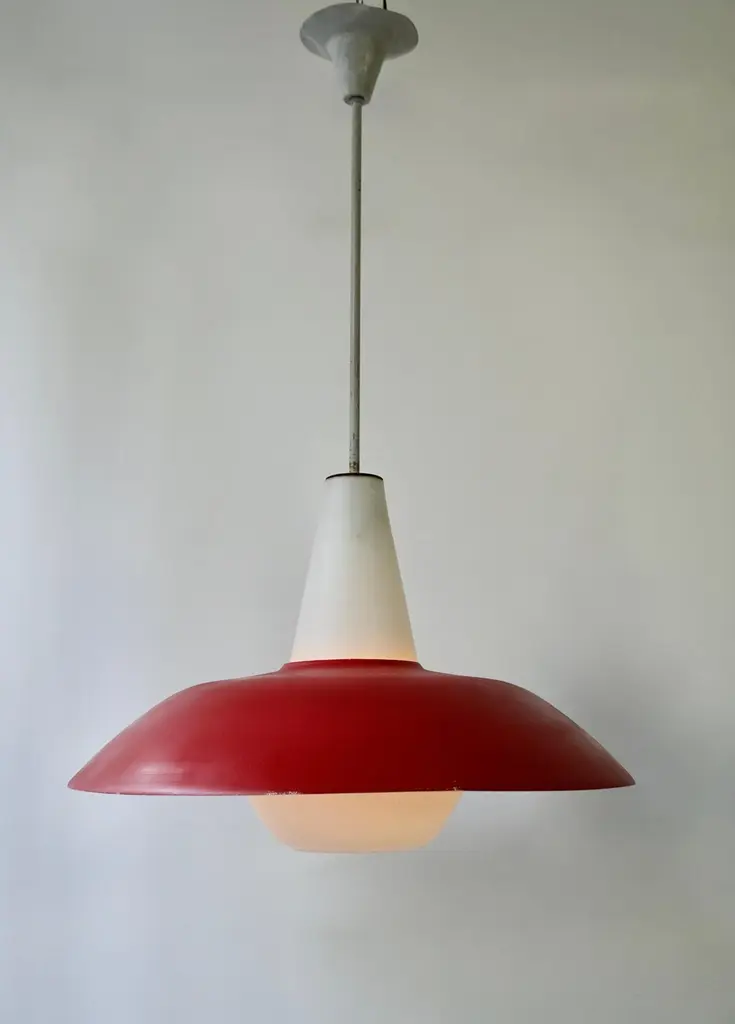 The lights consists of a large red, gray and blue metal shades with opaline glass fitted with one E27 socket.Measures: Diameter 50 cm.Height 80 cm.