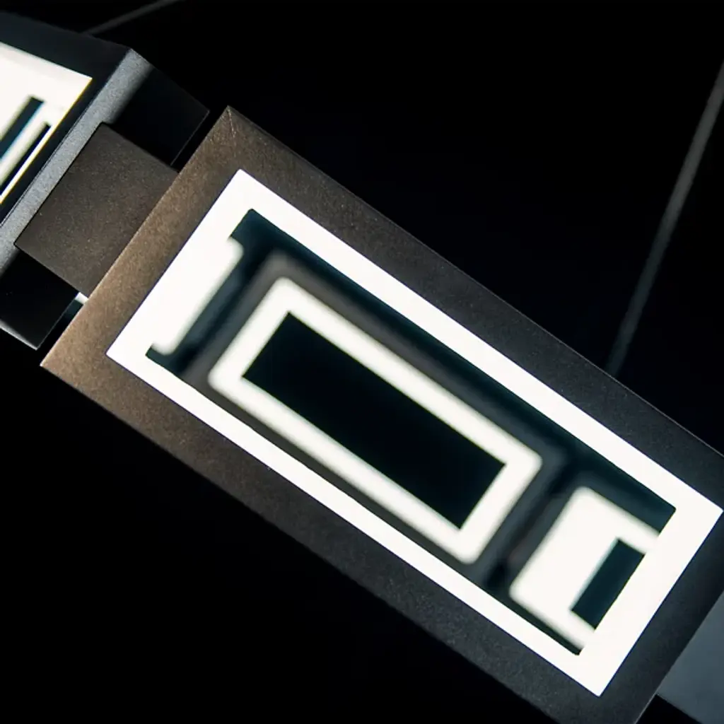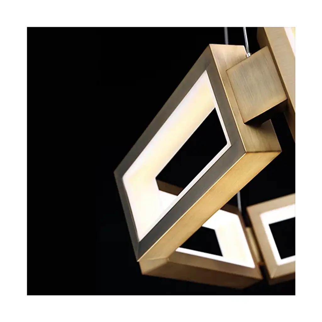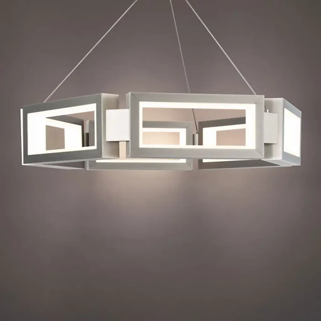 Geometry of light and style. The Mies LED Pendant by Modern Forms is an ode to Ludwig Mies van der Rohe, the pioneer of modern architecture. Aluminum rectangles encasing silica gel diffusers are linked together to form an open hexagonal design for an airy, symmetrical look. The diffusers house energy-efficient LEDs that cast ambient light over an expansive space. This stunning display of art is suspended from a round ceiling canopy with aircraft cables. Install it in your living space, dining room, or bedroom to infuse an air of drama.
