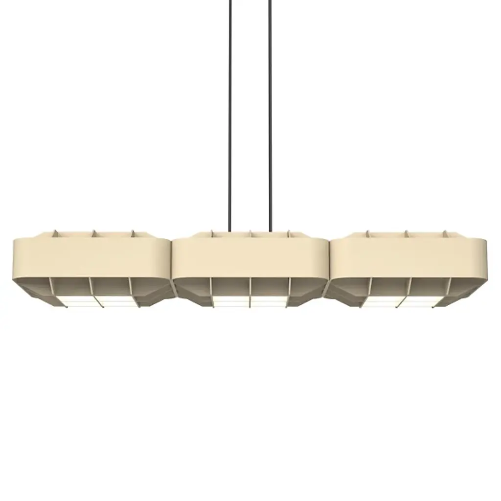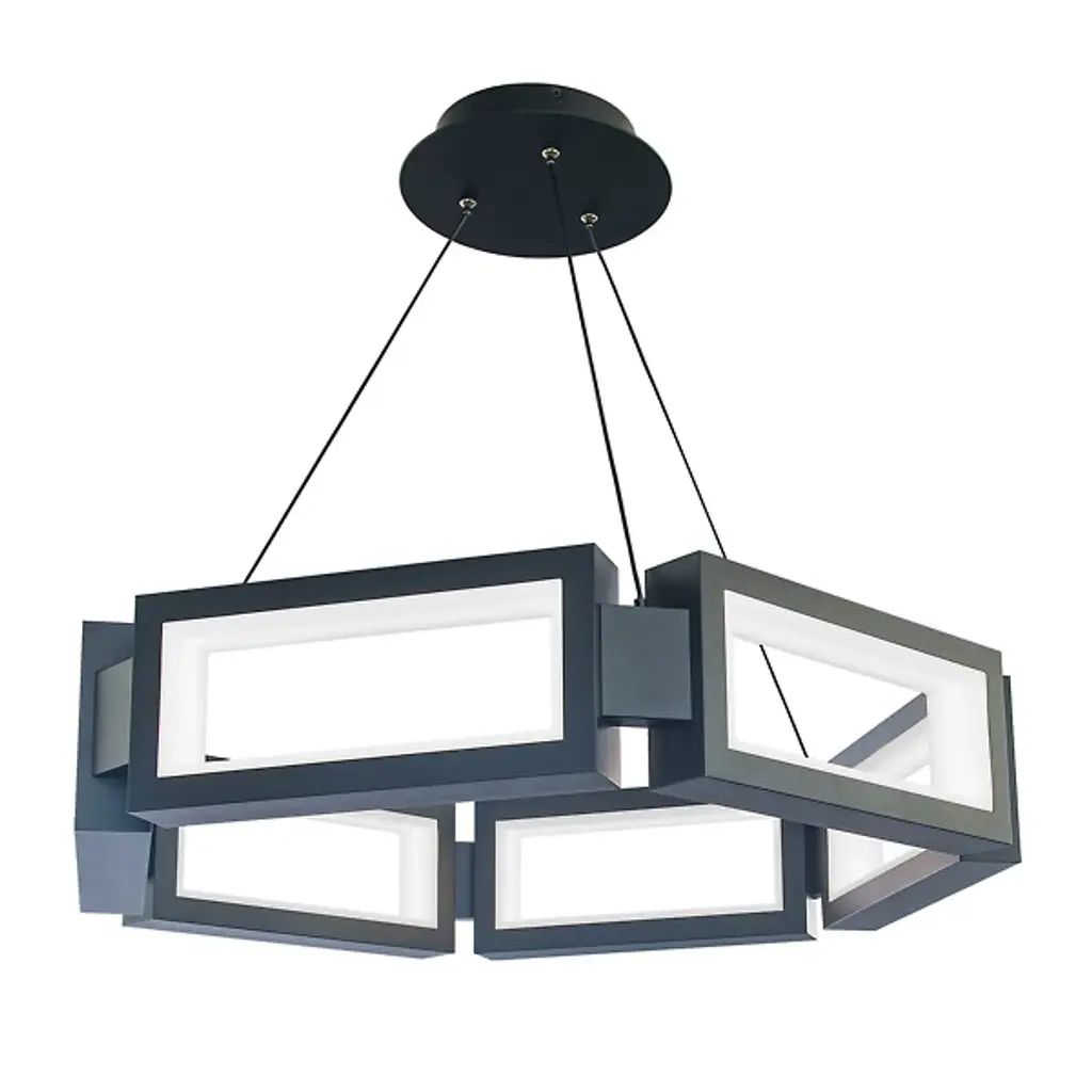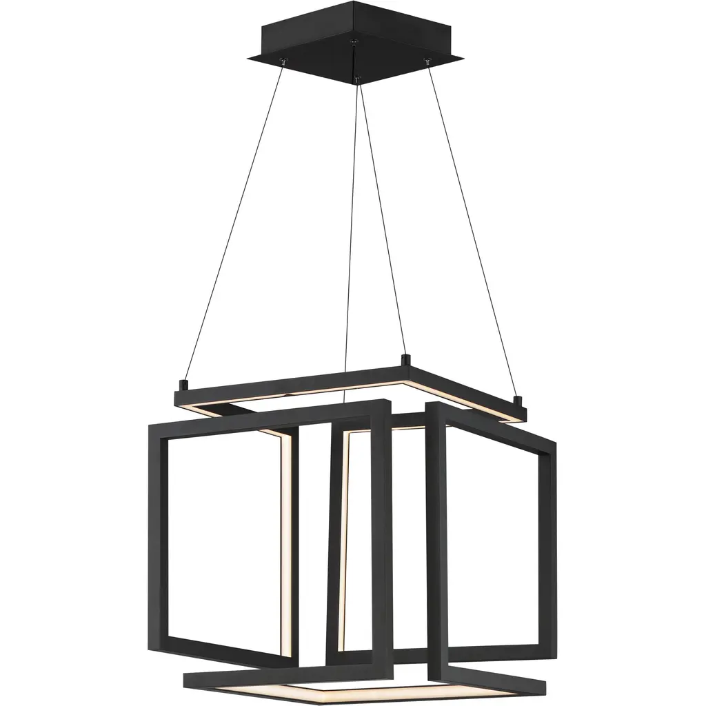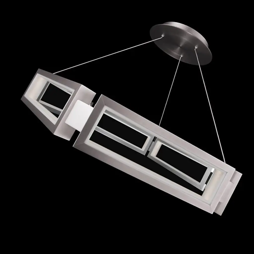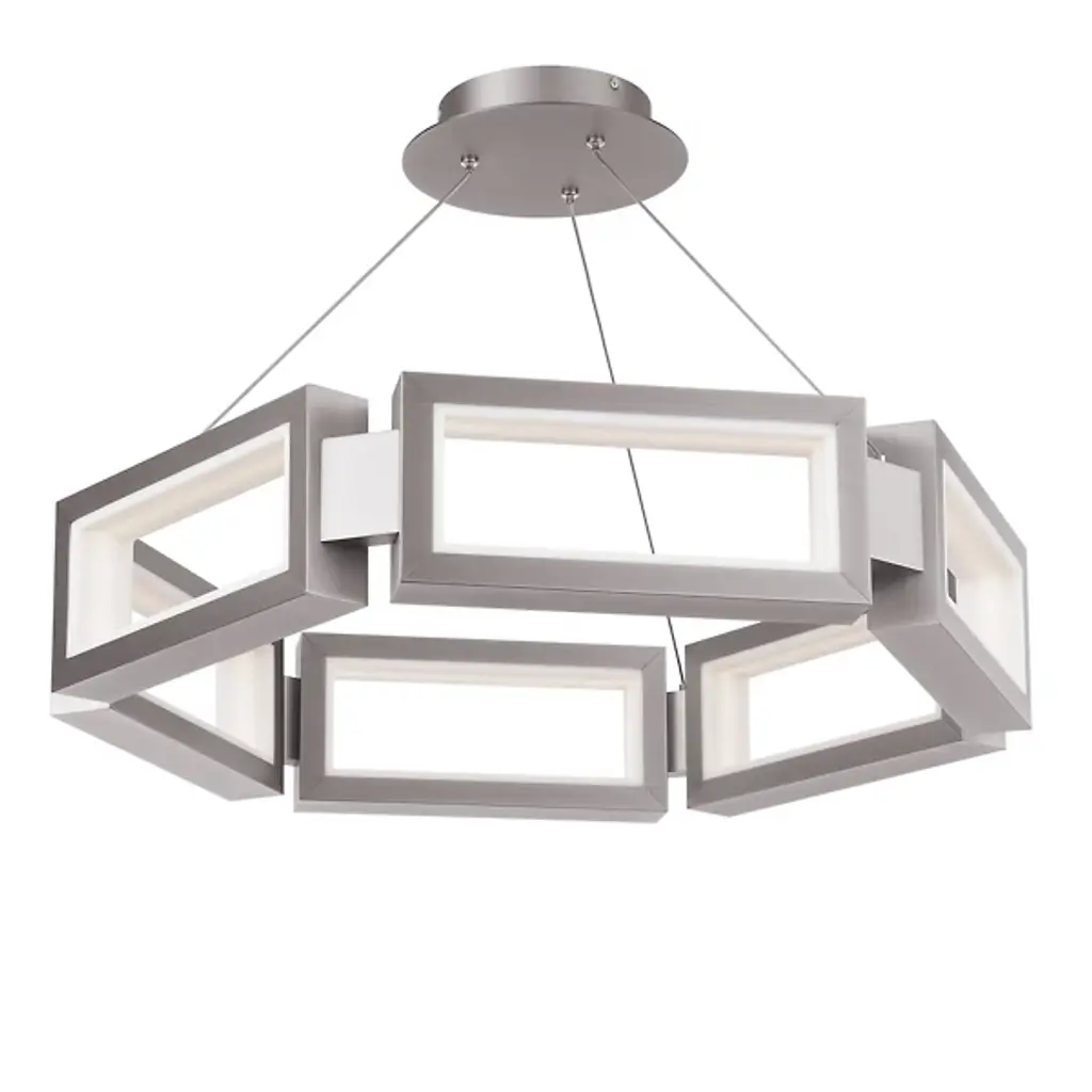 Geometry of light and style. The Mies LED Pendant by Modern Forms is an ode to Ludwig Mies van der Rohe, the pioneer of modern architecture. Aluminum rectangles encasing silica gel diffusers are linked together to form an open hexagonal design for an airy, symmetrical look. The diffusers house energy-efficient LEDs that cast ambient light over an expansive space. This stunning display of art is suspended from a round ceiling canopy with aircraft cables. Install it in your living space, dining room, or bedroom to infuse an air of drama.