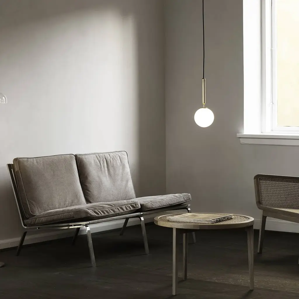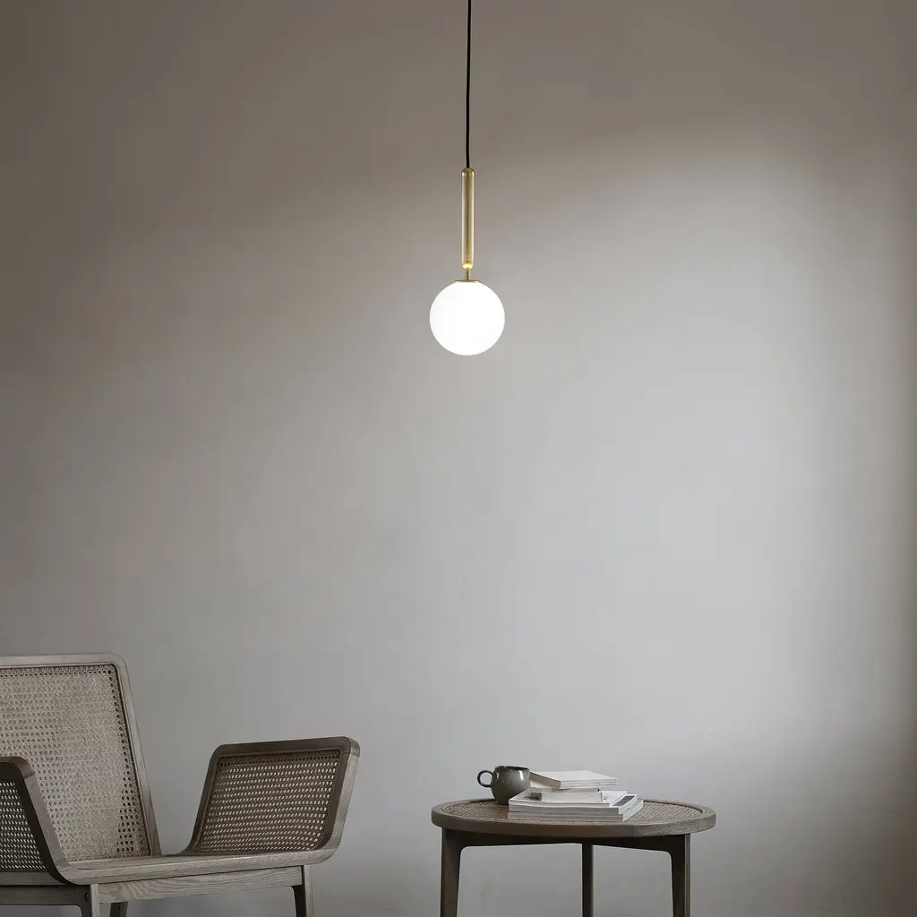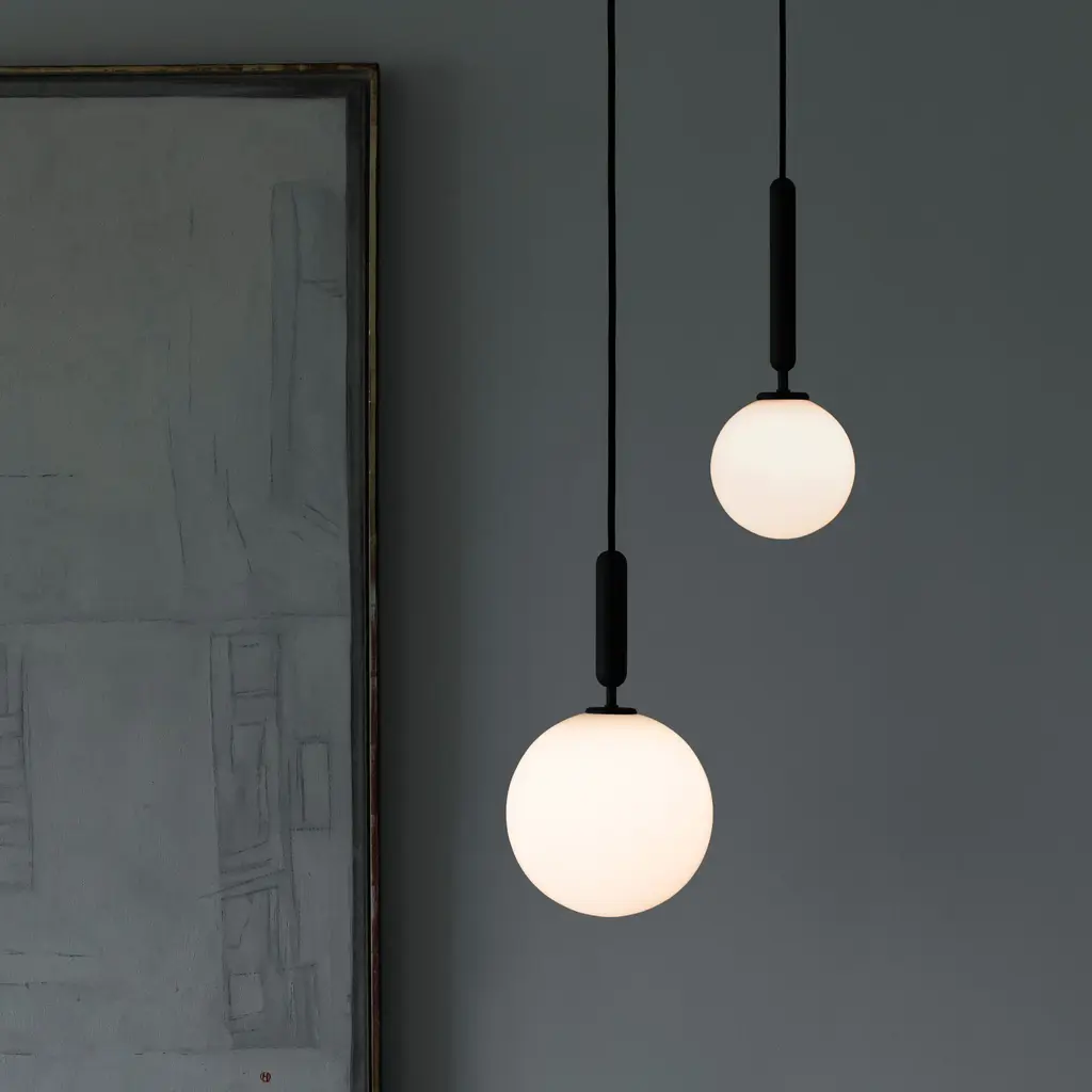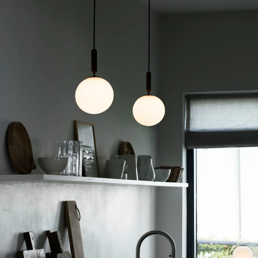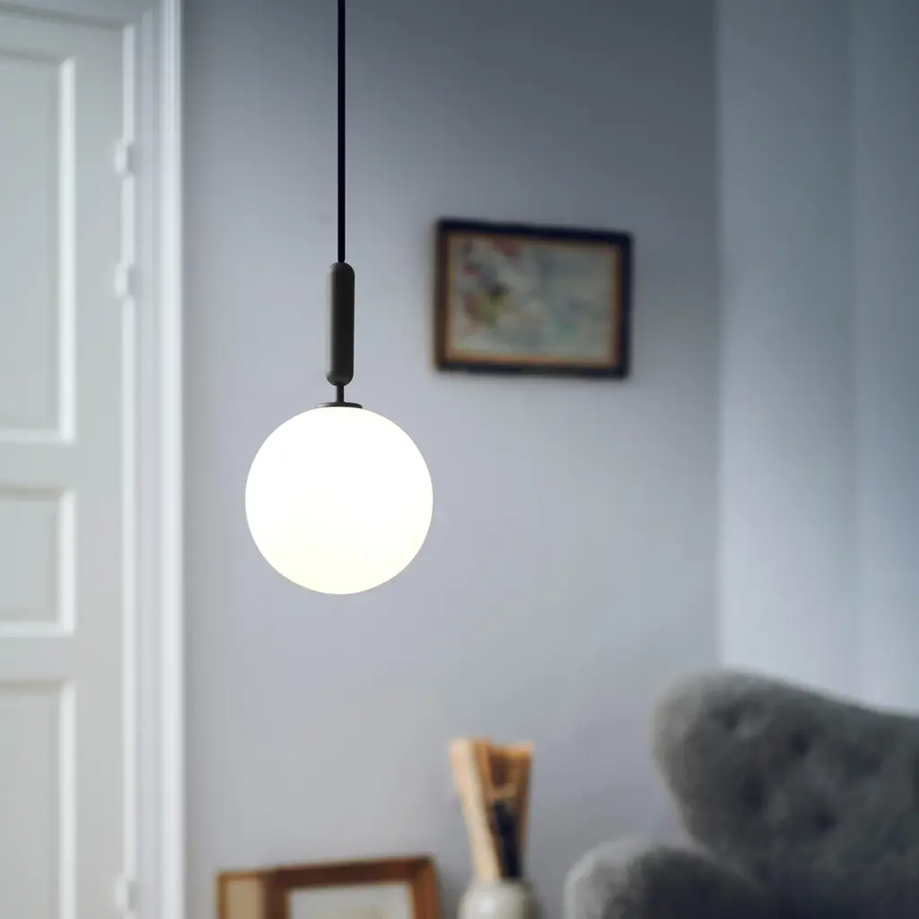 With its emphasis on a singular mouth-blown glass globe light, this simple pendant reveals the Miira collection's design motif. The mouth-blown shape, in either milky opal glass or clear glass with a unique embossed pattern, distills the timeless Nordic sense of elegance and devotion to function. Danish design brand Nuura's award-winning designer Sofie Refer affixes the glowing light to a dark-grey minimal cylinder, emphasizing the warmly encompassing illumination.