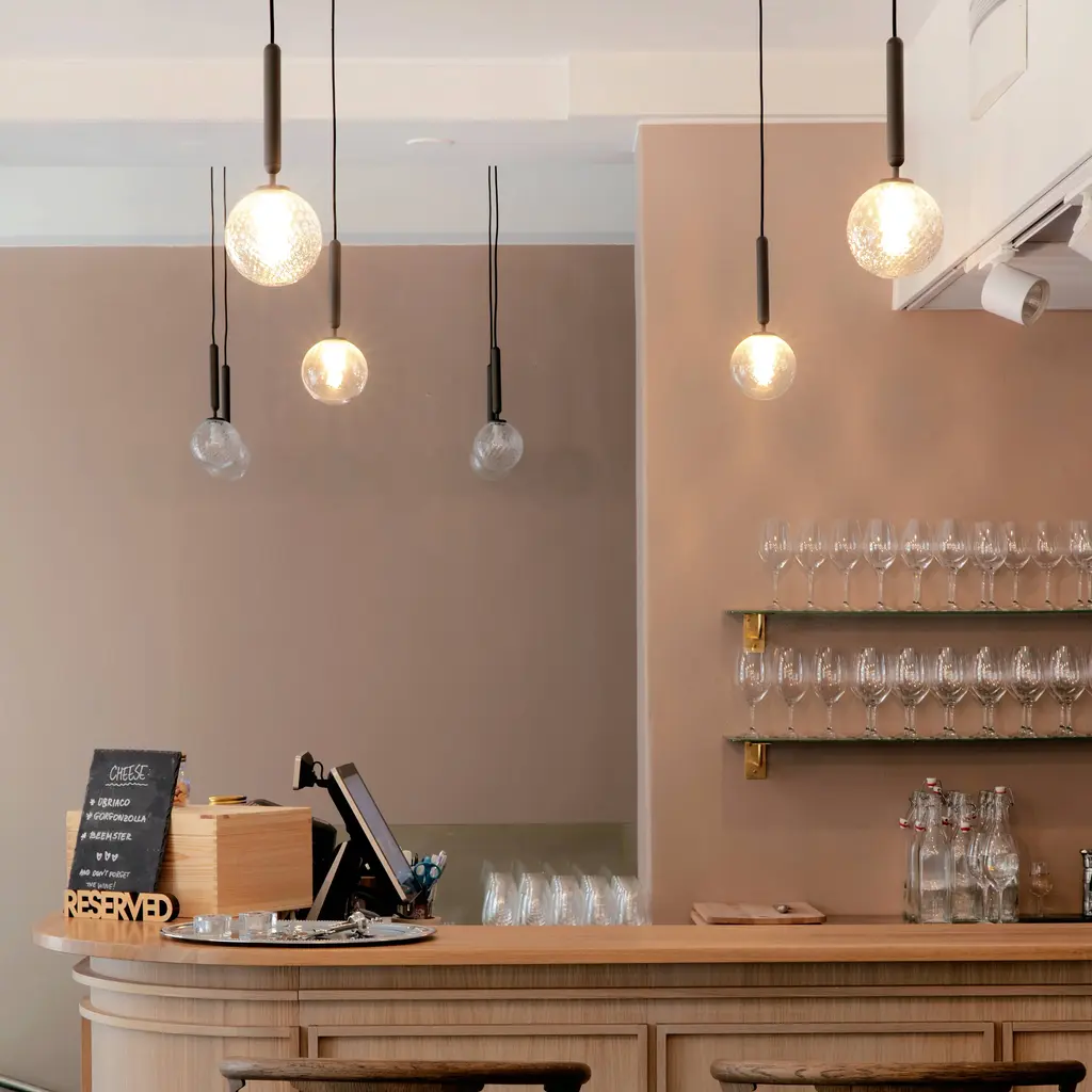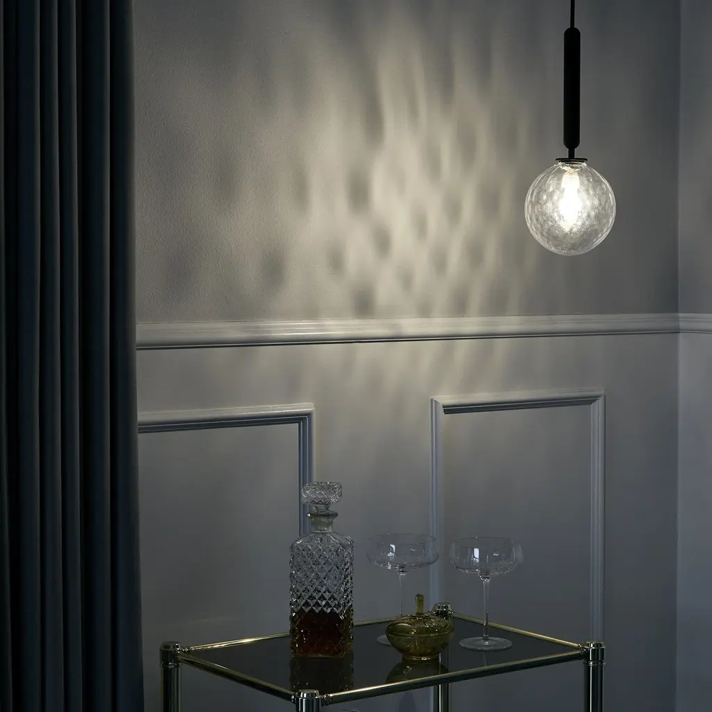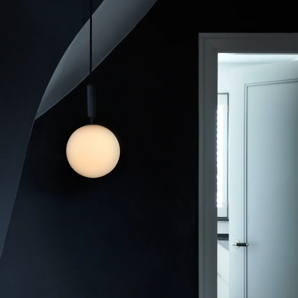 With its emphasis on a singular mouth-blown glass globe light, this simple pendant reveals the Miira collection's design motif. The mouth-blown shape, in either milky opal glass or clear glass with a unique embossed pattern, distills the timeless Nordic sense of elegance and devotion to function. Danish design brand Nuura's award-winning designer Sofie Refer affixes the glowing light to a dark-grey minimal cylinder, emphasizing the warmly encompassing illumination.
