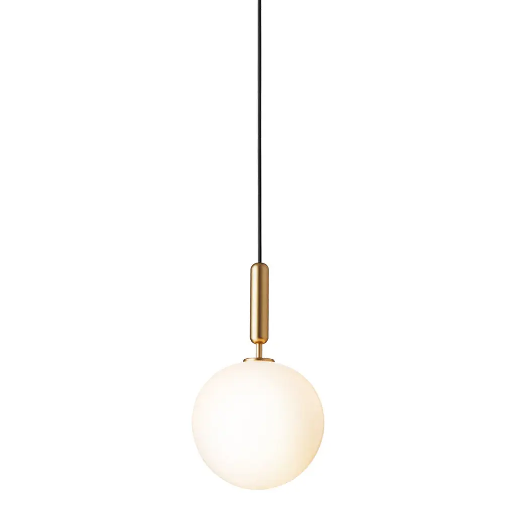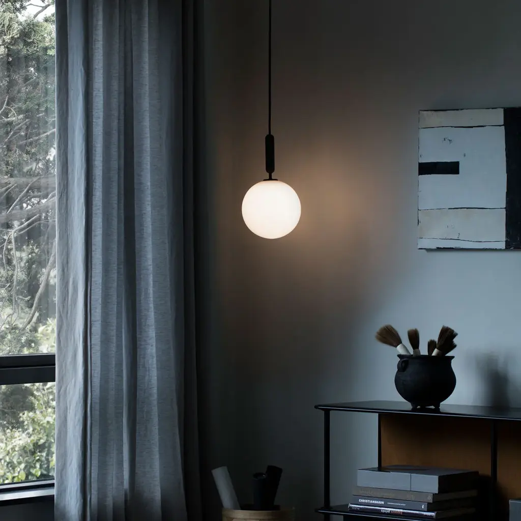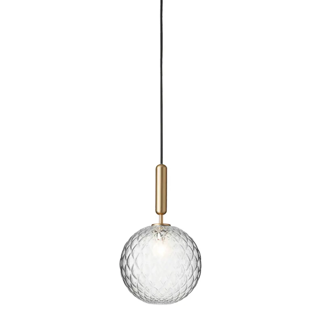 Miira 1 is a single pendant in a clear and clean expression. This Miira pendant is designed with a fabric covered cable and a slim metal stem ending with a mouth-blown glass in optic clear pattern. Miira 1 is ideal as a pendant on its own or as a series across the home.