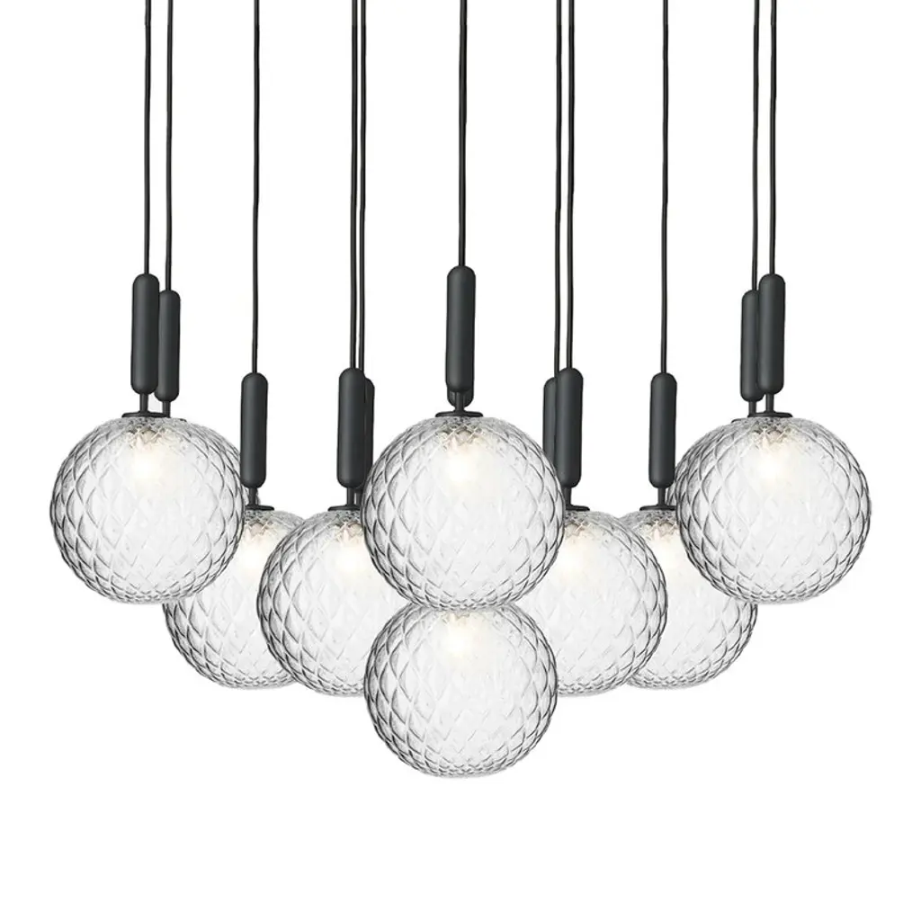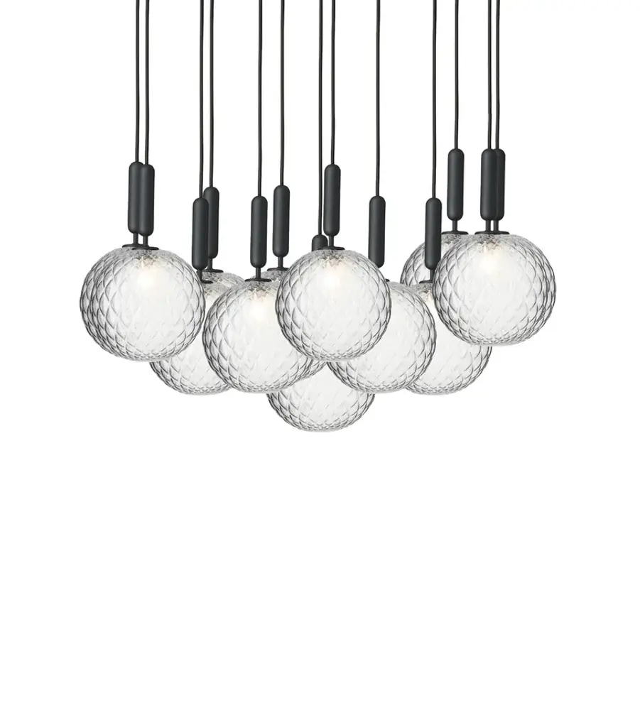Miira 13 Optic is a statement chandelier suitable for larger rooms and public spaces. The Chandelier can be customised in exclusive arrangement.Light source: Socket: G9 Max wattage: 7W LED Voltage (V): 220-240V / 120VMiira is a series of lamps in a simple and timeless design which embraces the Nordic elegance and function. The neatly mouth-blown glass and stylish processed metal give the design balance and depth. The Optic Clear glass with the unique embossed pattern give a playful light and spreads a unique atmosphere to the room the lamp is placed in.Soft Nordic light shines from the Opal White glass and spreads a unique atmosphere to the room the lamp placed in.