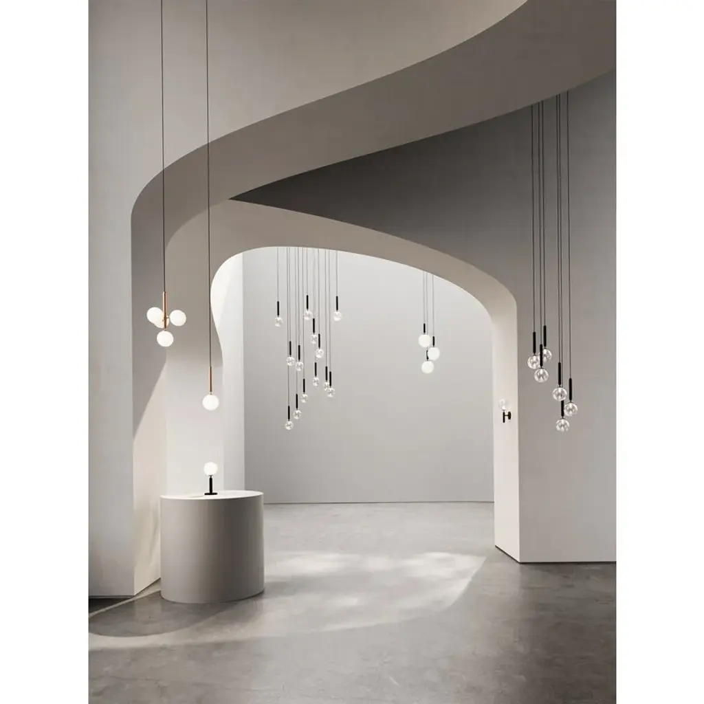 The Miira 3 pendant lamp by the Danish brand Nuura catches the eye with a group of three hanging, embossed glass domes that cast an atmospheric light, with the elegant metal bases adding a considered contrast to the design. The Miira 3 pendant has a total width of 12.99 x 0 in (33 x cm, cm), and the wire system allows you to adjust the height of each glass dome up to 98.43 x 0 in (250 x cm. cm). Created by the awarded lighting designer Sofie Refer, the lamps of the Miira collection combine timeless Scandinavian design with fresh, modern minimalism that easily fits into domestic settings as well as public environments. The round glass shades filter the light in a smooth, harmonious way, and make for the most essential element of the Miira luminaire.